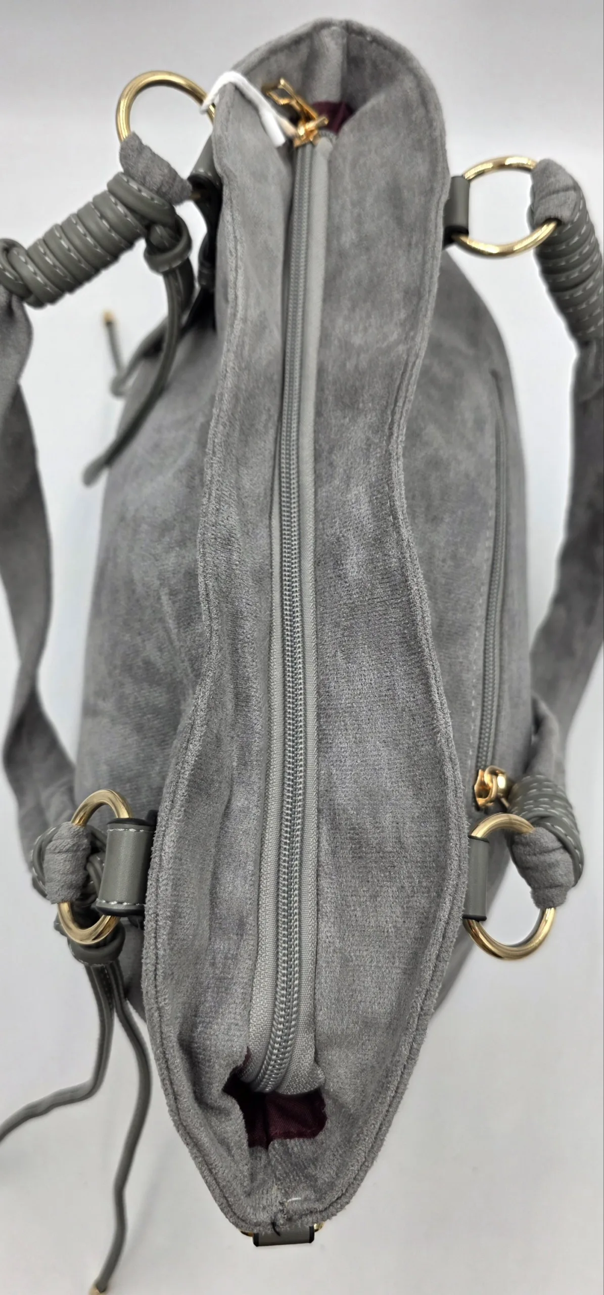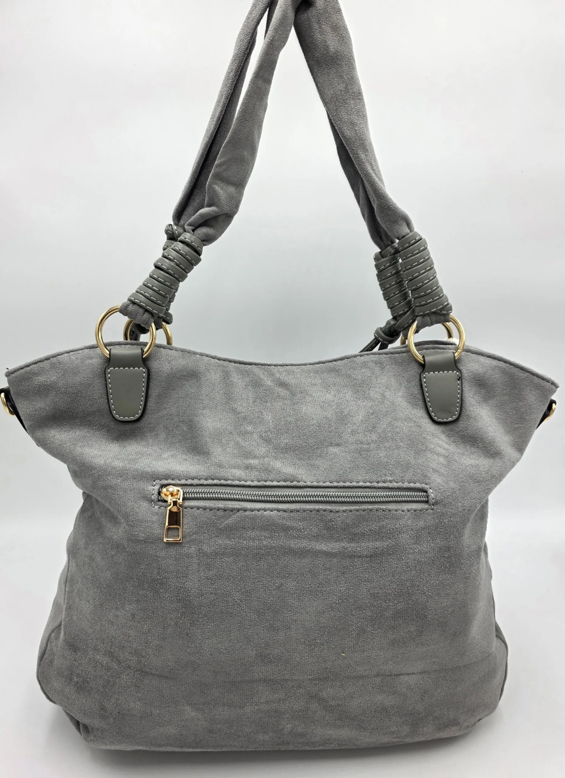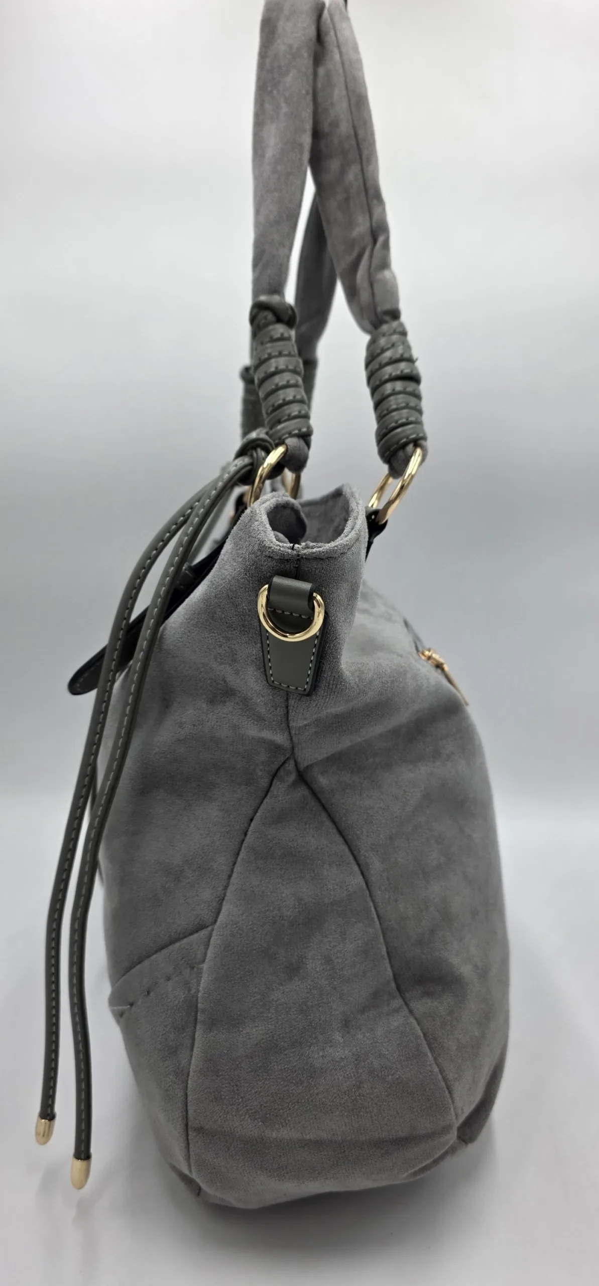 Голяма чанта от еко велур с две дръжки 57см,външен заден джоб с цип, закопчаване с цип, вътре със средна преграда с цип, джоб с цип и допълнителни джобове за телефон, допълнителна дълга регулираща се дръжка 150см. Ширина 42см,височина 32см,дъно 34см/12см.