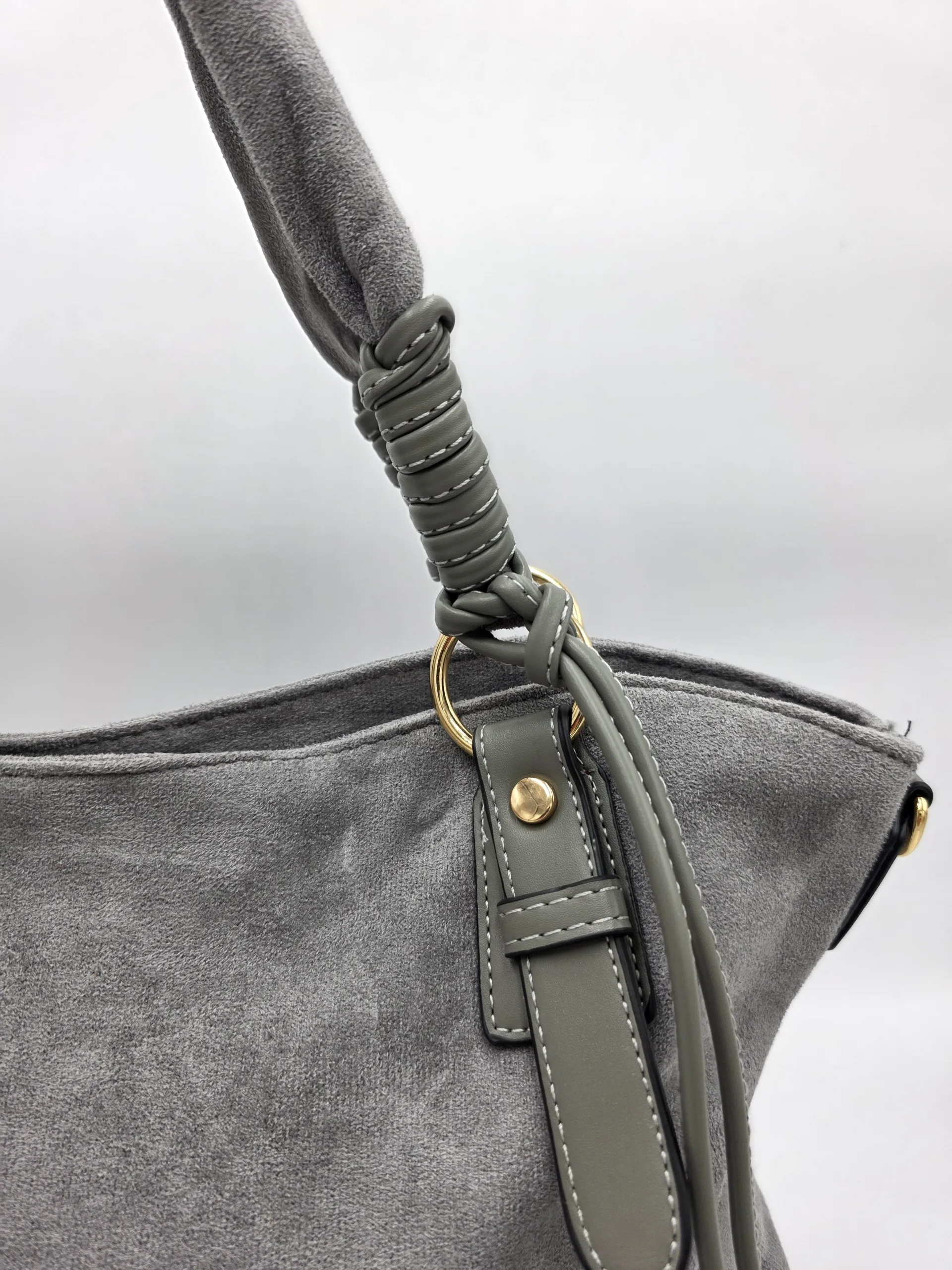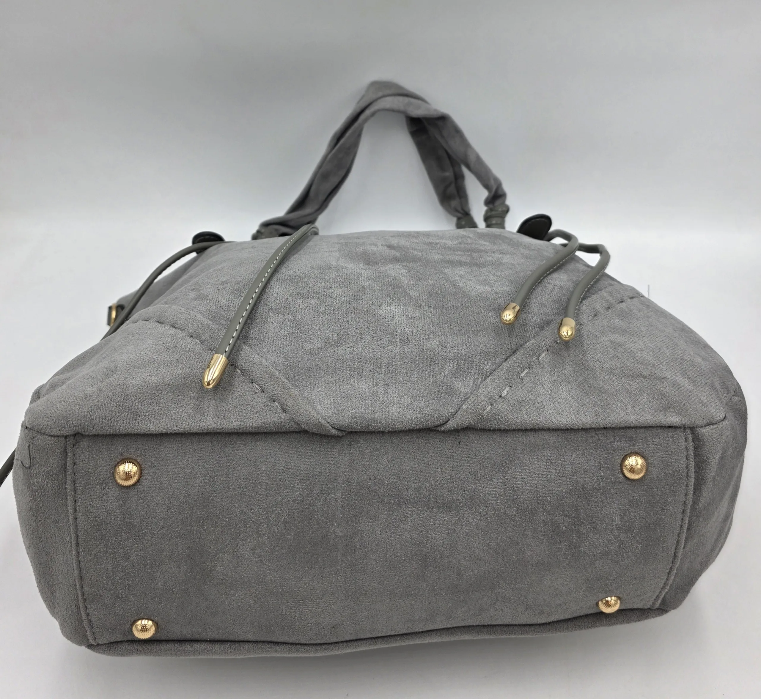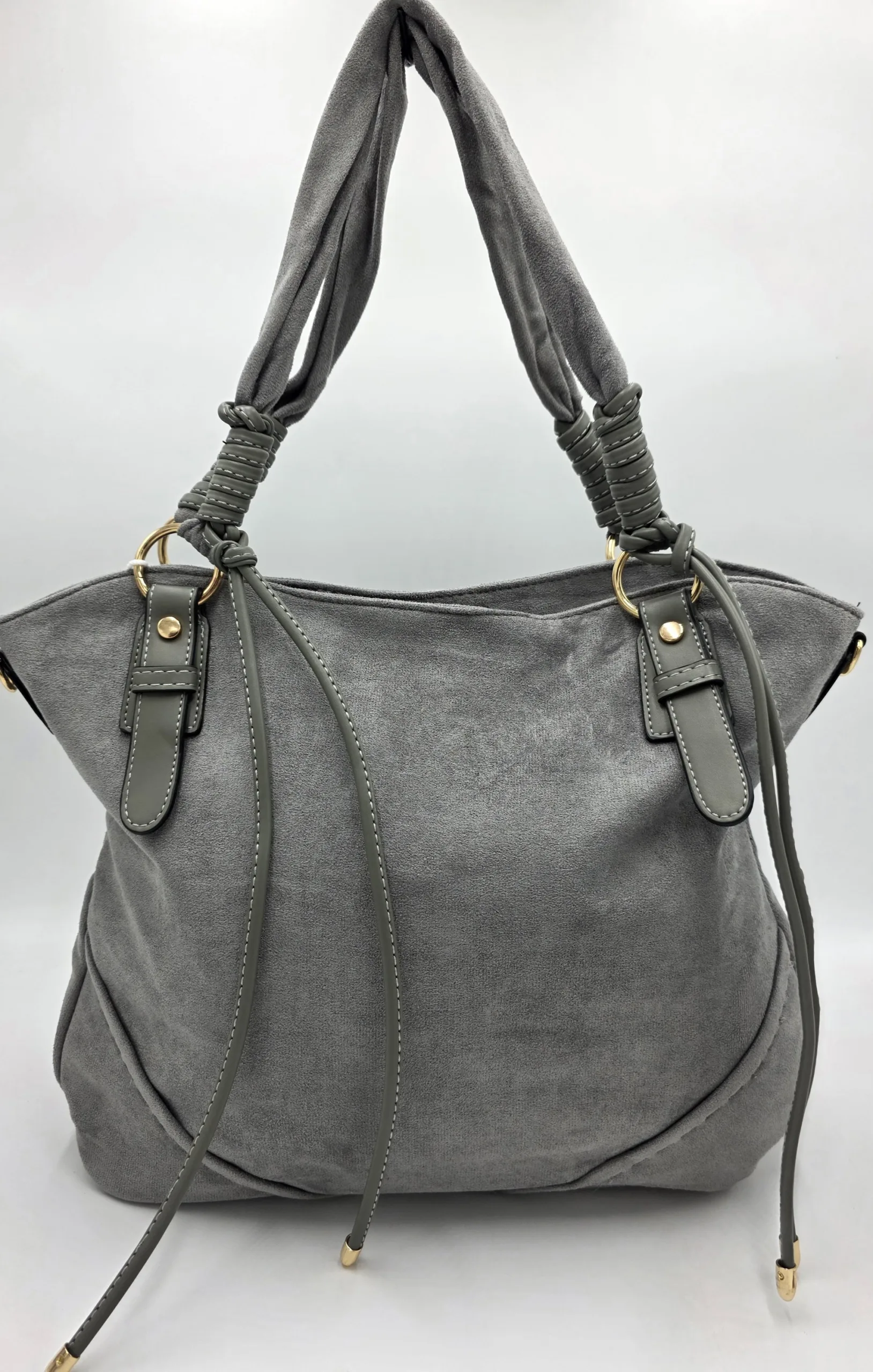 Голяма чанта от еко велур с две дръжки 57см,външен заден джоб с цип, закопчаване с цип, вътре със средна преграда с цип, джоб с цип и допълнителни джобове за телефон, допълнителна дълга регулираща се дръжка 150см. Ширина 42см,височина 32см,дъно 34см/12см.