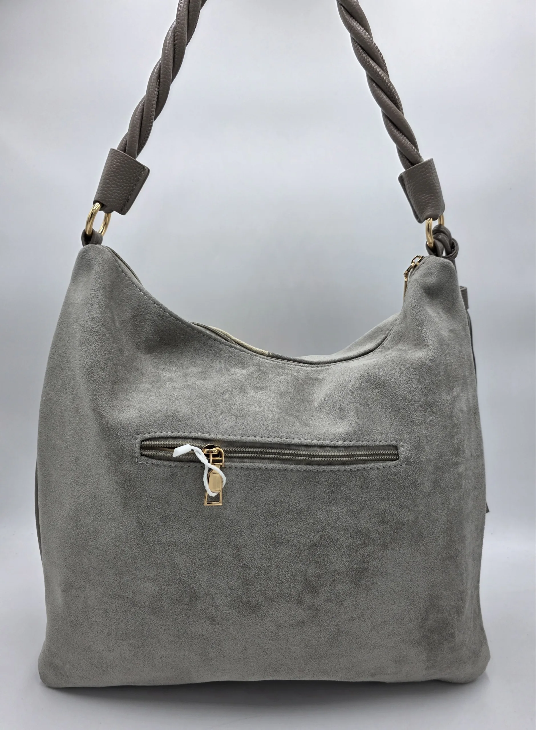 Чанта от еко велур с една дръжка 58см, допълнителна дълга регулираща се дръжка 150см, външен заден джоб с цип, закопчаване с цип, вътре със прикачена преграда с цип към задната част, джоб с цип, допълнителни джобове за телефон, ширина 37см,височина 35см,без оформено дъно.