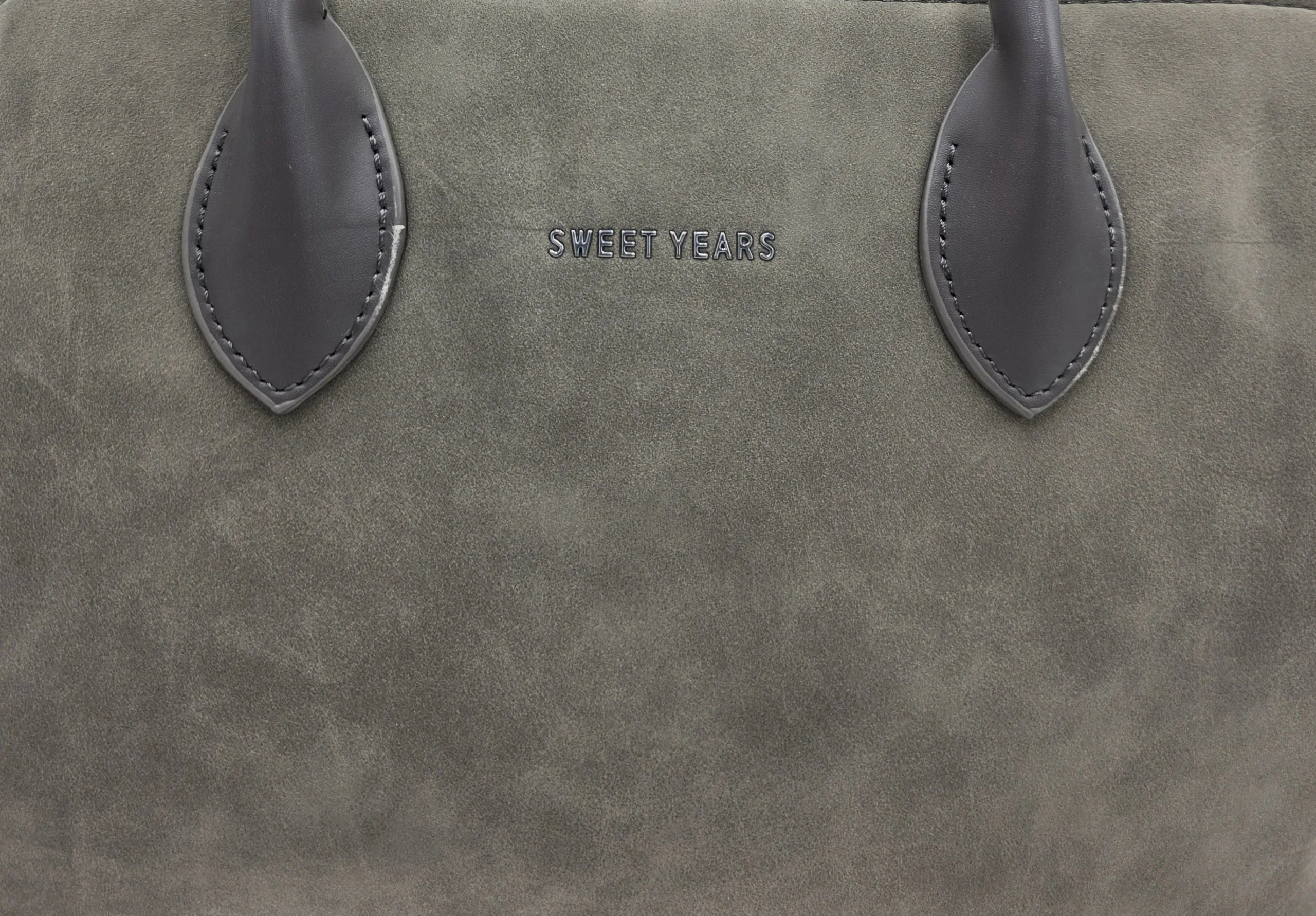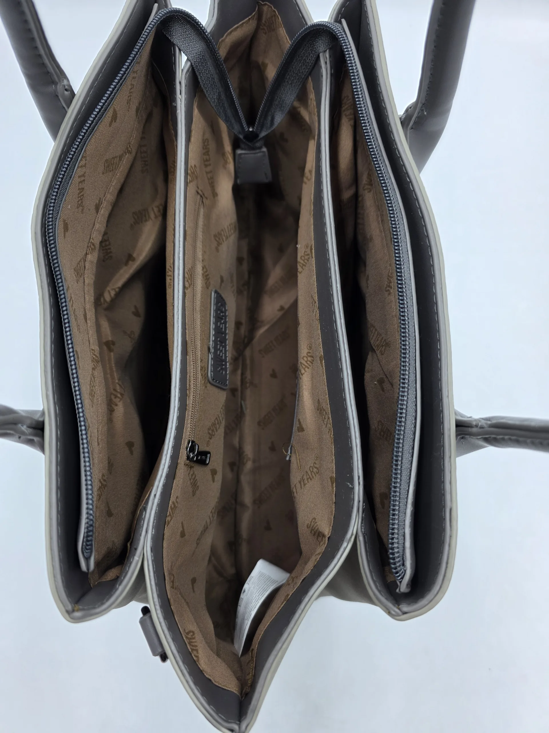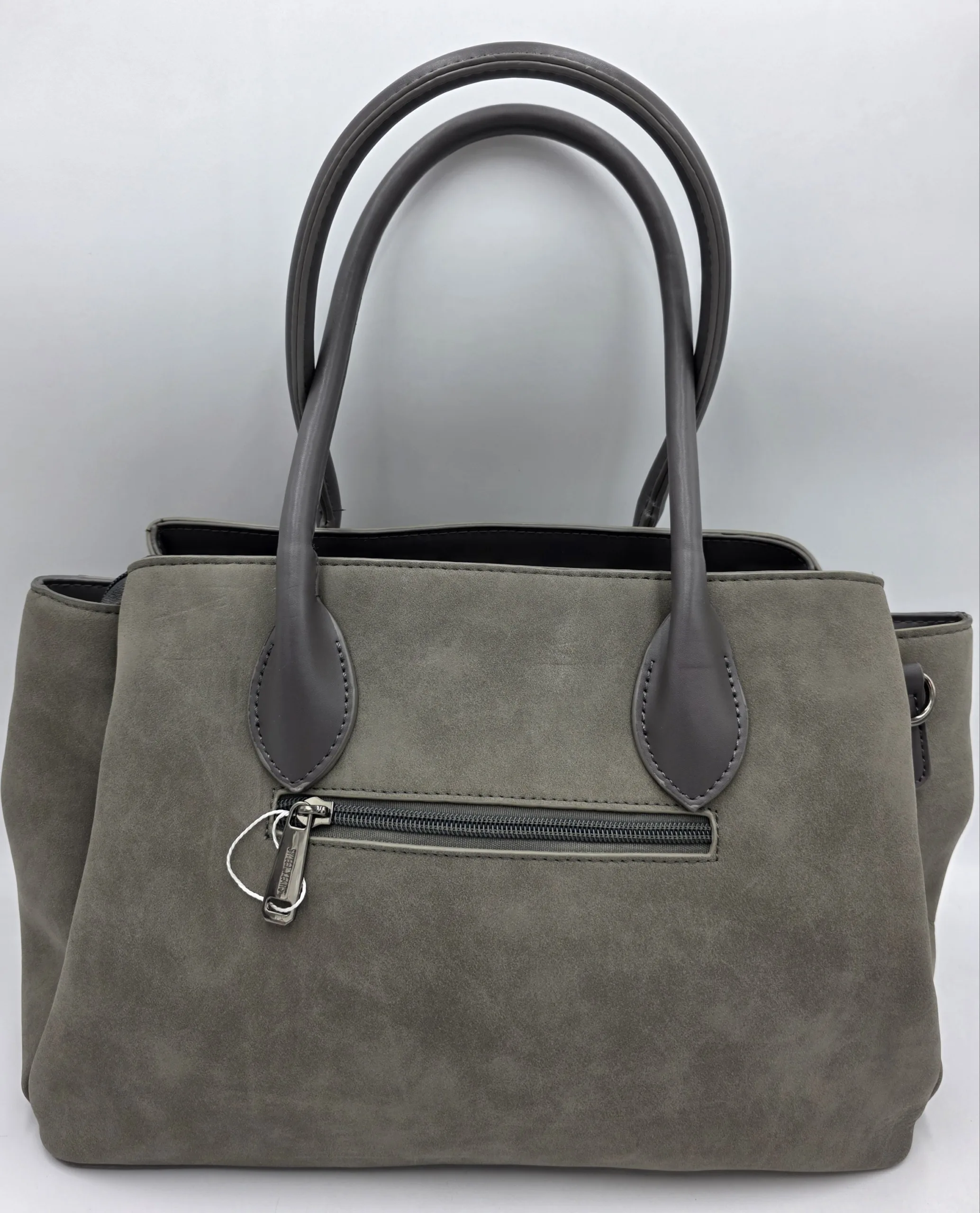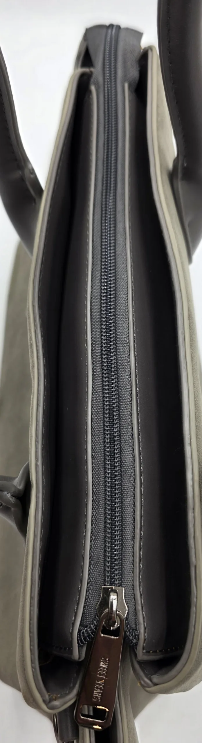 Елегантна чанта от еко набук с две дръжки 50см и допълнителна регулираща се дръжка 150см, с външен заден джоб с цип, три отделни прегради затварящи се с общ цип. Ширина 45см/височина 25см, дъно 34см/13см.