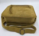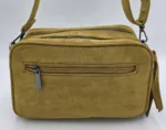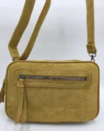 Чанта за през рамо от еко велур с две отделни прегради затварящи се с цип, два външни джоба с цип, вътрешен джоб с цип и допълнителни джобове за телефон, дълга регулираща се 150см,.Ширина 25см, височина 17см,дъно 25см/9см.