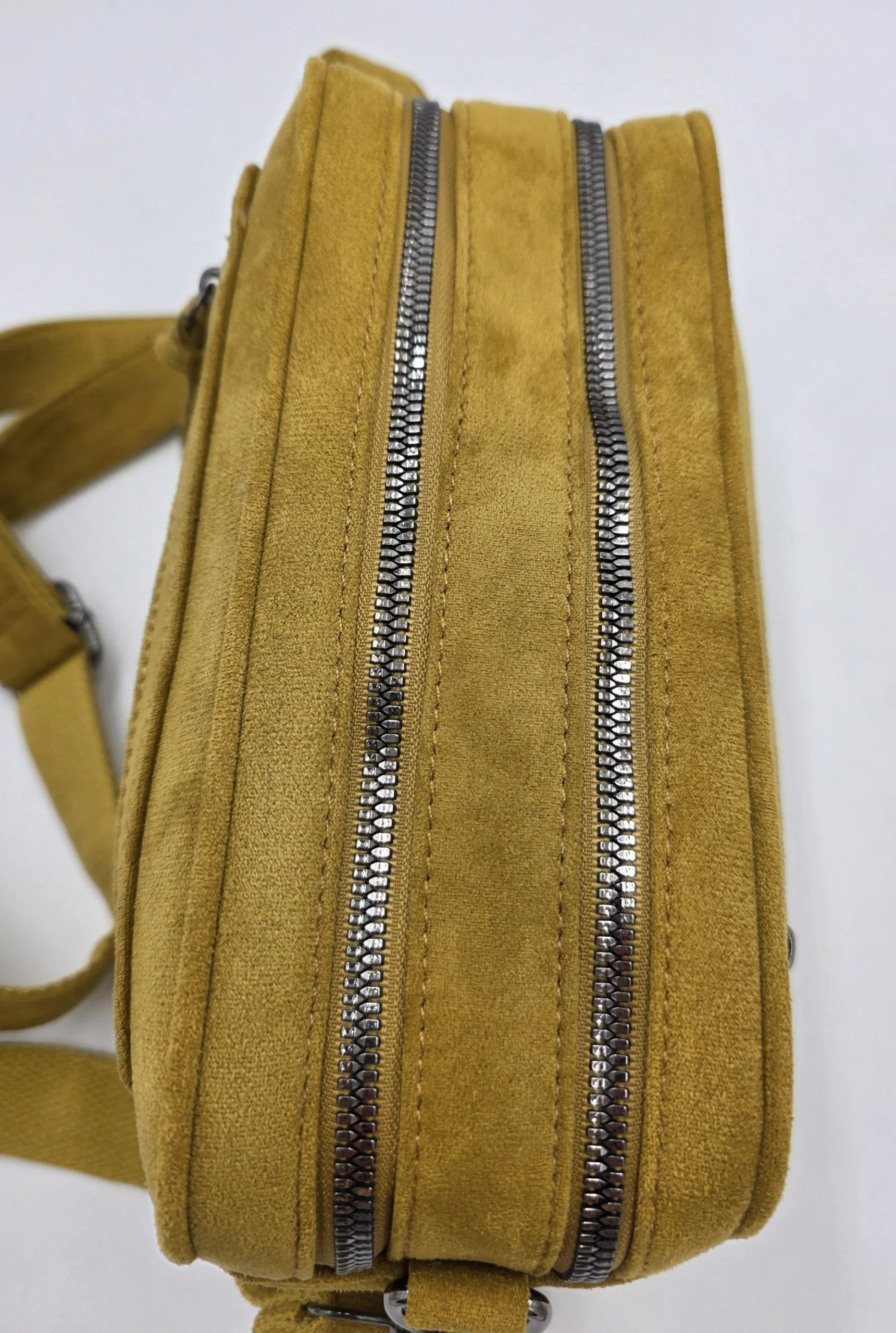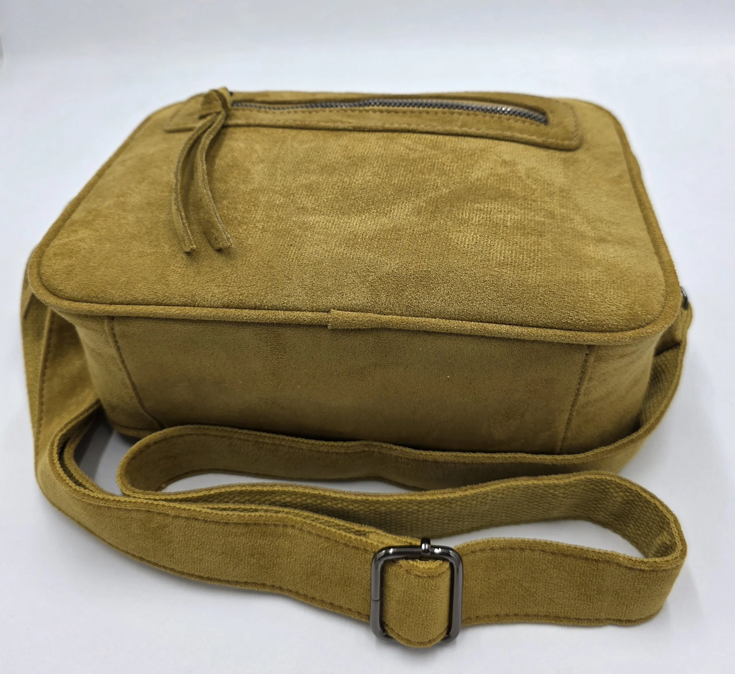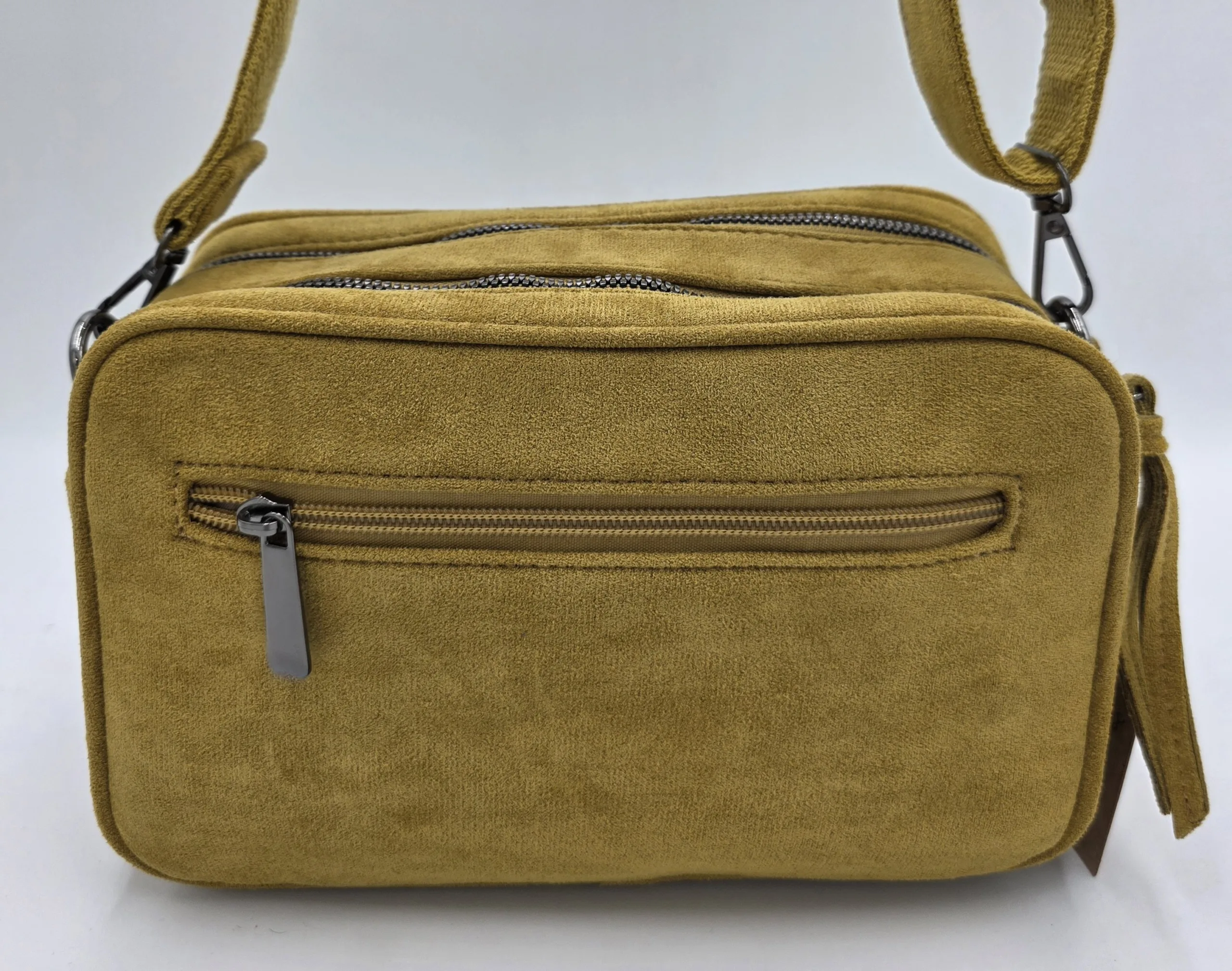 Чанта за през рамо от еко велур с две отделни прегради затварящи се с цип, два външни джоба с цип, вътрешен джоб с цип и допълнителни джобове за телефон, дълга регулираща се 150см,.Ширина 25см, височина 17см,дъно 25см/9см.