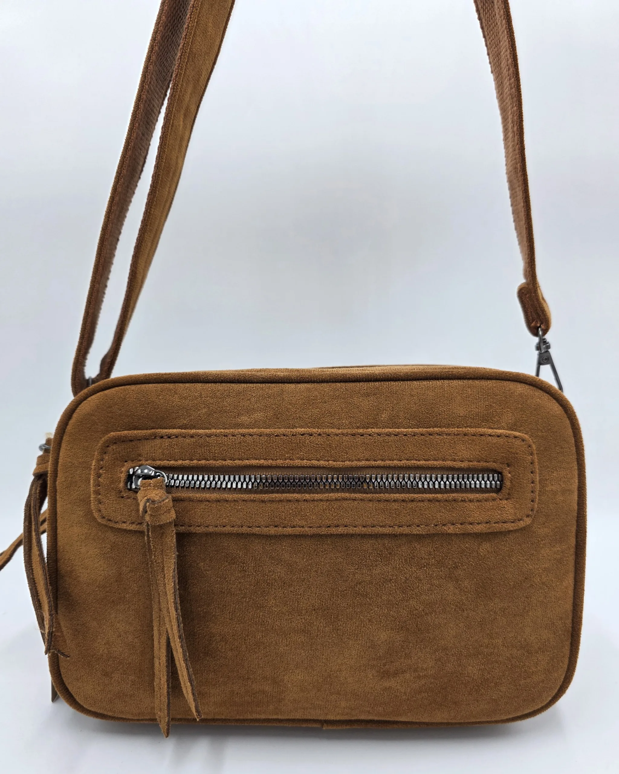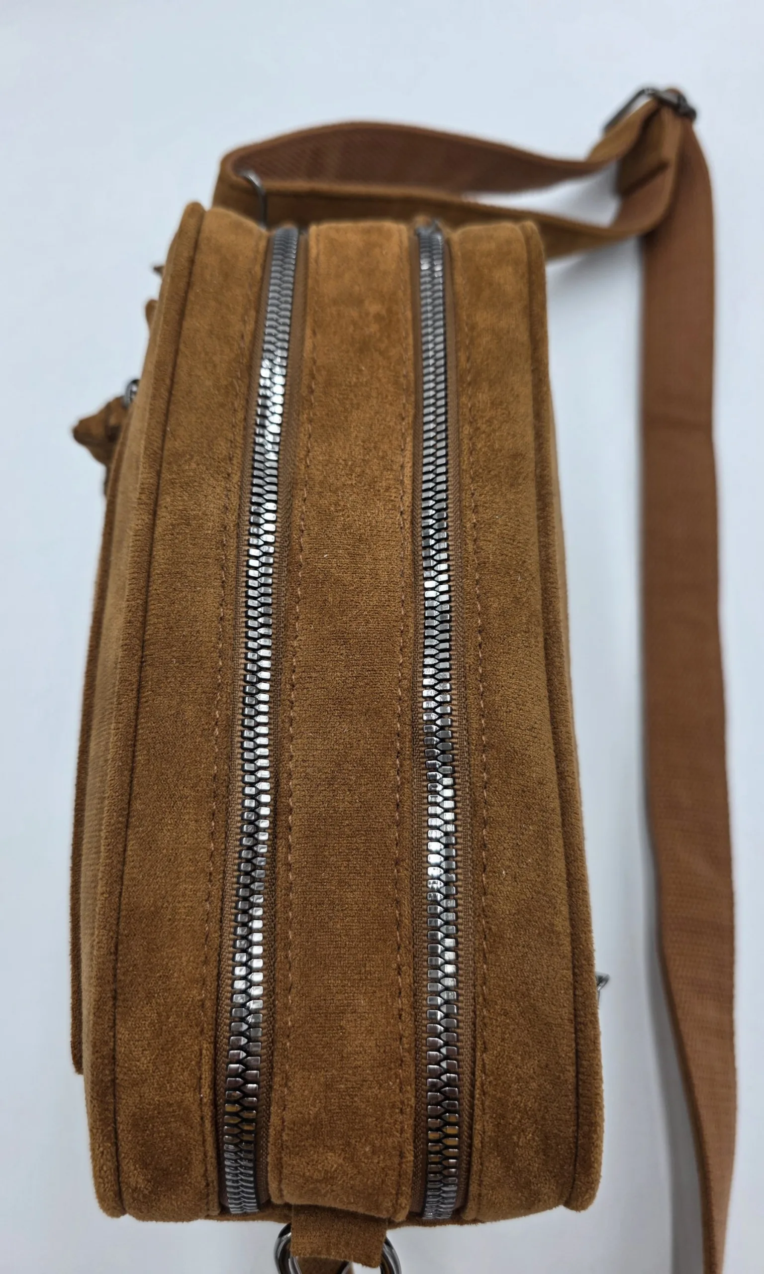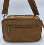 Чанта за през рамо от еко велур с две отделни прегради затварящи се с цип, два външни джоба с цип, вътрешен джоб с цип и допълнителни джобове за телефон, дълга регулираща се 150см,.Ширина 25см, височина 17см,дъно 25см/9см.
