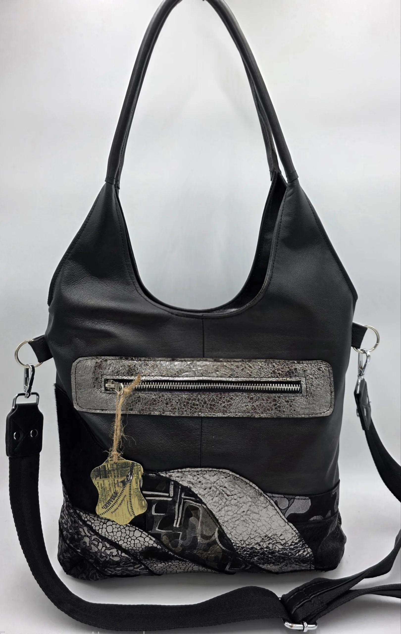 Чанта ръчна изработка от естествена кожа с две дръжки 65см и допълнителна дълга регулираща се дръжка 150см, с външен заден джоб с цип 20см,вътре със средна преграда с цип ,вътрешен джоб с цип и допълнителен джоб за телефон. Ширина 32см,височина 30см,без оформено дъно