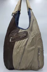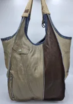 Уникална голяма чанта от естествена кожа ръчна изработка, тип торба от рециклирани материали естествена кожа и деним,без закопчаване, множество удобни джобове, вътрешен джоб с цип ,две дръжки 55см,ширина 57см,височина 42см,меко дъно 32см/22см