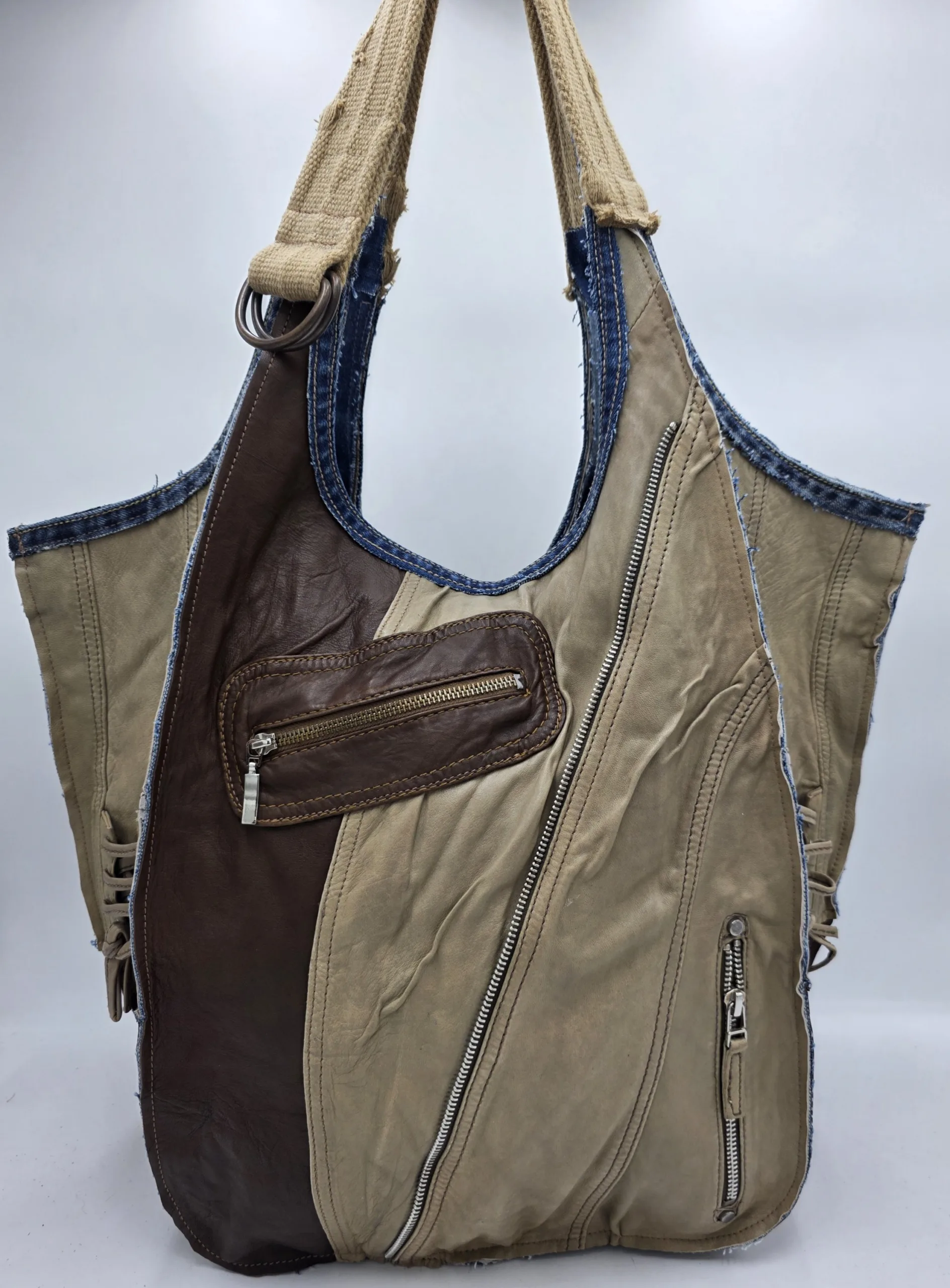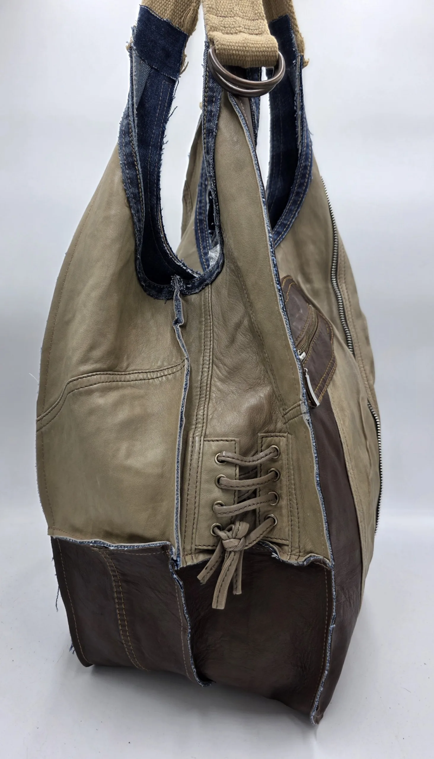Уникална голяма чанта от естествена кожа ръчна изработка, тип торба от рециклирани материали естествена кожа и деним,без закопчаване, множество удобни джобове, вътрешен джоб с цип ,две дръжки 55см,ширина 57см,височина 42см,меко дъно 32см/22см
