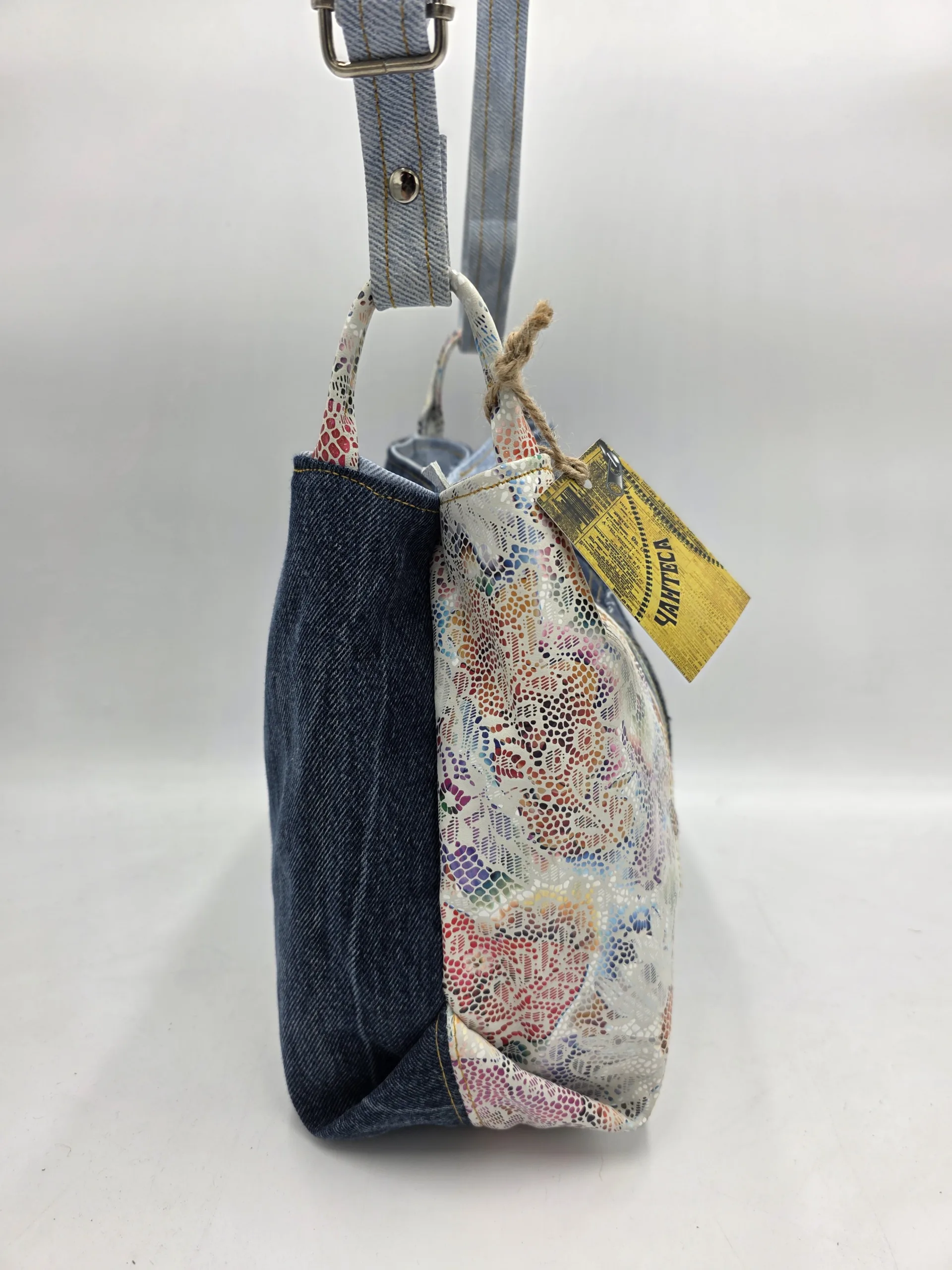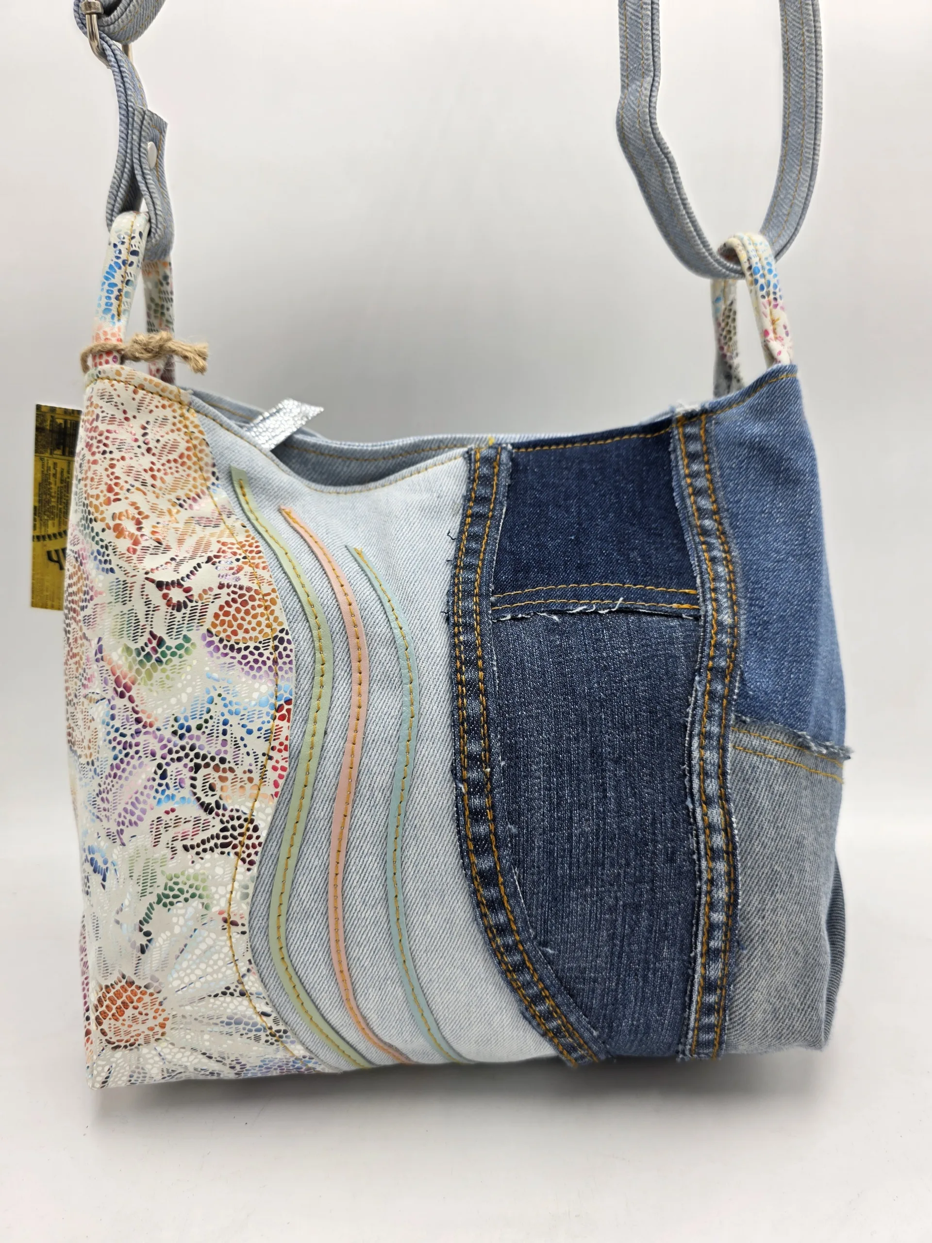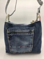 Ръчно изработена чанта от естествена кожа и рециклиран деним с две отделни прегради, заден джоб+вътрешен с цип и отделение за телефон. Вис 23см,ширина 26см,дъно 13/26. Дължина на регулираща се дръжка 150см