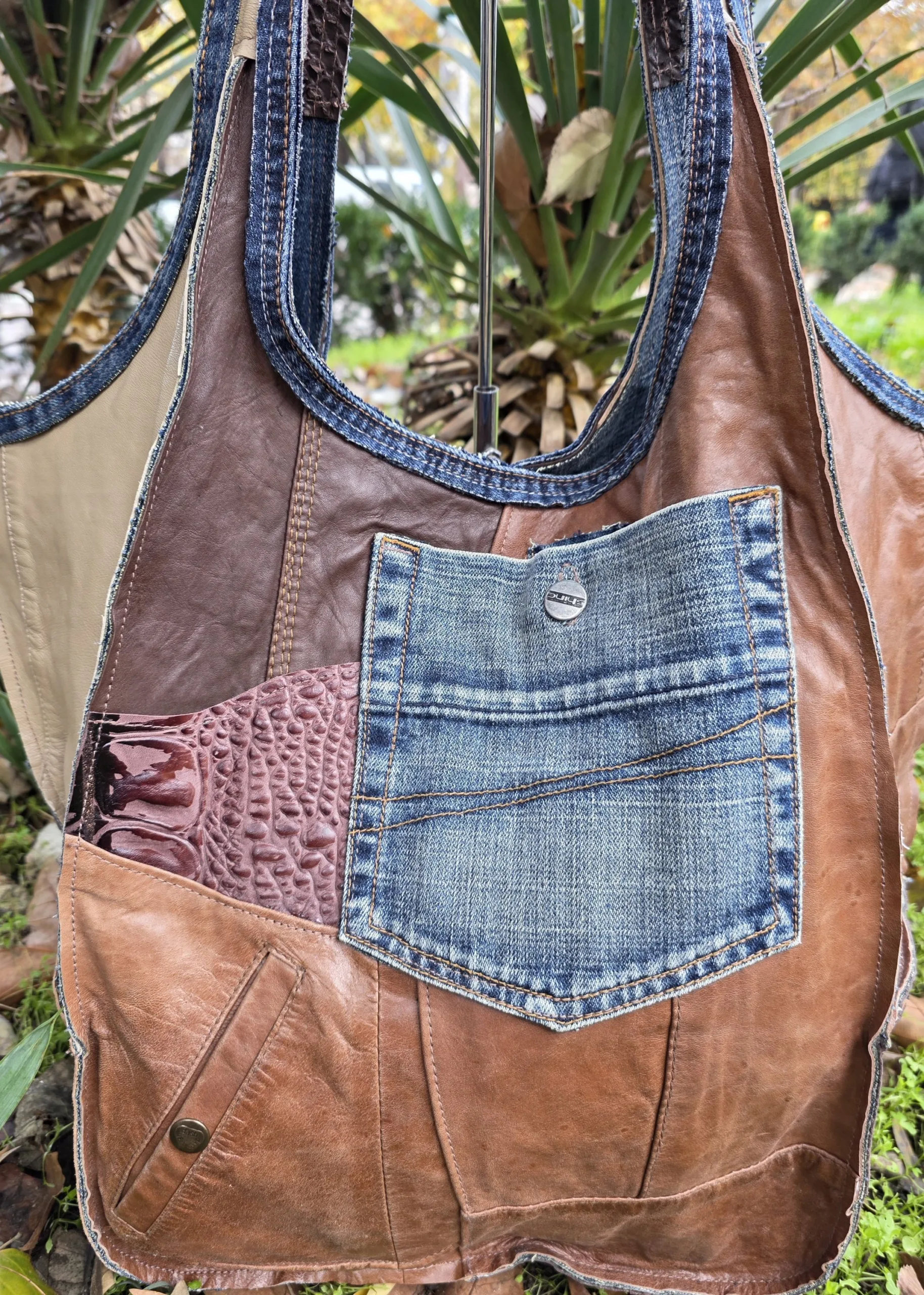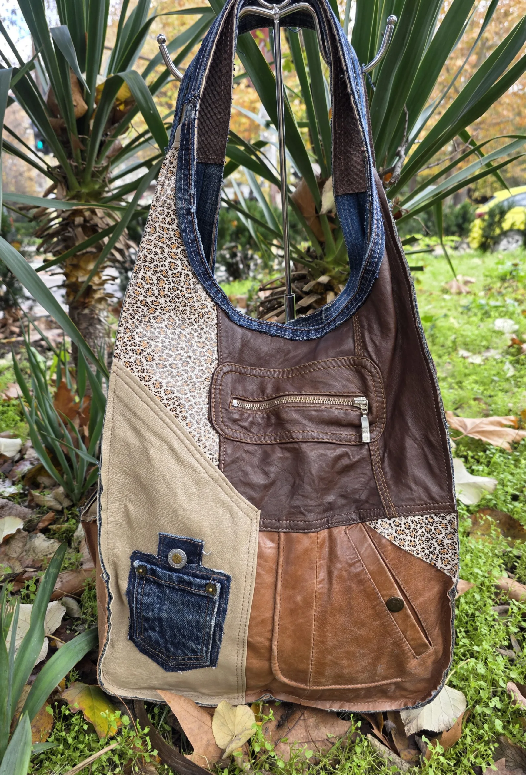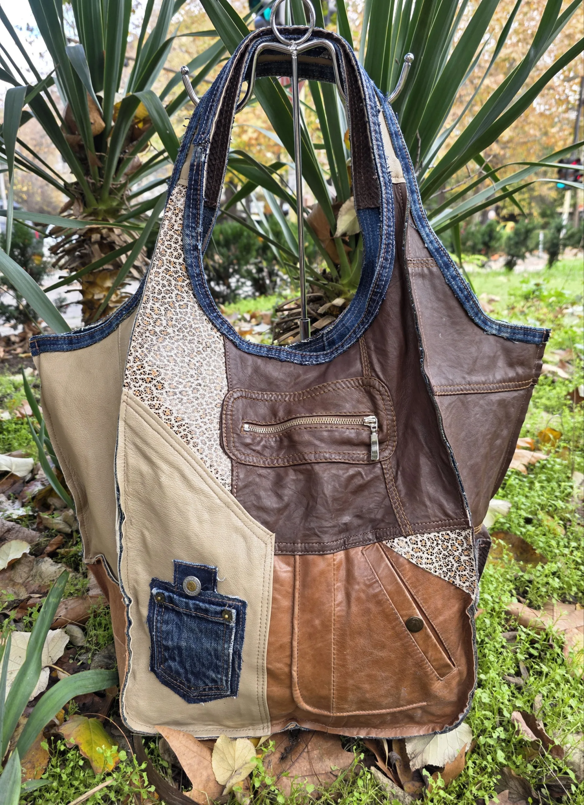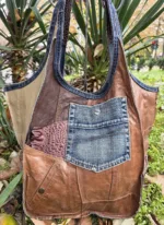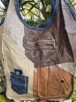 Уникална голяма чанта от естествена кожа ръчна изработка, тип торба от рециклирани материали естествена кожа и деним,без закопчаване, множество удобни джобове, вътрешен джоб с цип ,две дръжки 55см,ширина 57см,височина 42см,меко дъно 32см/22см
