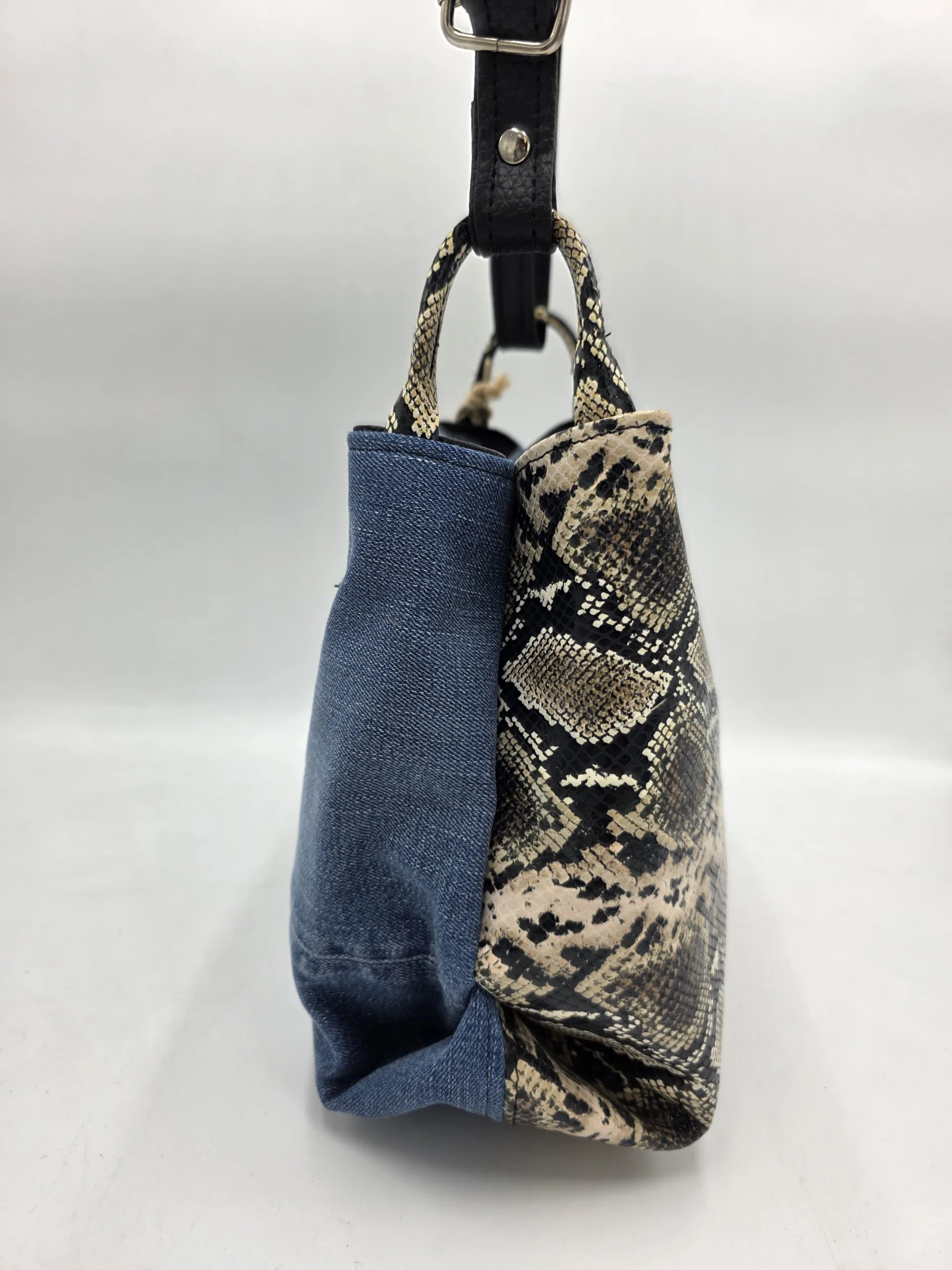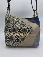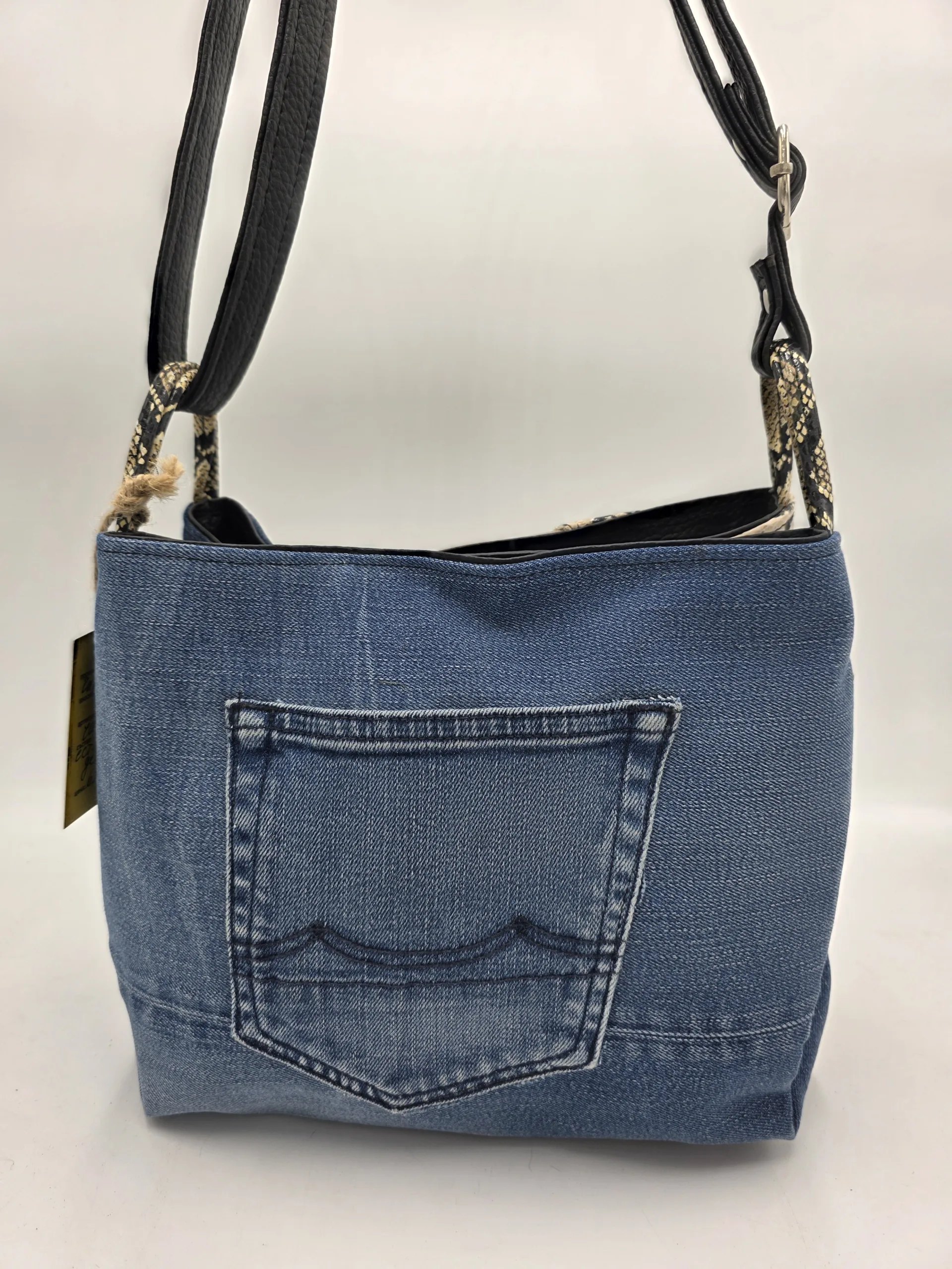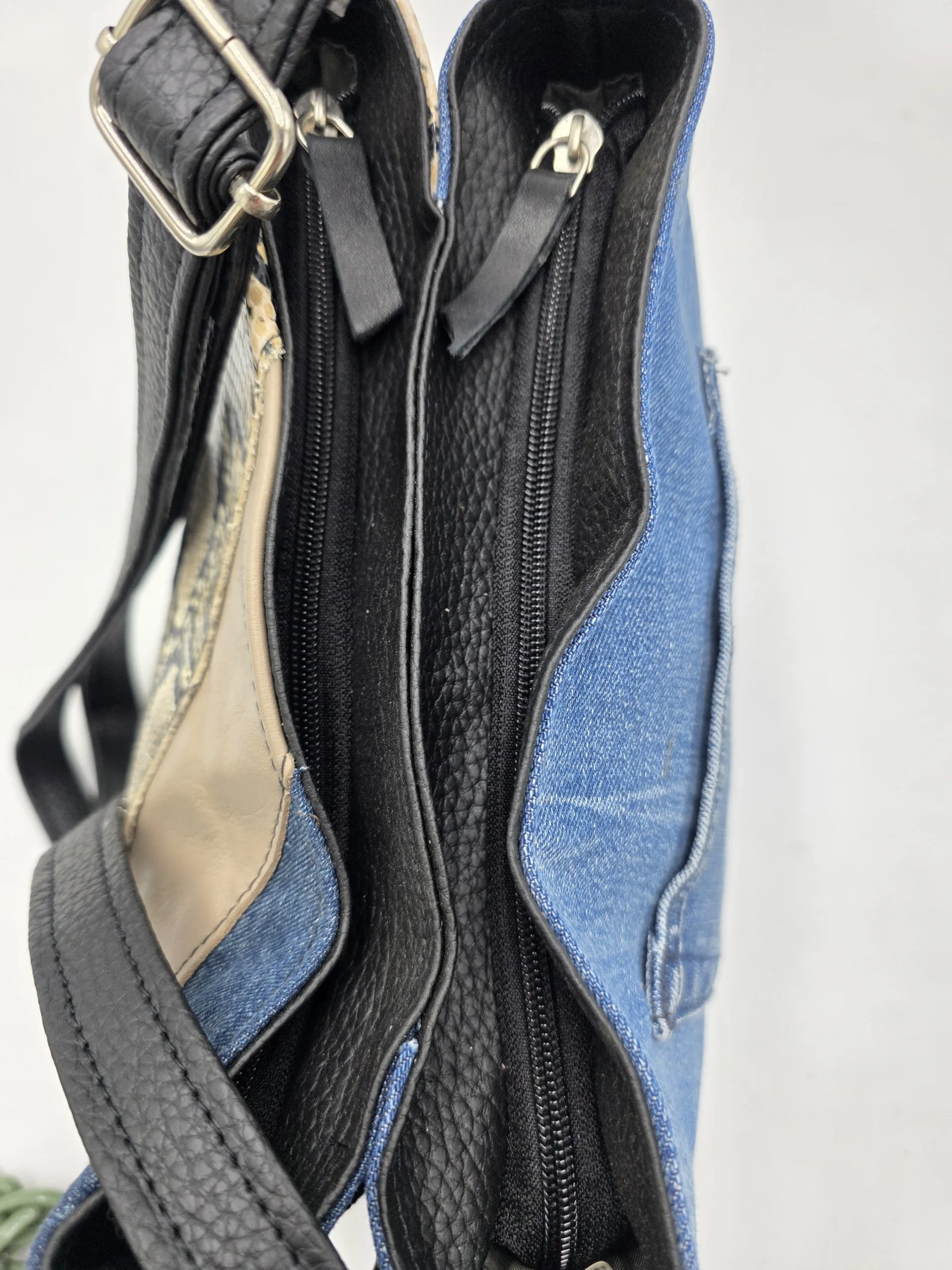 Ръчно изработена чанта от естествена кожа и рециклиран деним с две отделни прегради, заден джоб+вътрешен с цип и отделение за телефон. Вис 23см,ширина 26см,дъно 13/26. Дължина на регулираща се дръжка 150см.