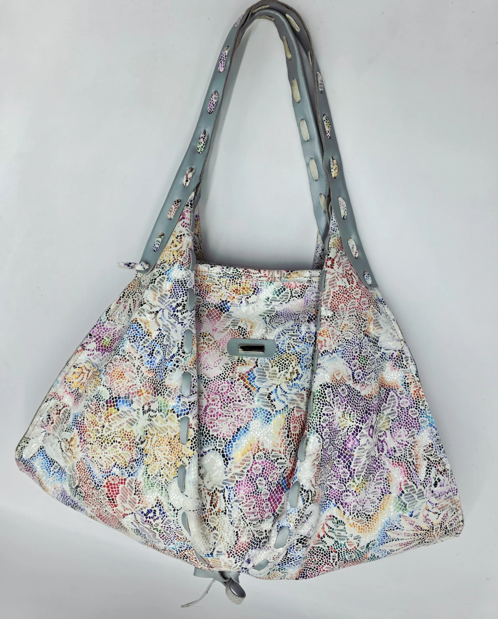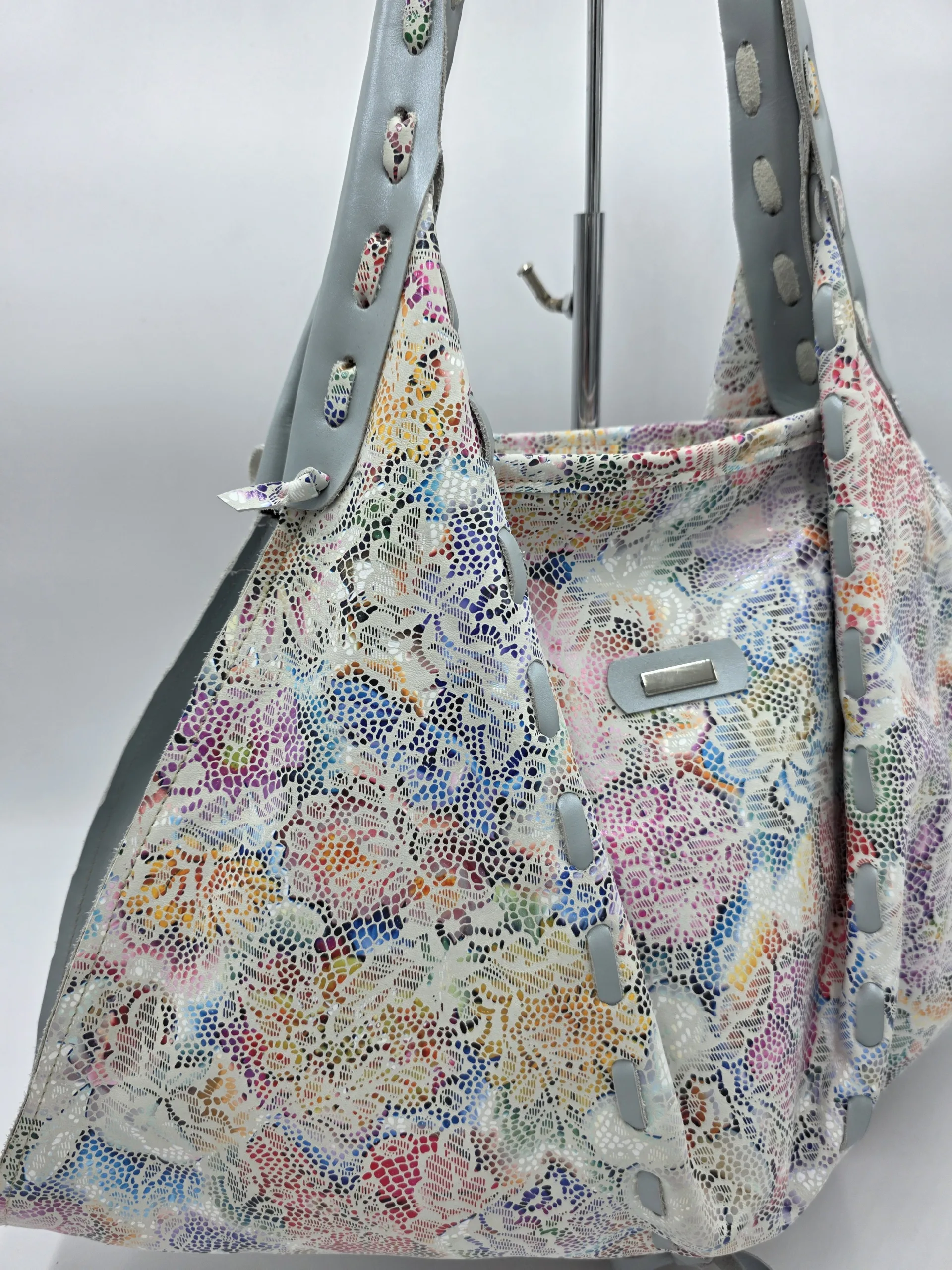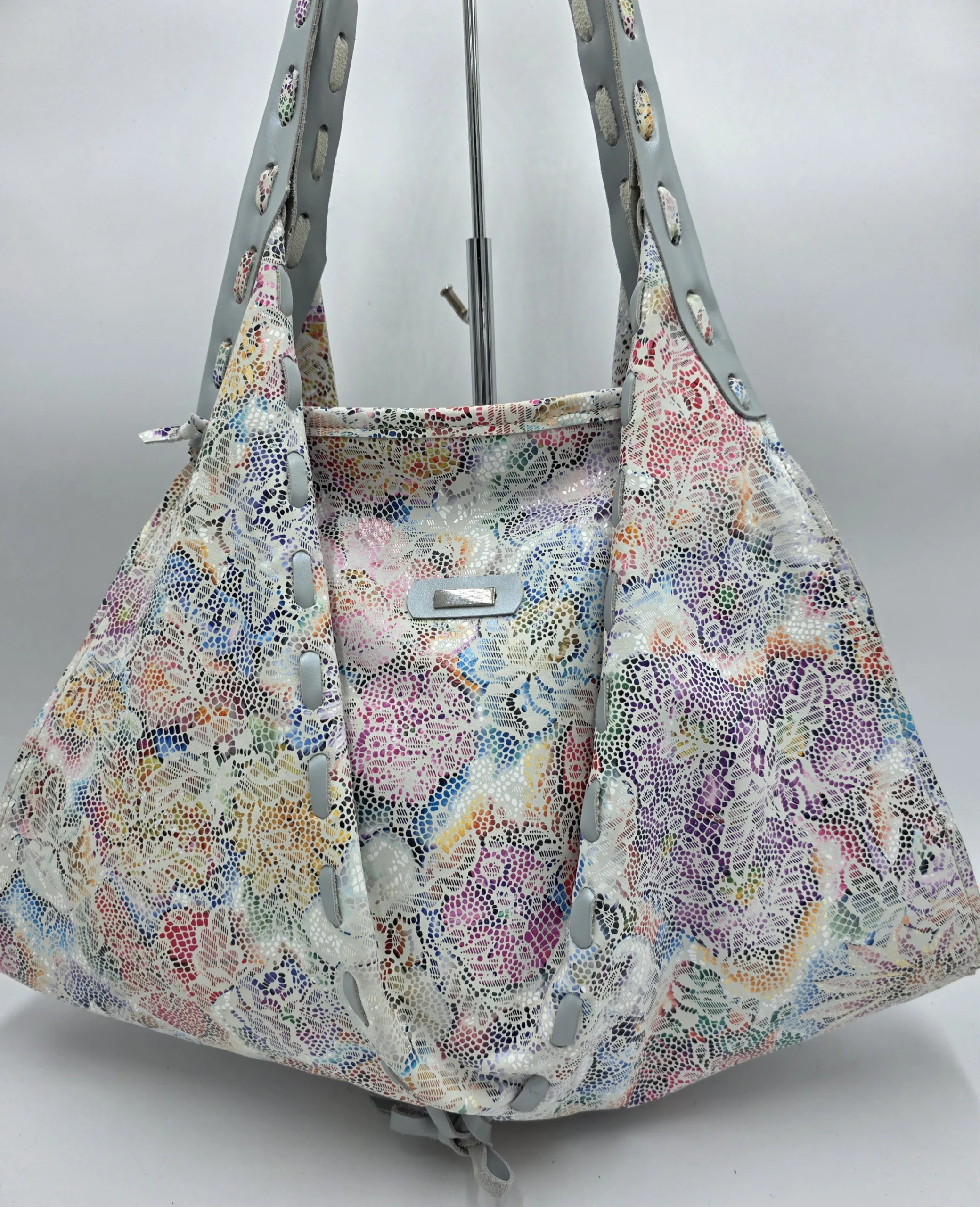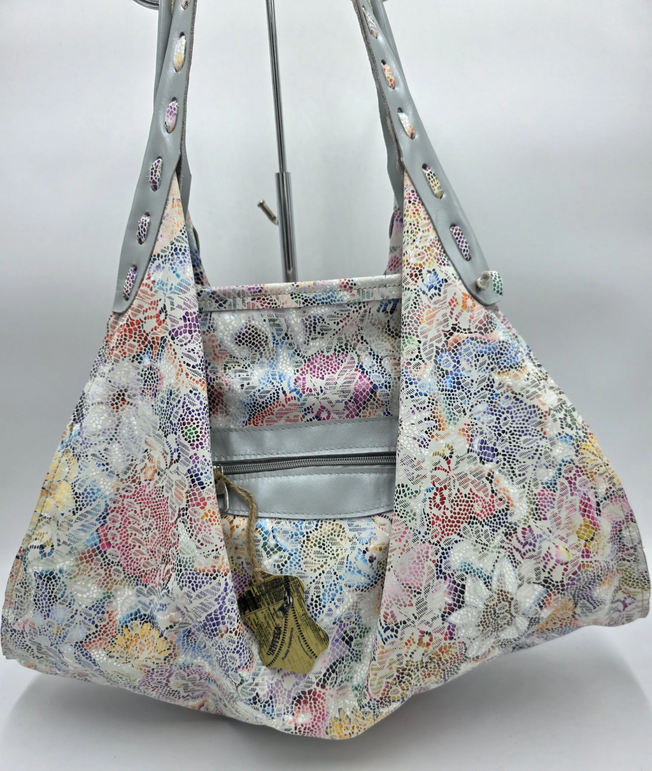 Супер нестандартна чанта в трапецовидна форма от естествена кожа с две дръжки 65см,заден външен джоб с, закопчаване с цип, вътрешен джоб с цип и допълнителен джоб за телефон .Ширина в долната част 48см в горната част 29см,височина 38см,няма оформено дъно.