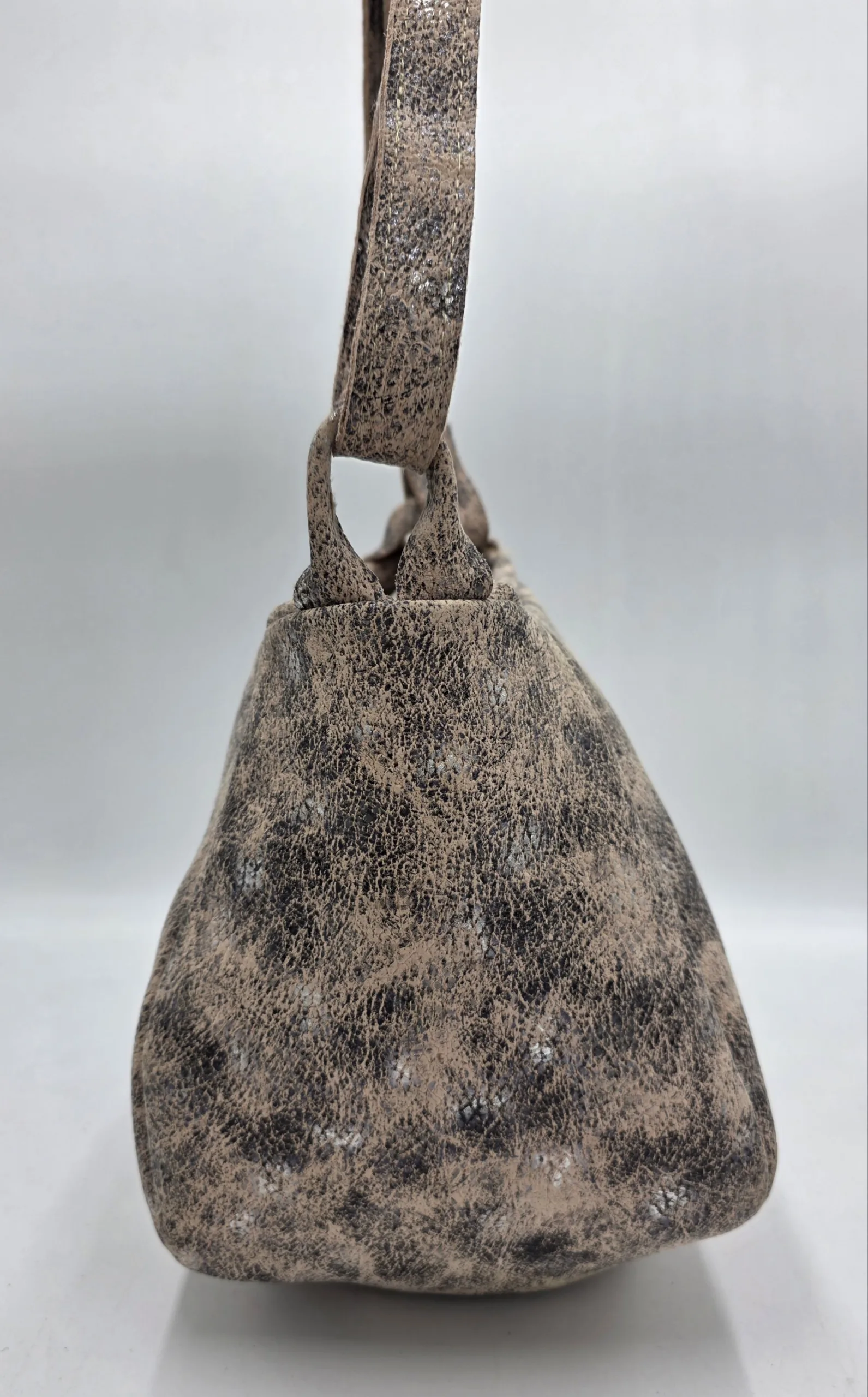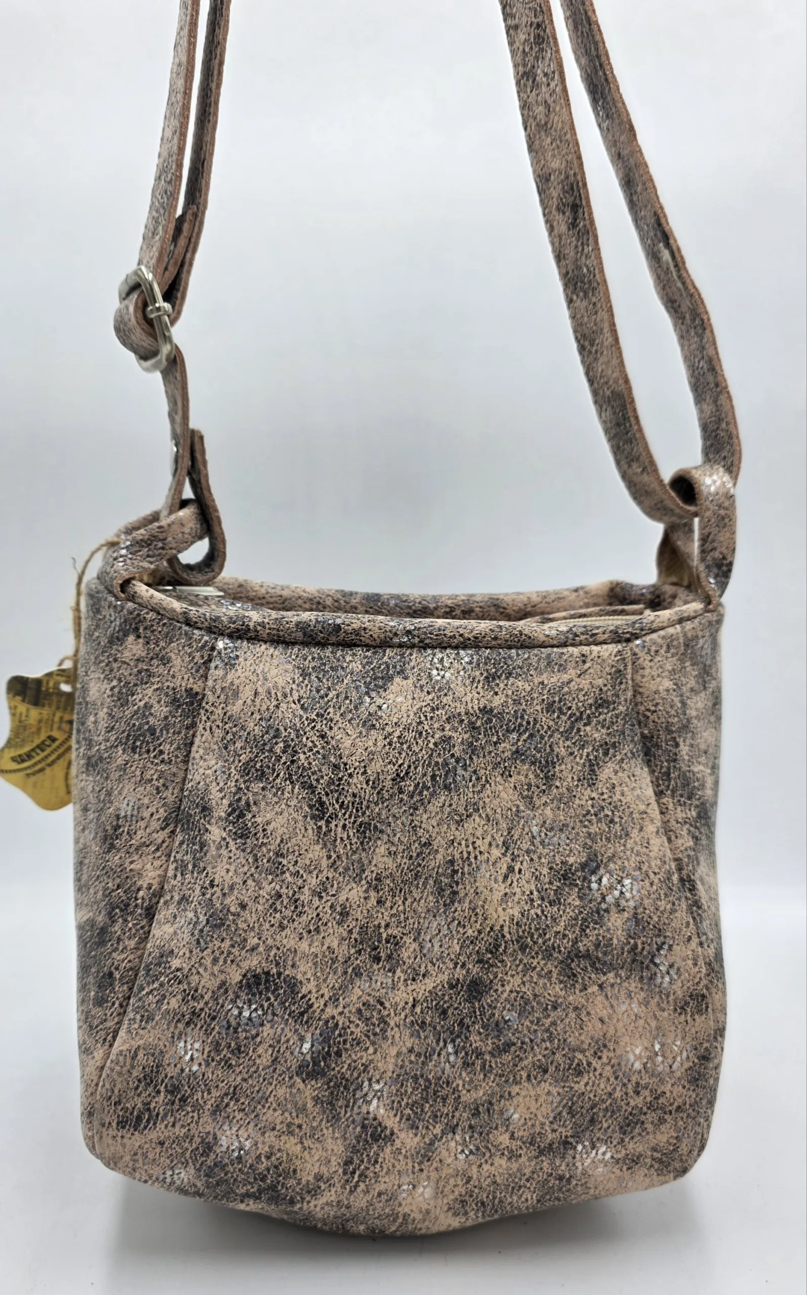 Малка тумбеста чанта от естествена кожа ръчна изработка с дълга регулираща се дръжка 150см, ширина 26см, 22см,кръгло дъно ф14см