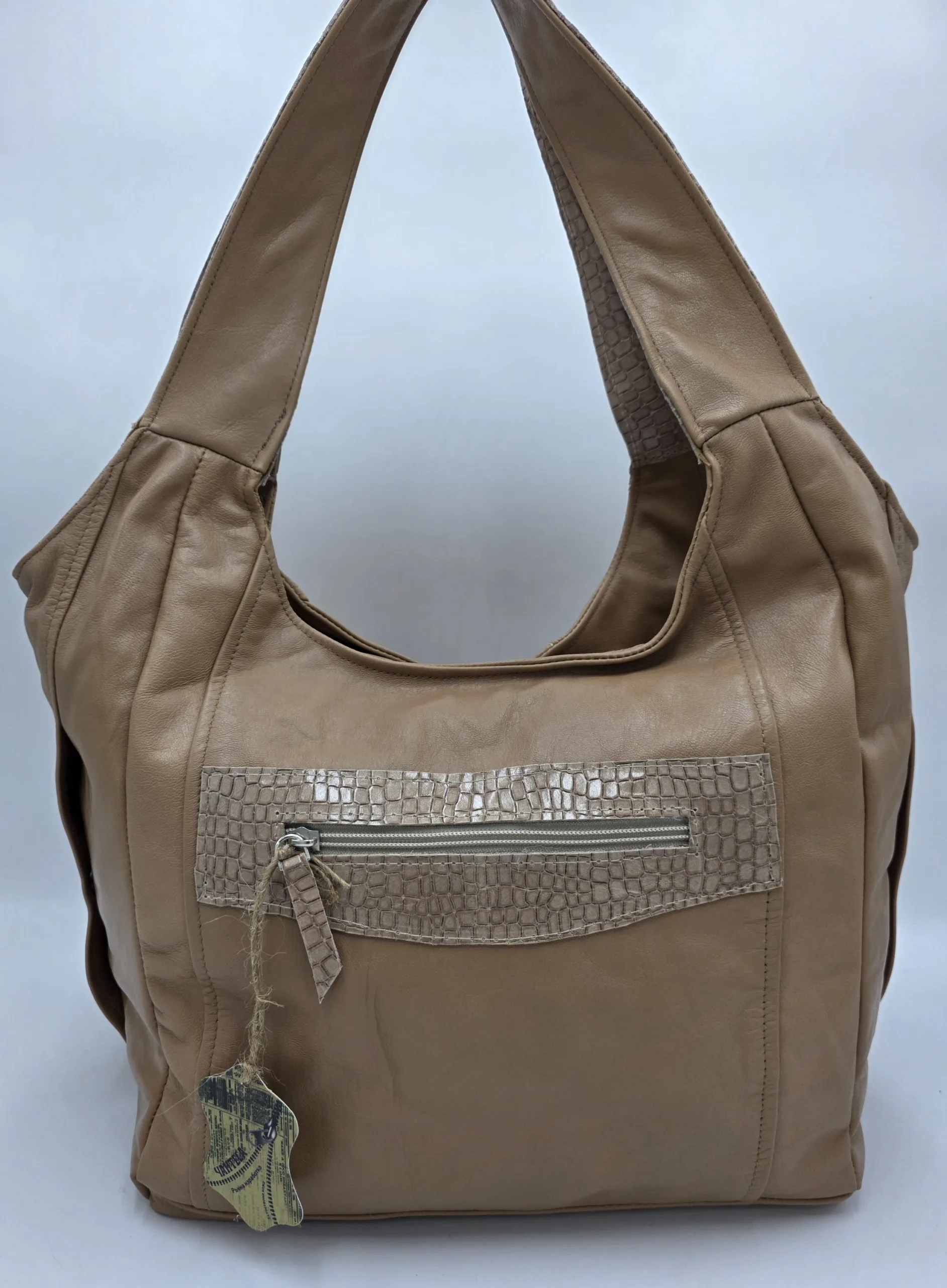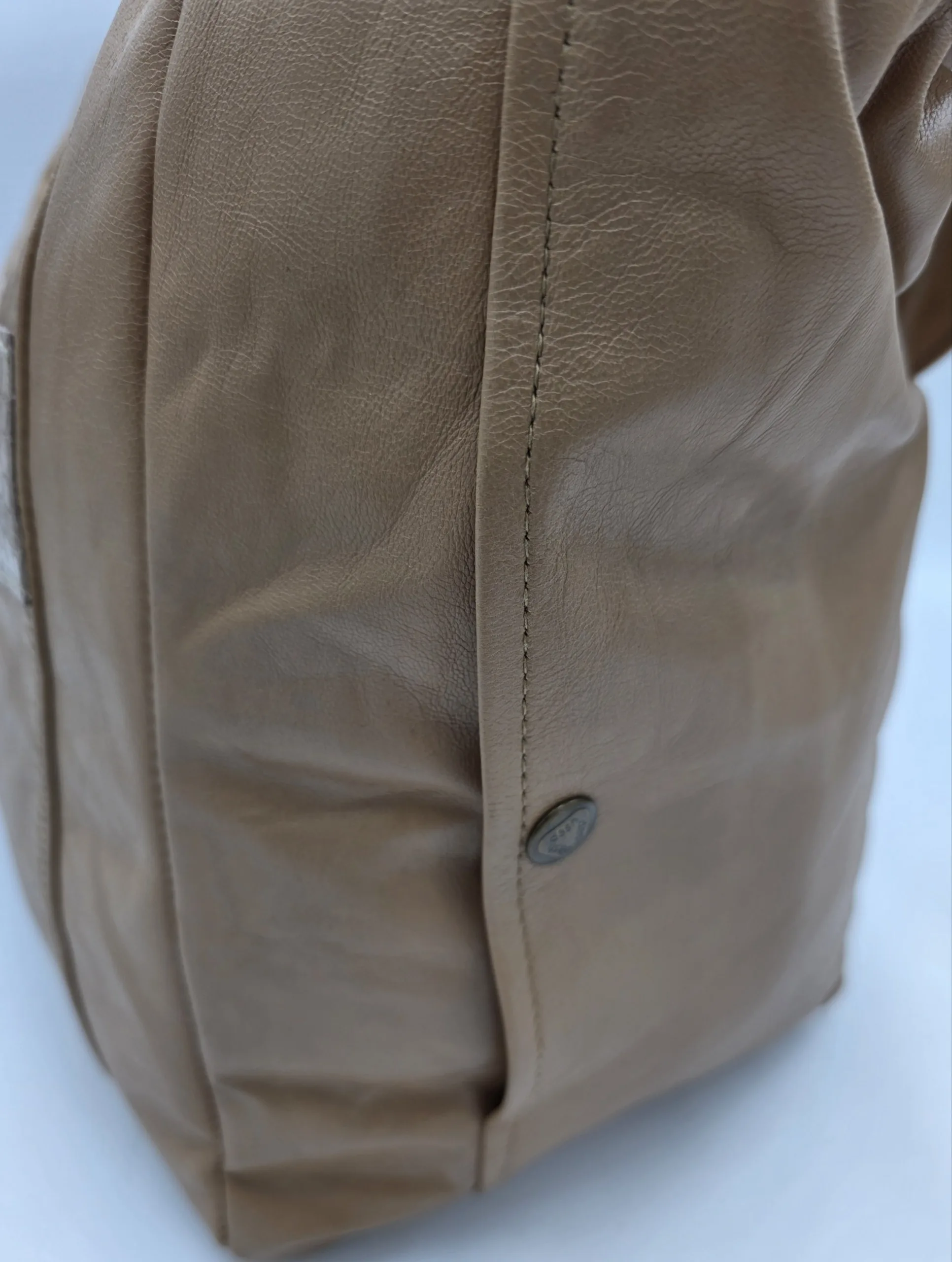 Уникална чанта от естествена кожа тип торба,външен заден джоб с цип,два странични джоба с копче, супер удобни две дръжки 65см,вътрешен джоб с цип и допълнителен джоб за телефон. Ширина 45см,височина 29см,дъно 30см/20см