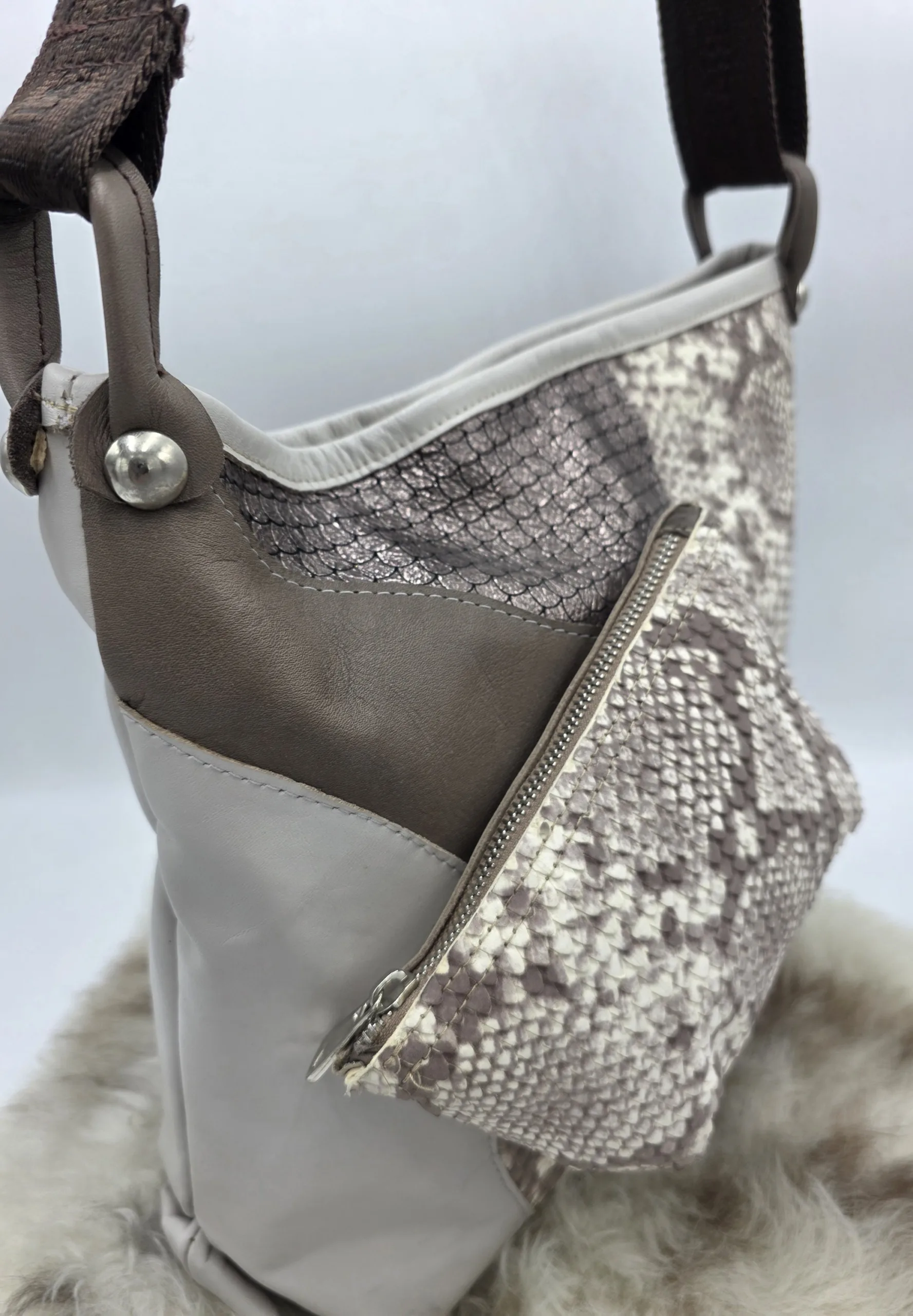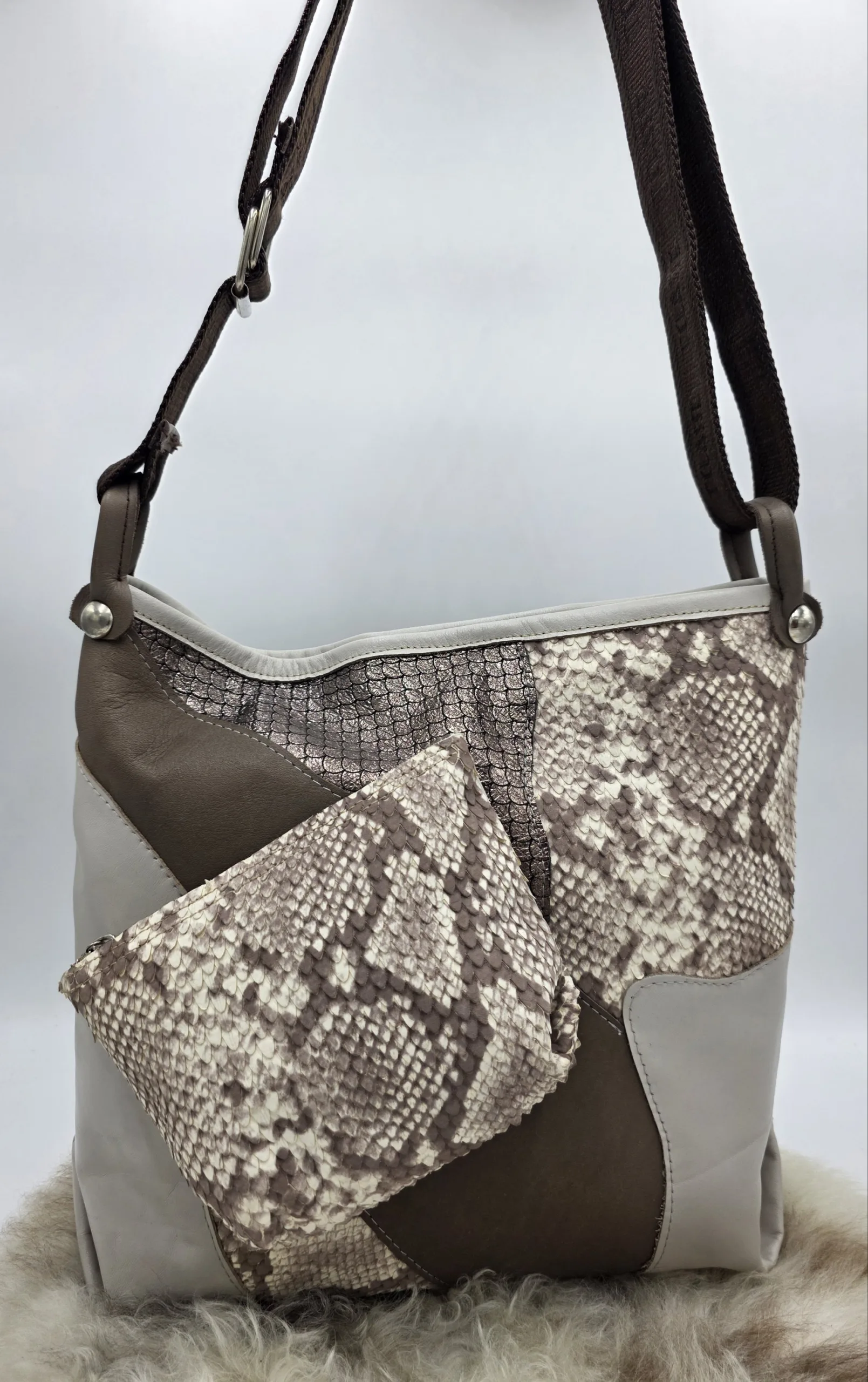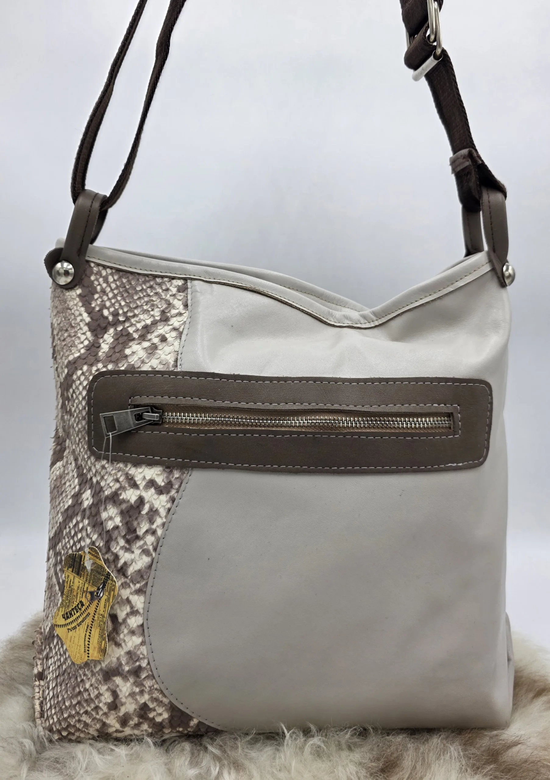 Чанта от естествена кожа ръчна изработка с дълга текстилна регулираща се дръжка 150см, с 3D преден външен джоб с цип, заден външен джоб с, закопчаване с цип, вътре със средна преграда с цип, джоб с цип и допълнителен джоб за телефон.
