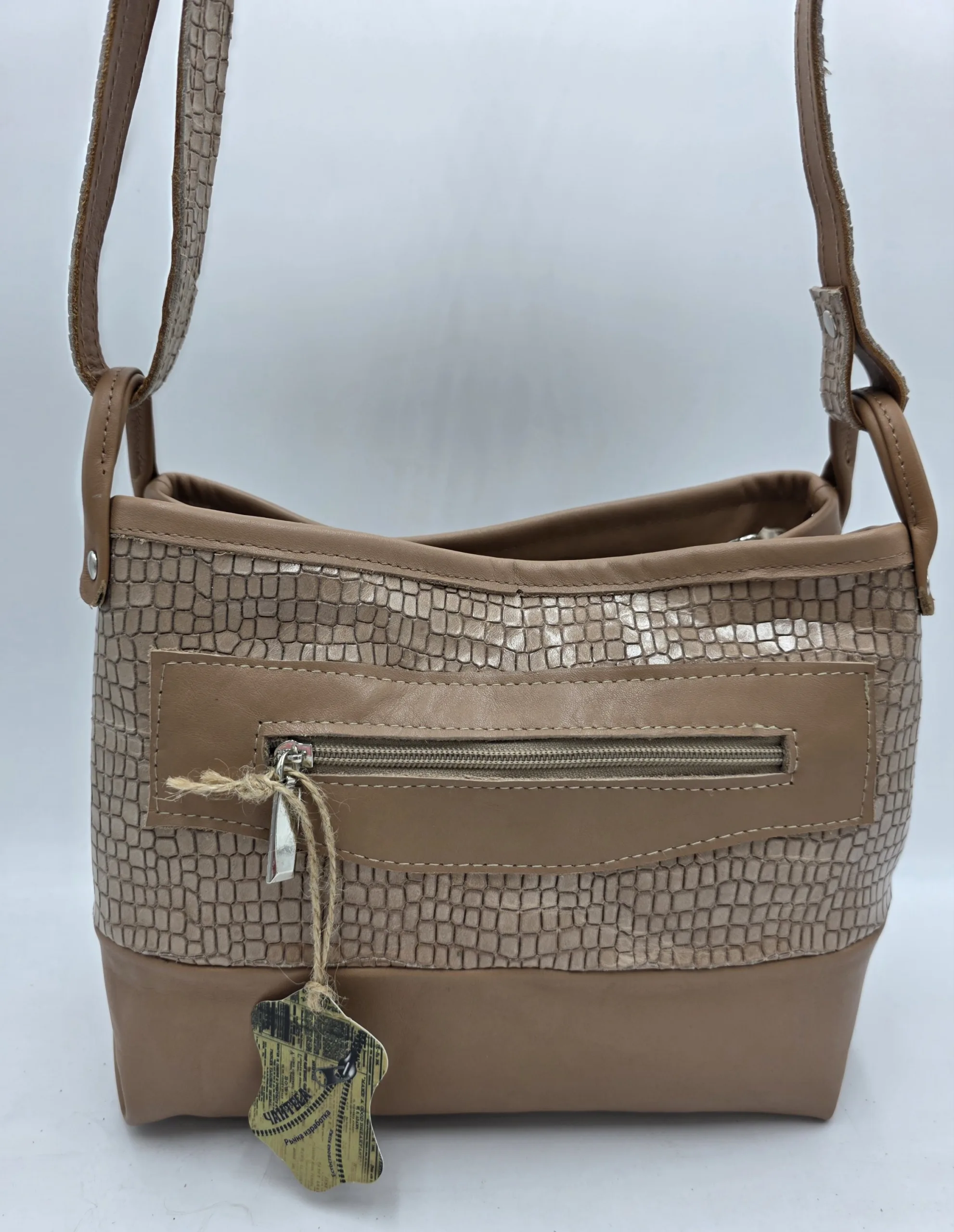 Ръчно изработена чанта от естествена кожа с две отделни прегради, заден джоб+вътрешен с цип и отделение за телефон. Вис 23см,ширина 26см,дъно 13/26. Дължина на регулираща се дръжка 150см.