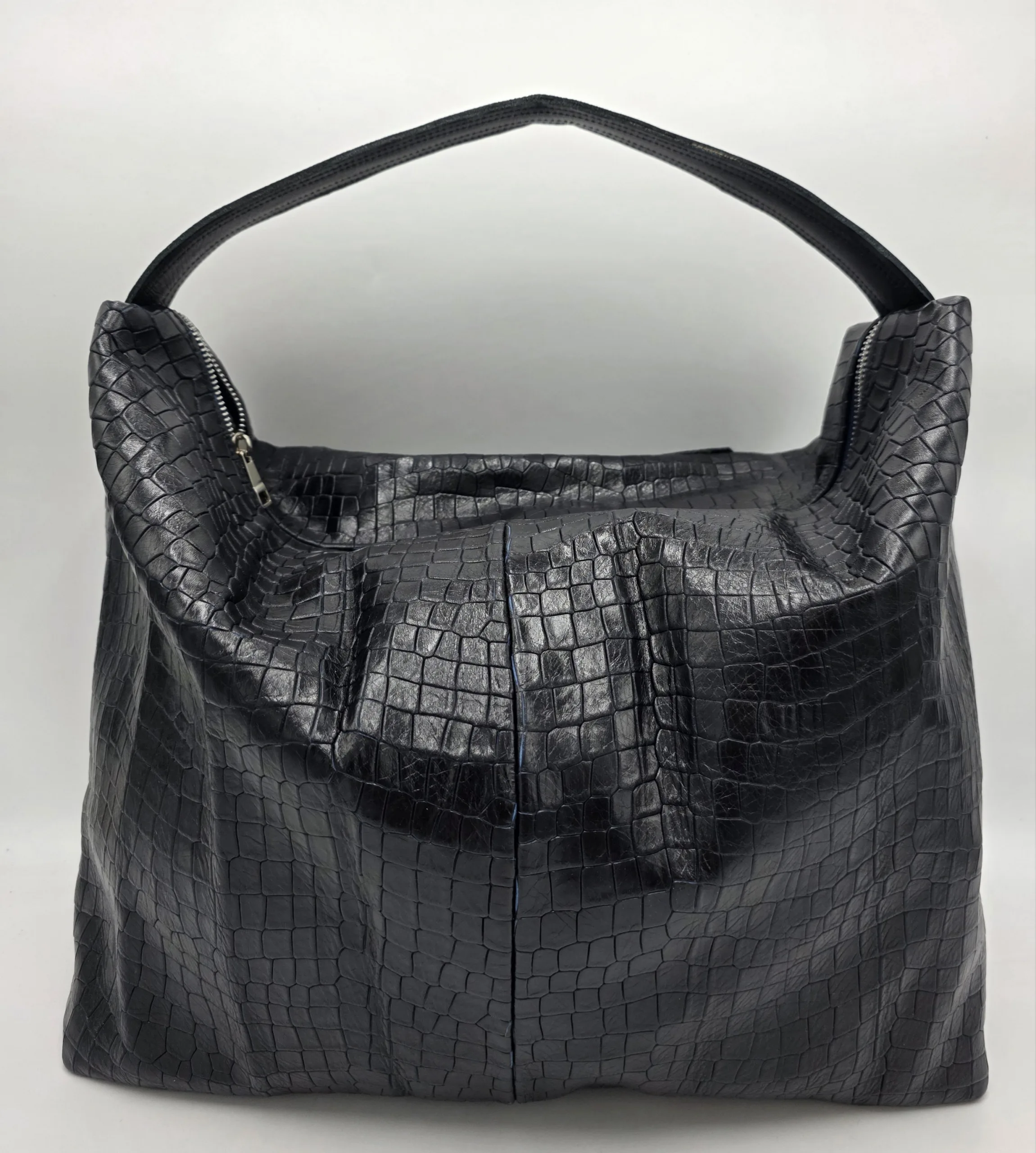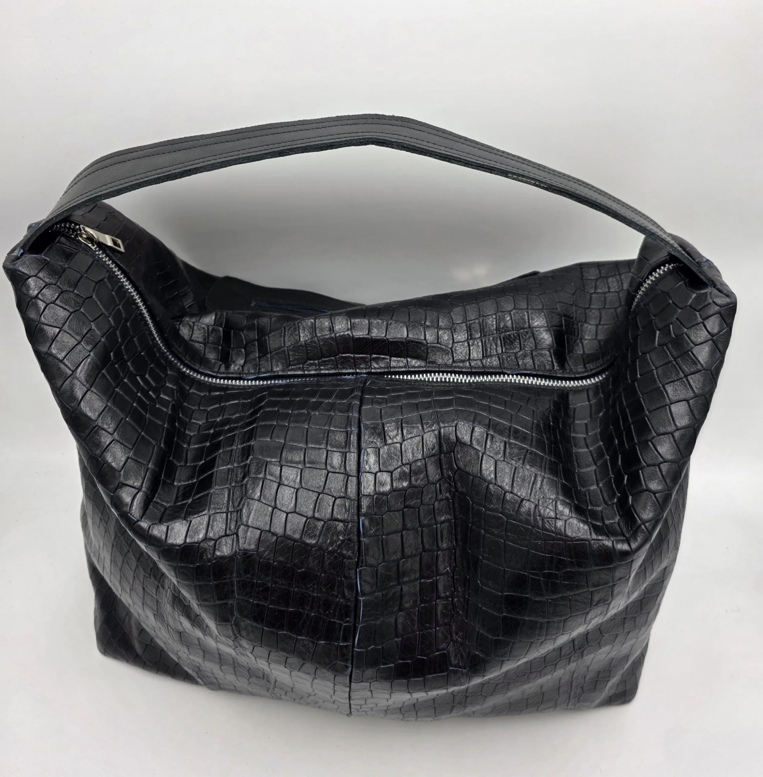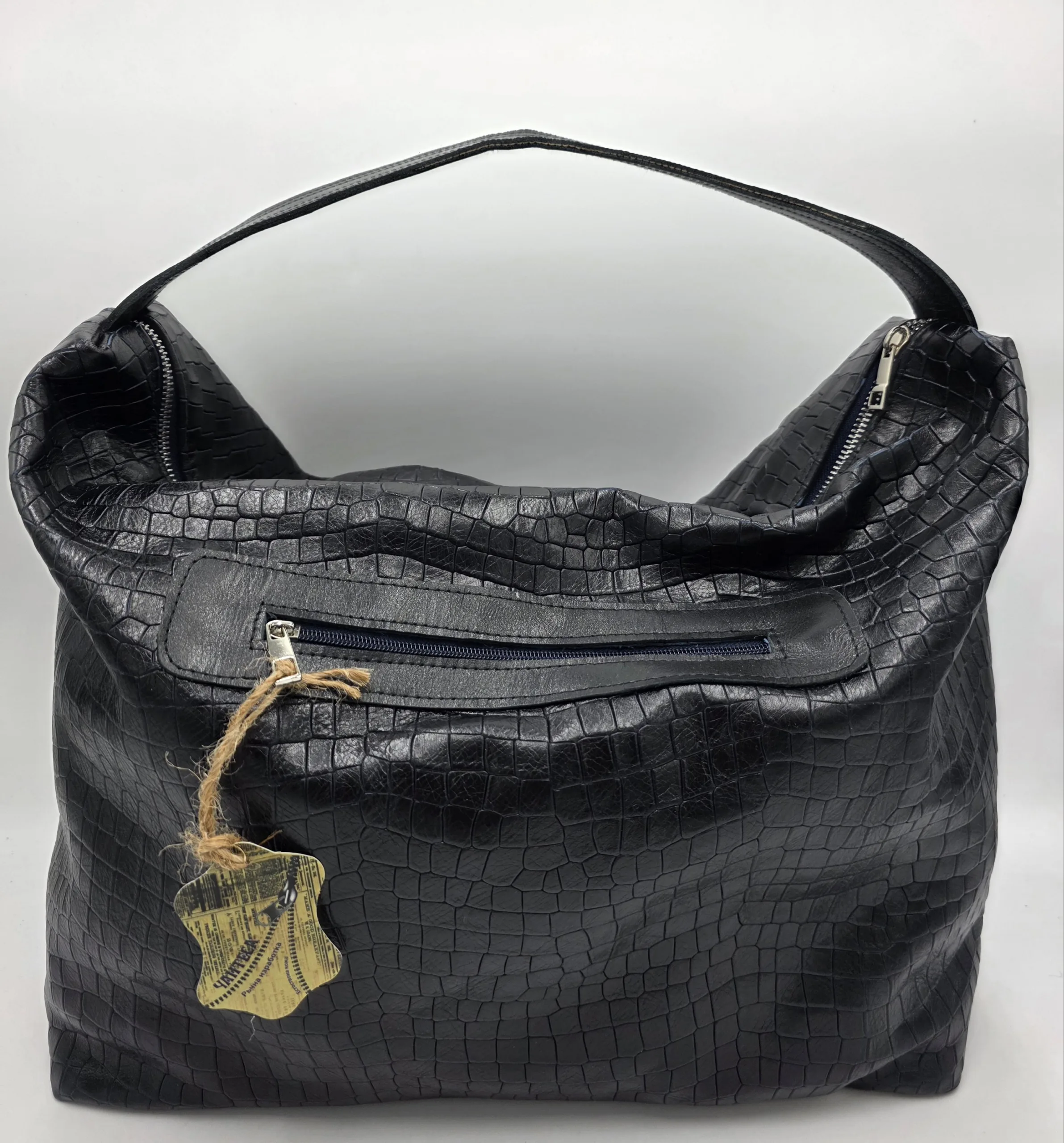 Дизайнерска голяма чанта , тип торба с една дръжка 50см,заден външен джоб с цип, закопчаване с цип, вътрешен джоб с цип и допълнителен джоб за телефон, ширина 52см,височина 35см, дъно 39см/16см.