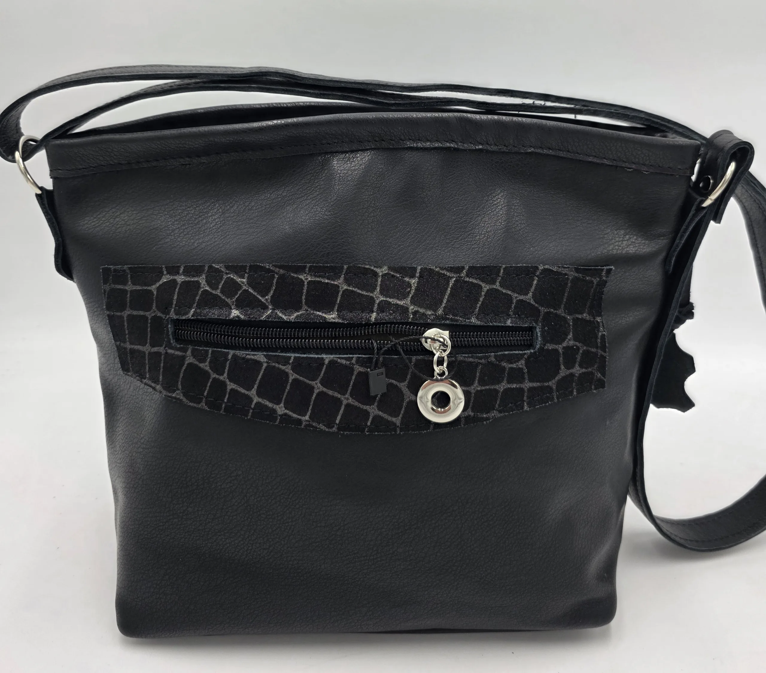 Чанта от естествена кожа за през рамо с дълга регулираща се дръжка 150см, закопчаване с цип, средна преграда с цип, вътрешен джоб с цип и допълнителни джоб за телефон, външен заден джоб с цип. Ширина 28см,височина 22см,дъно 24см/10см.