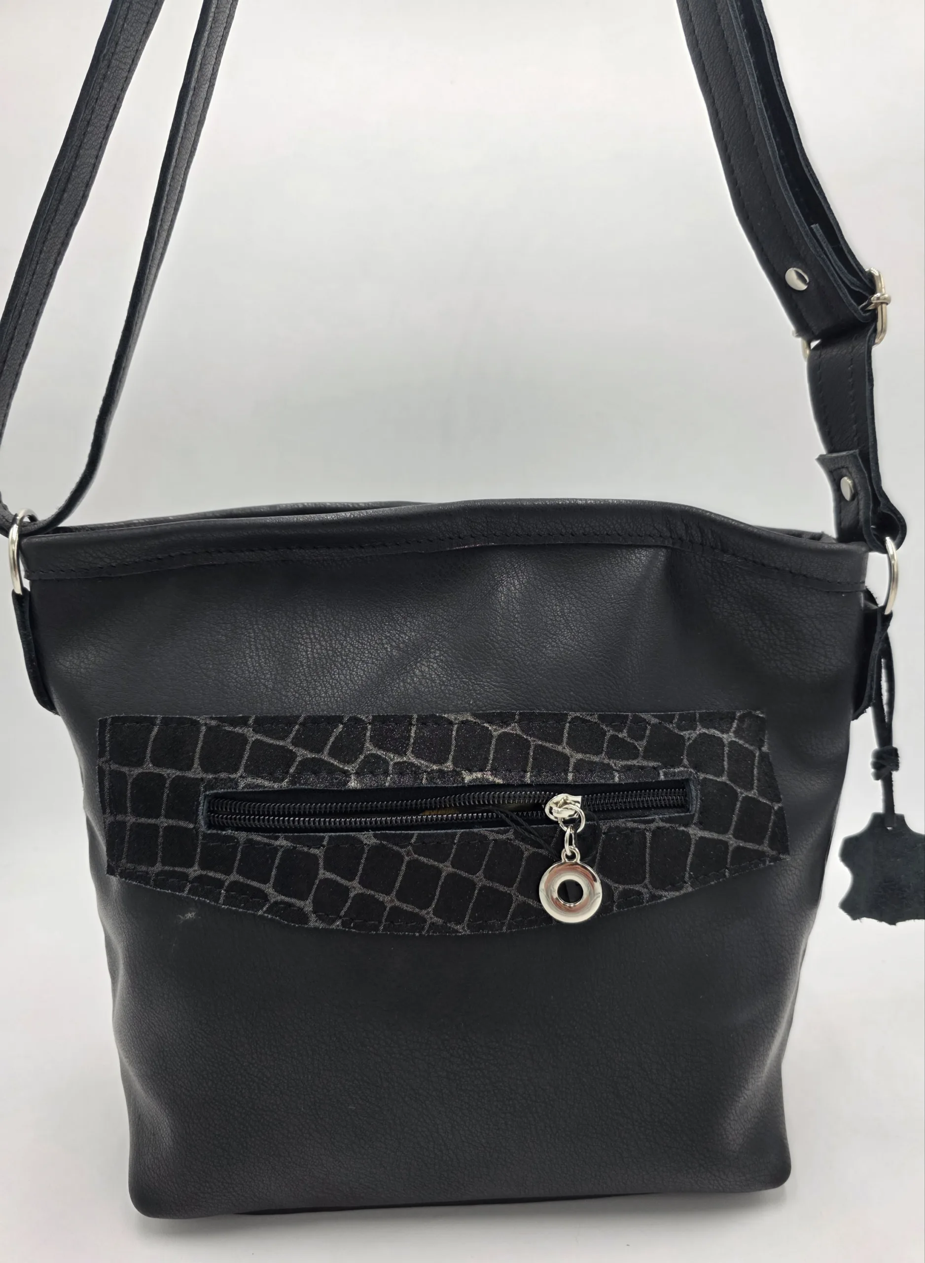 Чанта от естествена кожа за през рамо с дълга регулираща се дръжка 150см, закопчаване с цип, средна преграда с цип, вътрешен джоб с цип и допълнителни джоб за телефон, външен заден джоб с цип. Ширина 28см,височина 22см,дъно 24см/10см.