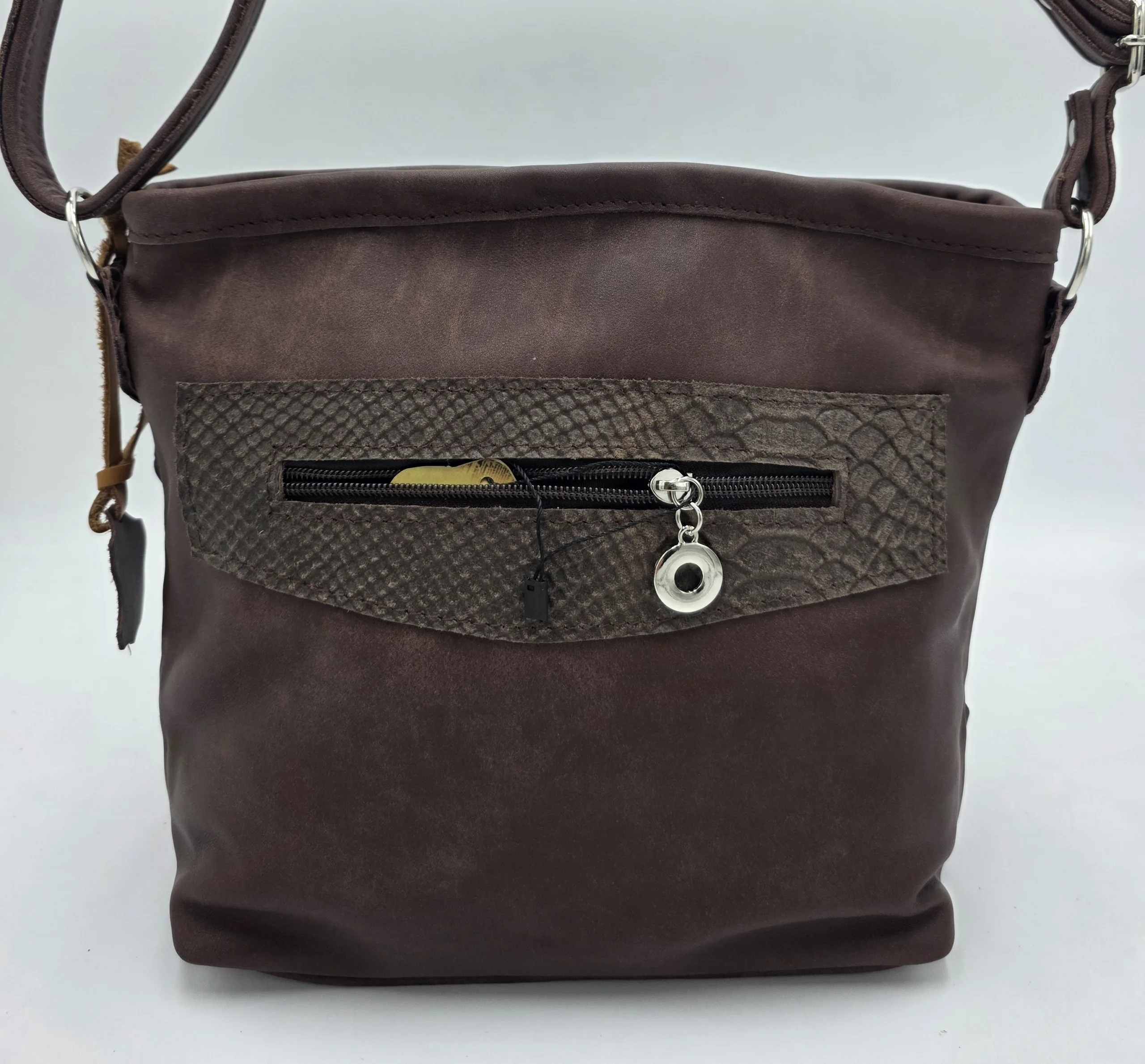 Чанта от естествена кожа за през рамо с дълга регулираща се дръжка 150см, закопчаване с цип, средна преграда с цип, вътрешен джоб с цип и допълнителни джоб за телефон, външен заден джоб с цип. Ширина 28см,височина 22см,дъно 24см/10см.