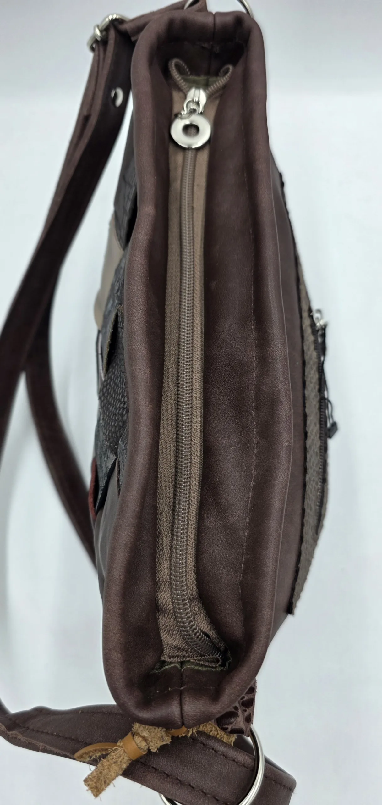 Чанта от еко кожа съчетание с еко велур, две дръжки 45см,двете прегради затварящи се с общ цип, вътрешен заден джоб