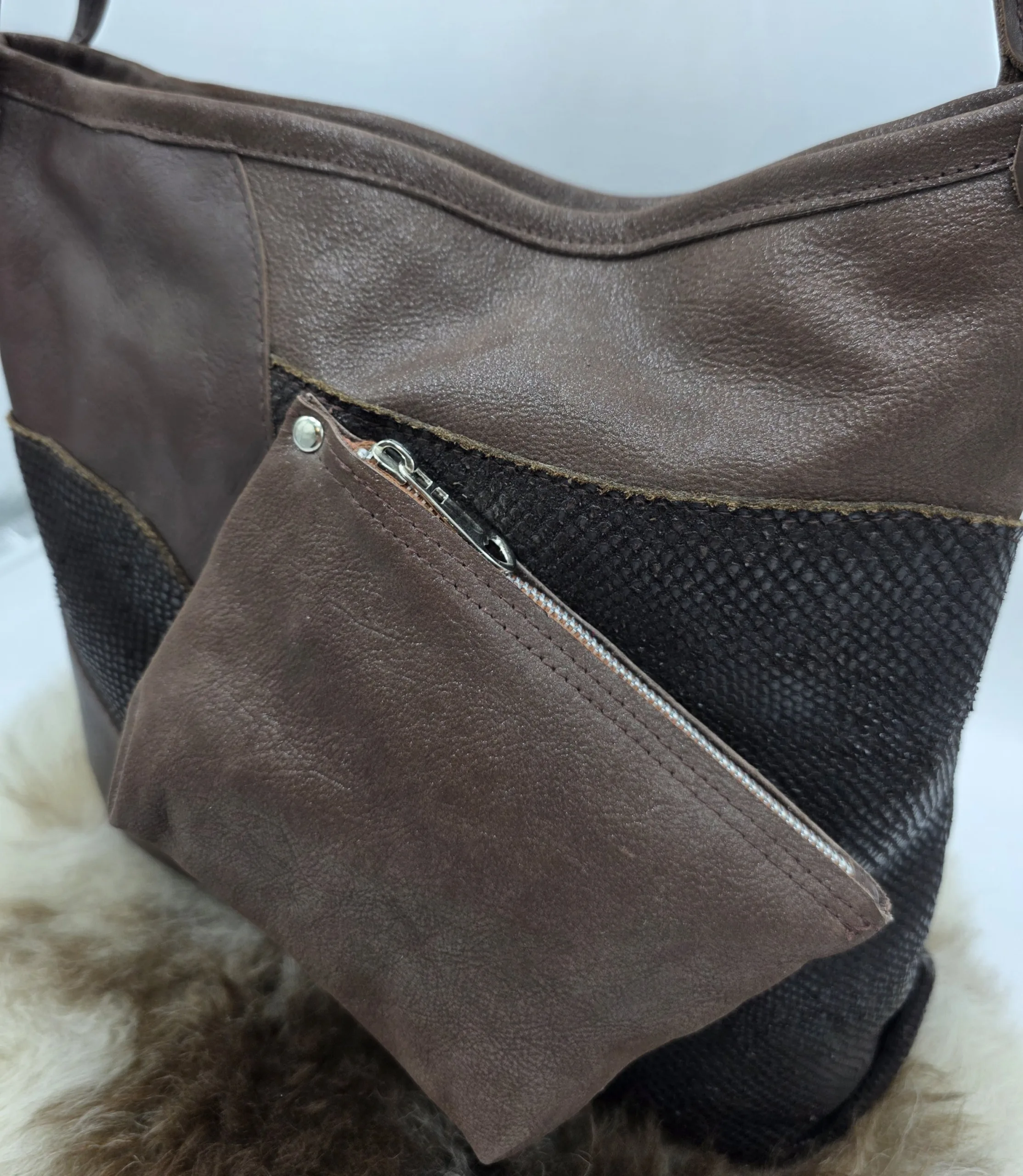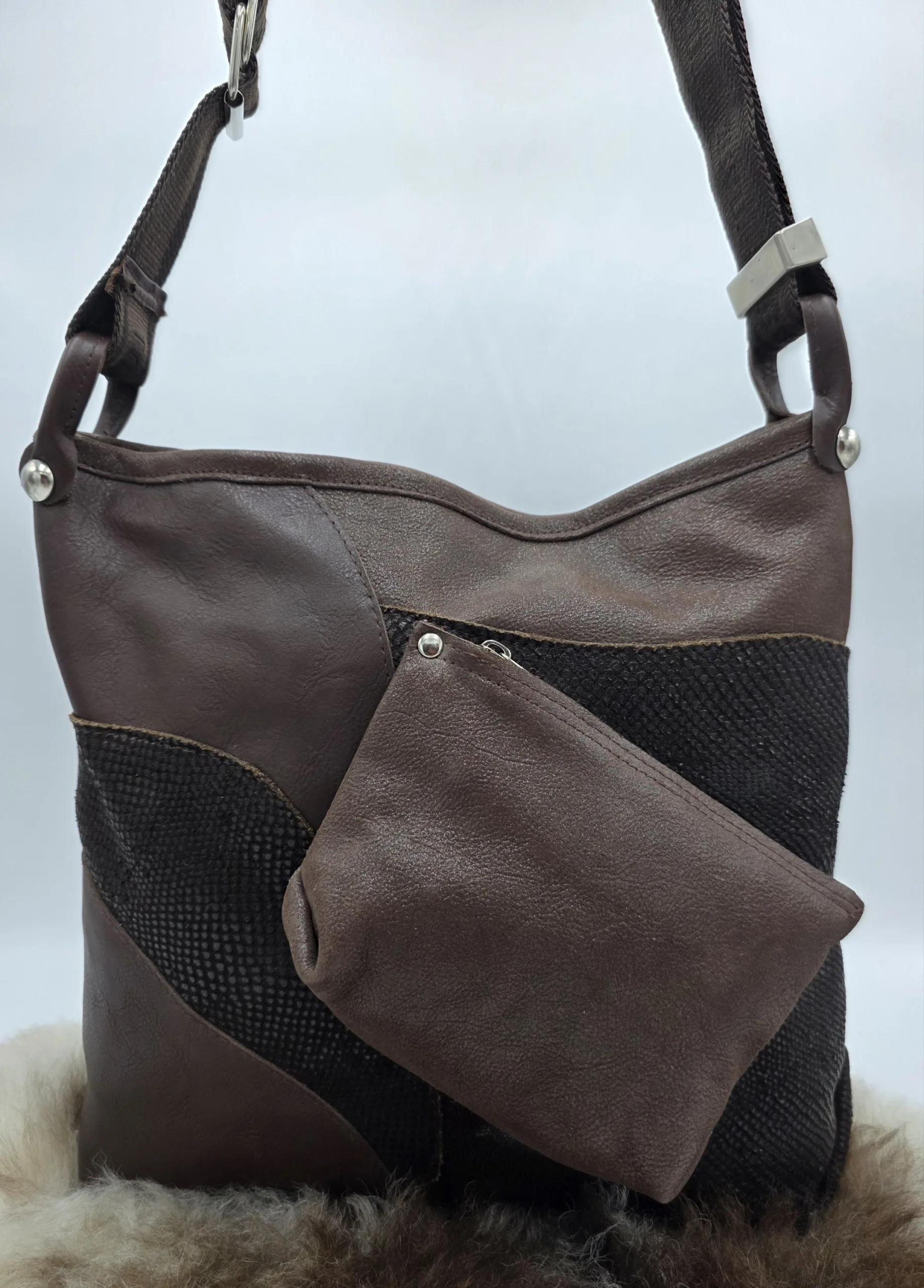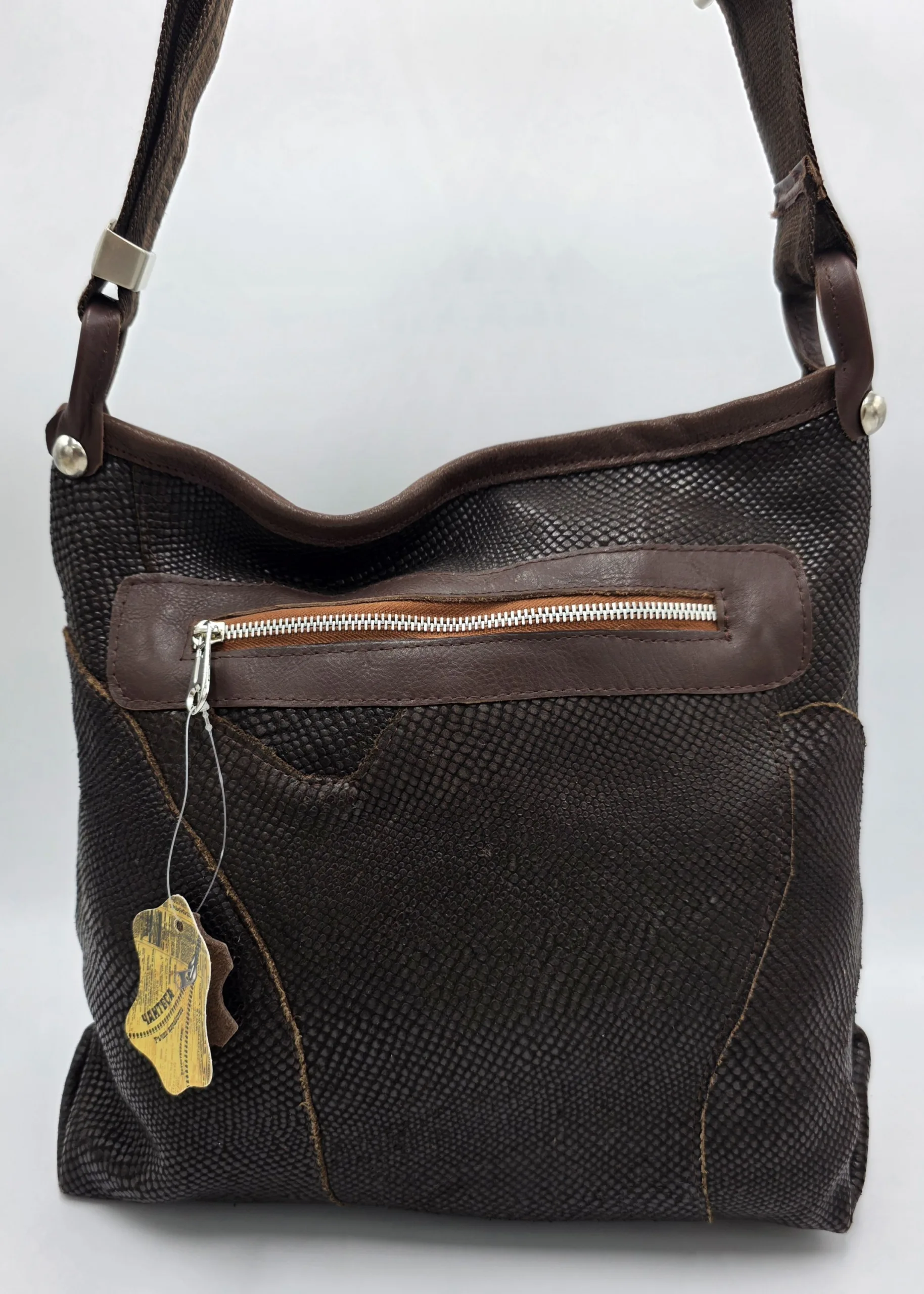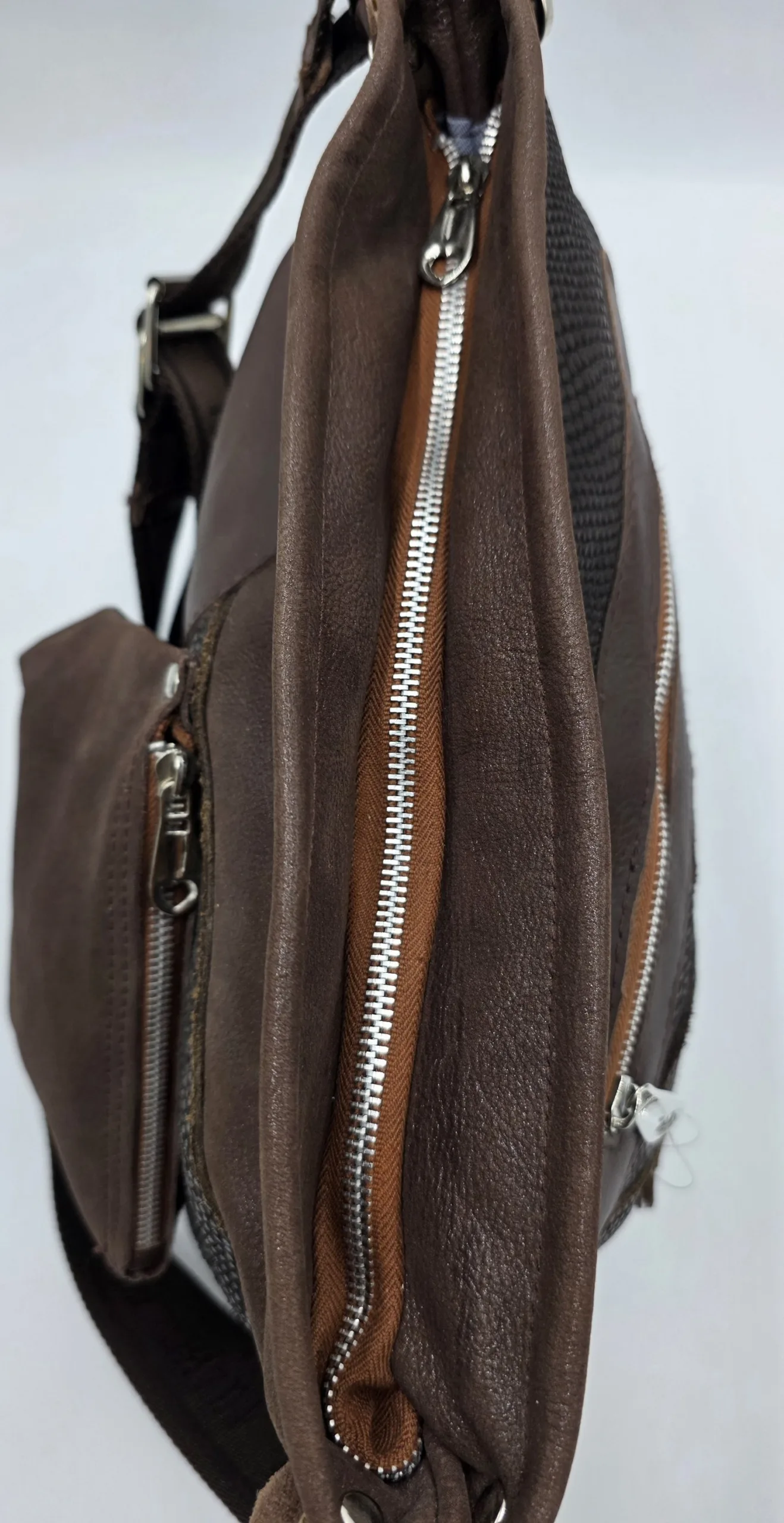 Чанта от естествена кожа ръчна изработка с дълга текстилна регулираща се дръжка 150см, с 3D преден външен джоб с цип, заден външен джоб с, закопчаване с цип, вътре със средна преграда с цип, джоб с цип и допълнителен джоб за телефон.