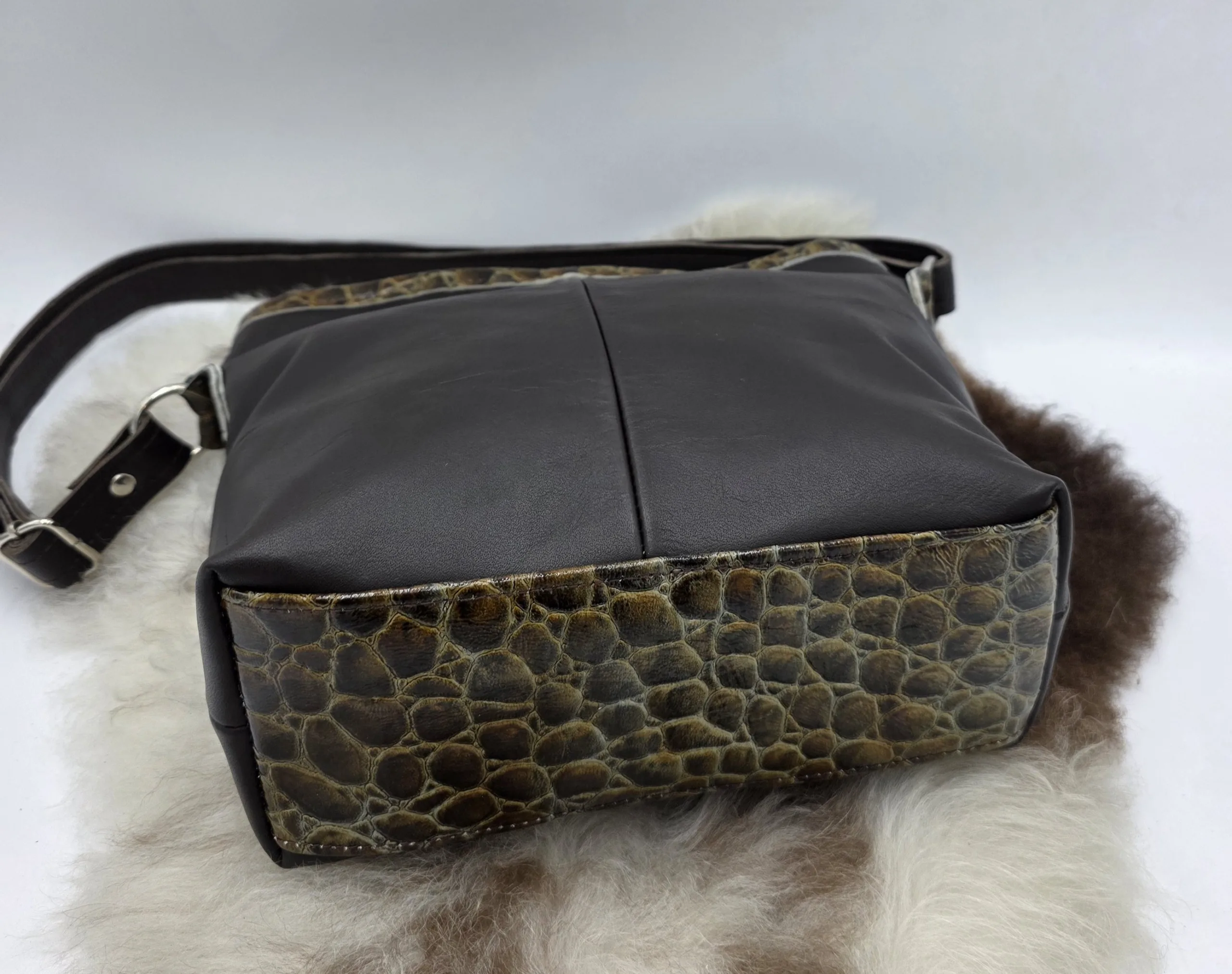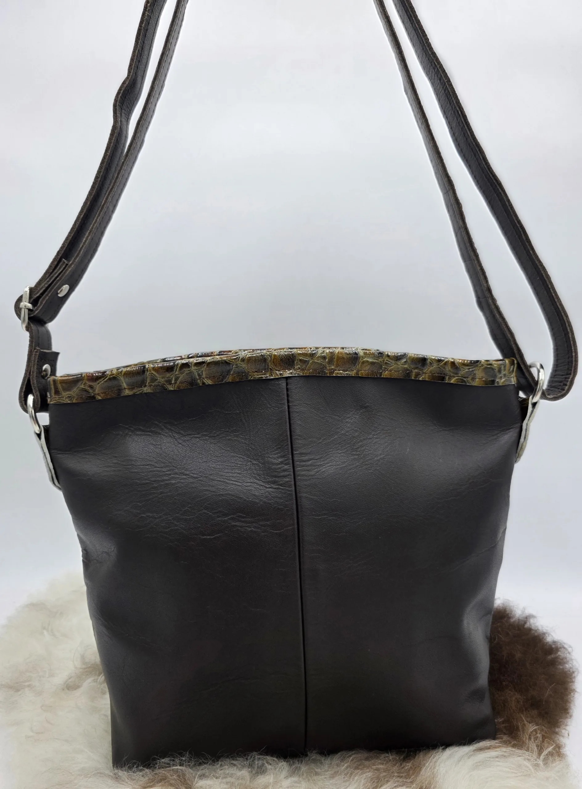 Чанта от естествена кожа за през рамо с дълга регулираща се дръжка 150см, закопчаване с цип, средна преграда с цип, вътрешен джоб с цип и допълнителни джоб за телефон, външен заден джоб с цип. Ширина 28см,височина 22см,дъно 24см/10см