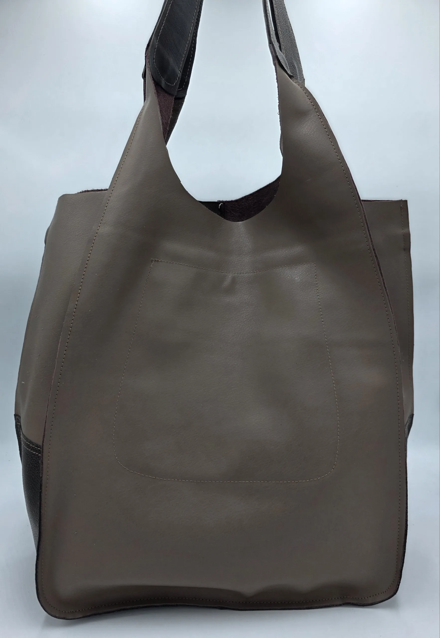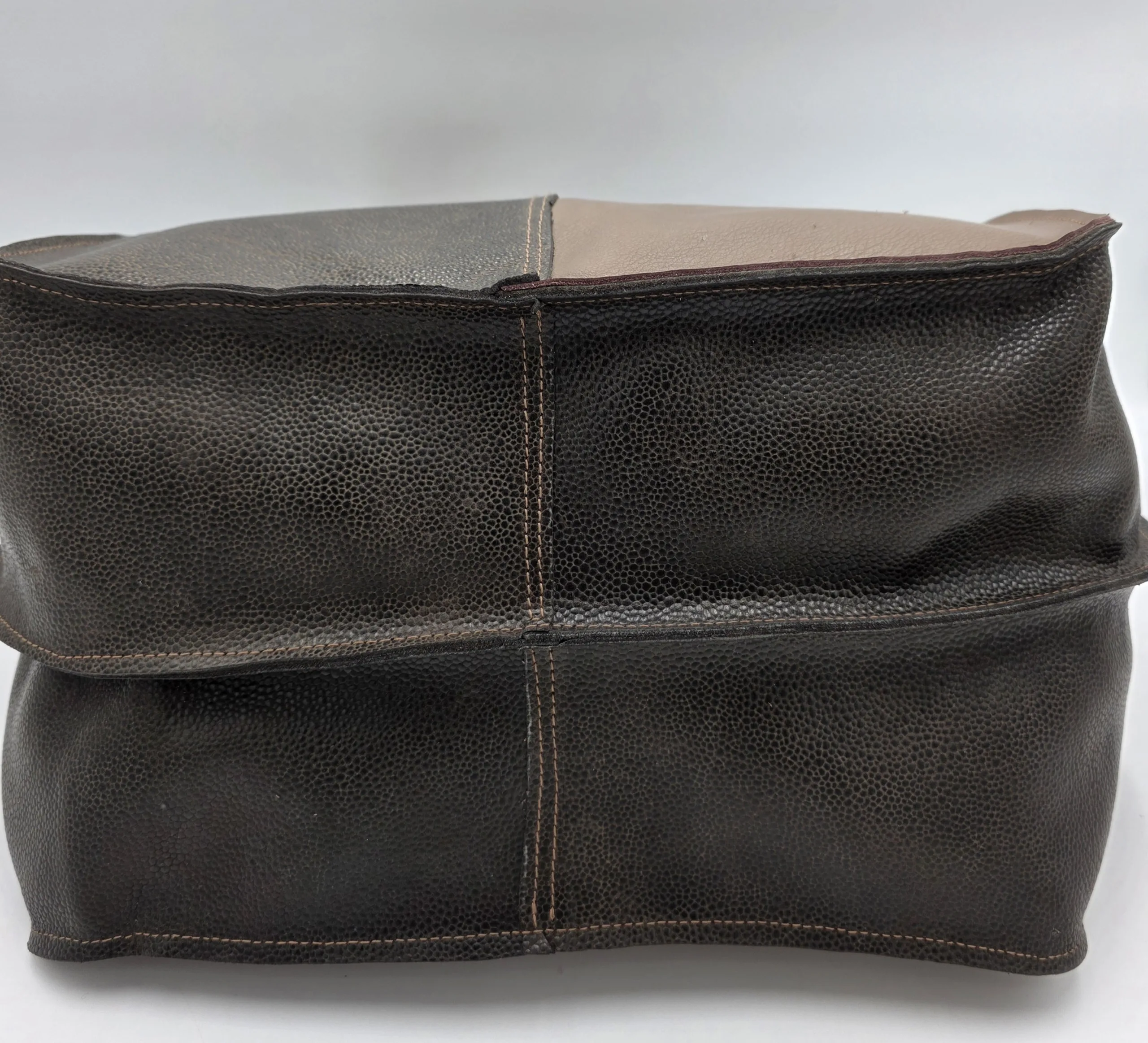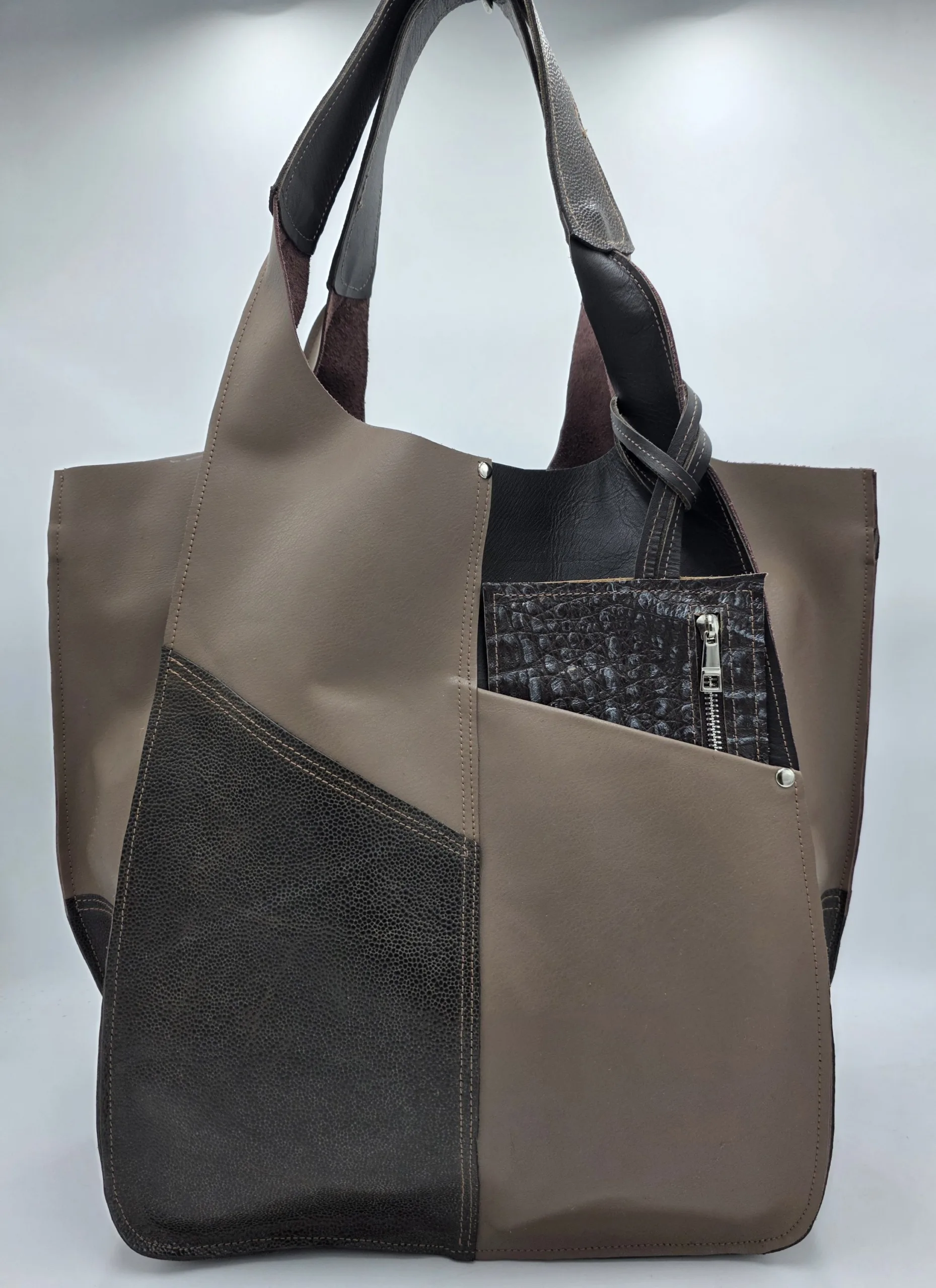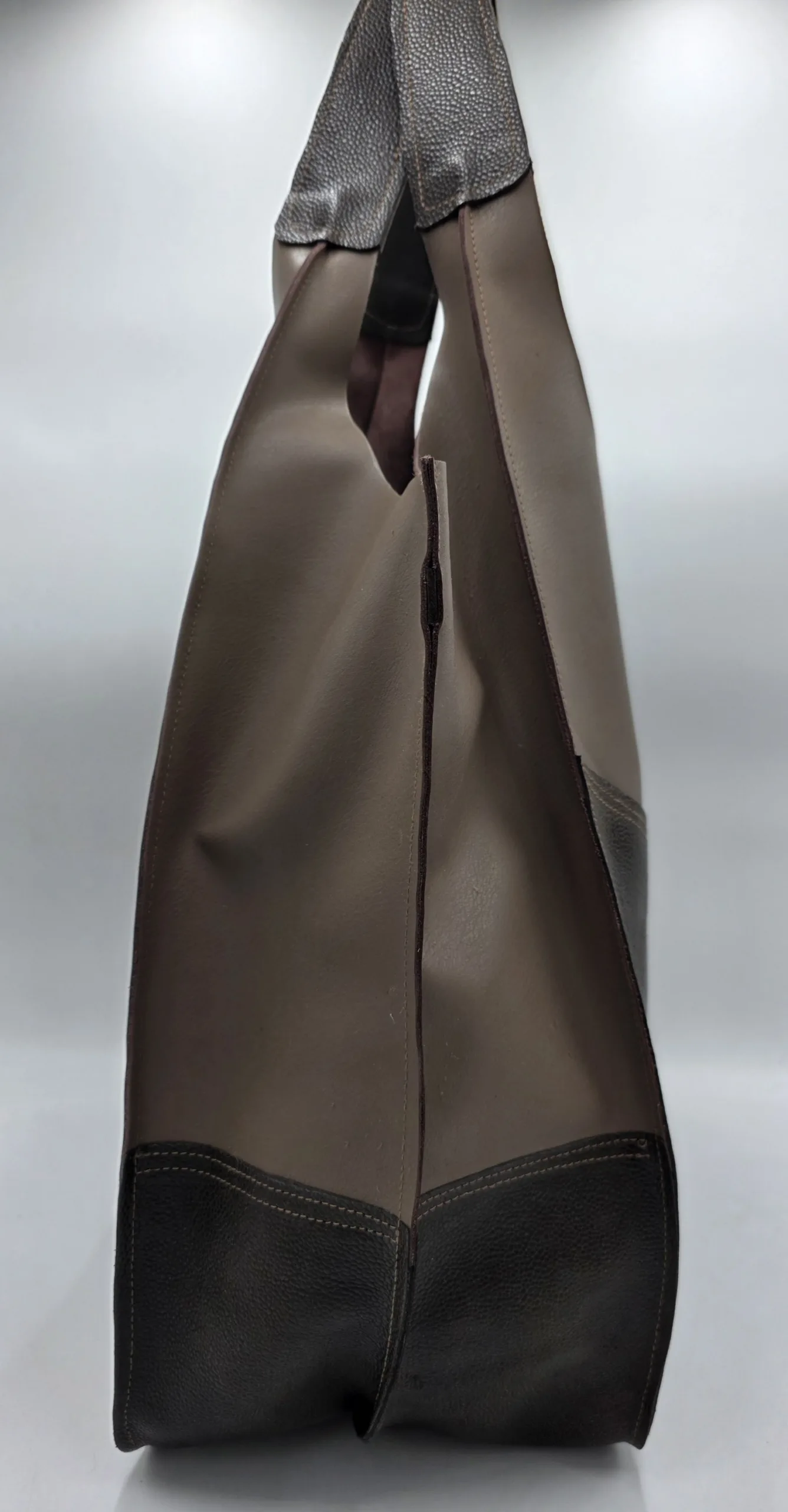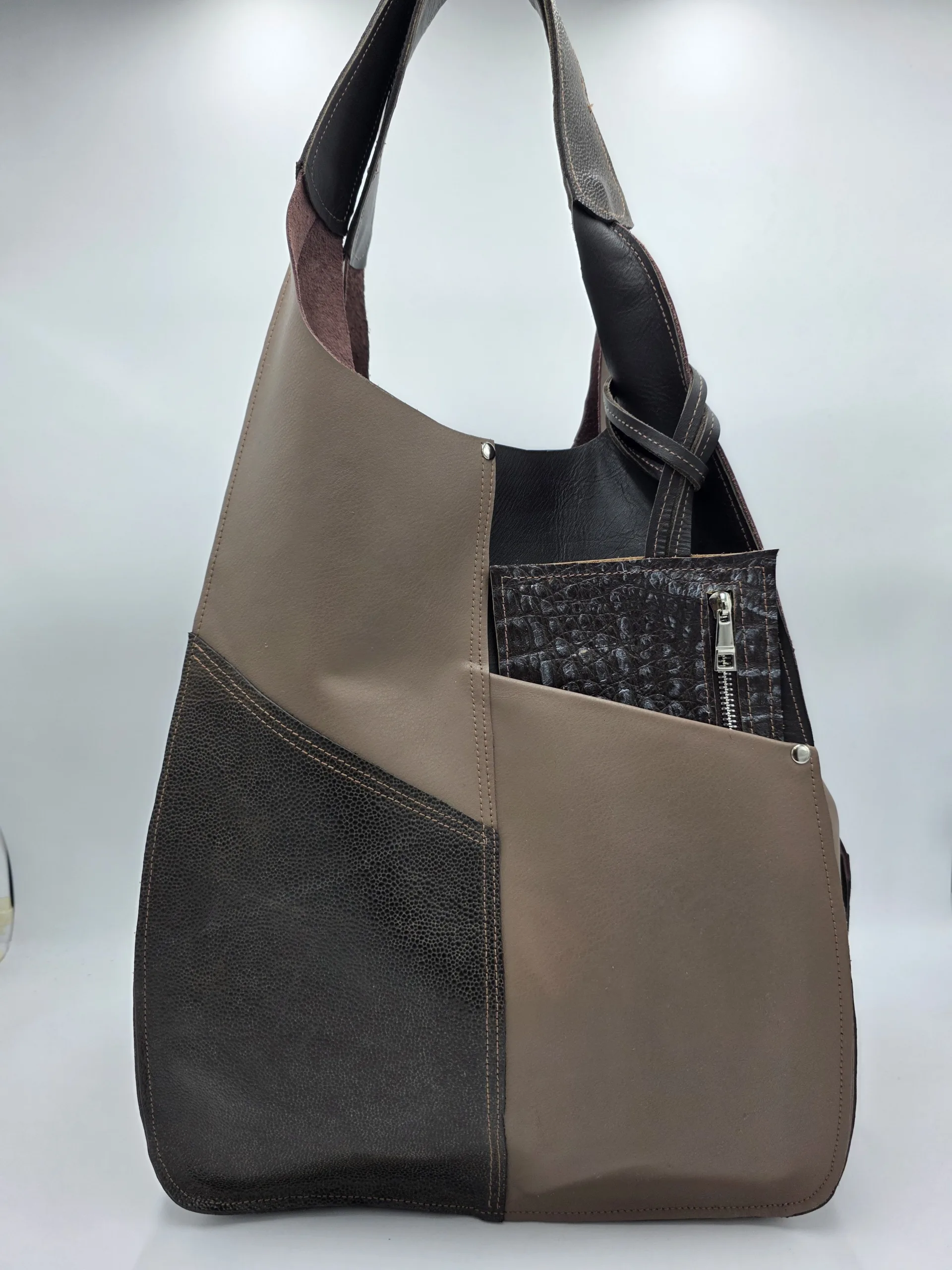 Уникална чанта от естествена кожа,тип торба. Ръчна изработка, без хастар, две дръжки 55см,външен джоб, допълнително портмоне с цип,вътрешен джоб с цип. Ширина 56см,височина 42см,дъно 32см/22см.