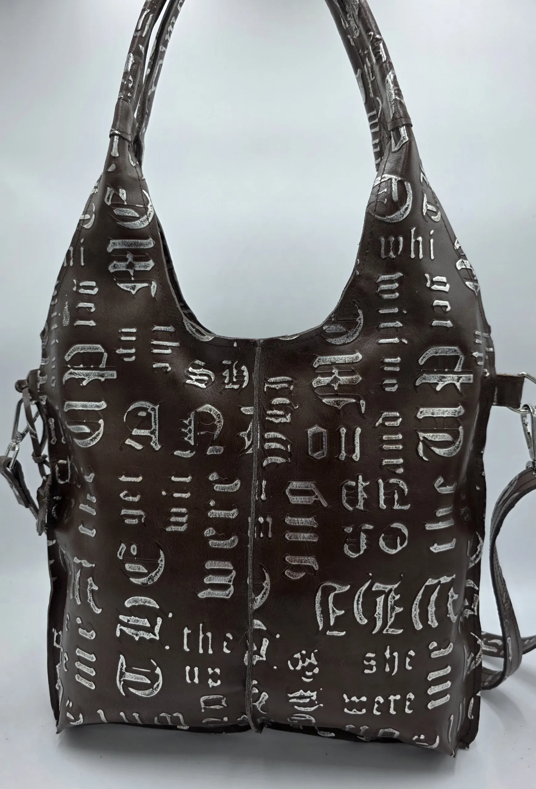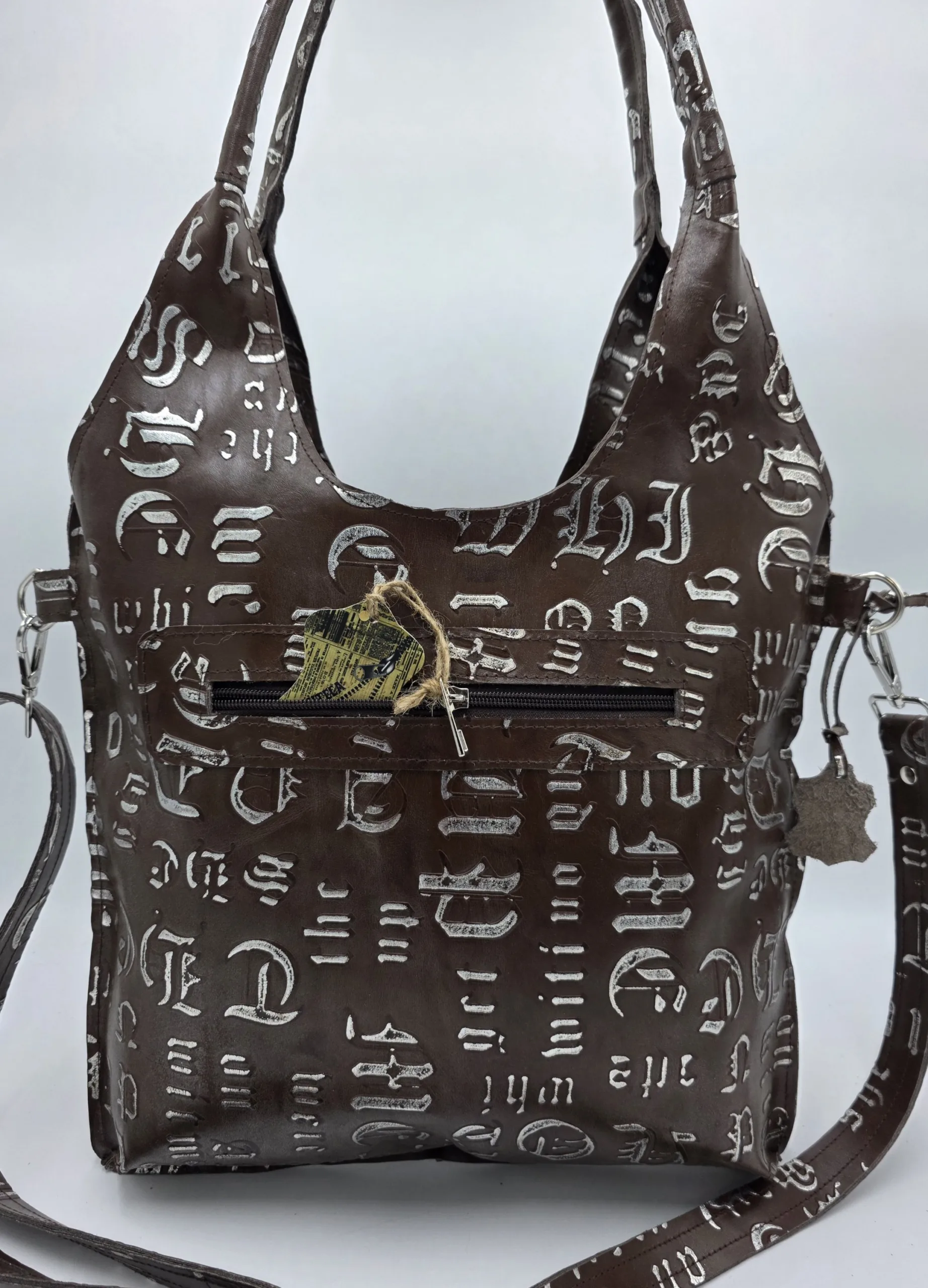 Ръчно изработена чанта с две дръжки 65см и допълнителна дълга регулираща се дръжка 150см, външен заден джоб с цип, закопчаване с цип, вътре със средна преграда с цип, джоб с цип и допълнителен джоб за телефон. Ширина 35см ,височина 30см ,няма оформено дъно.