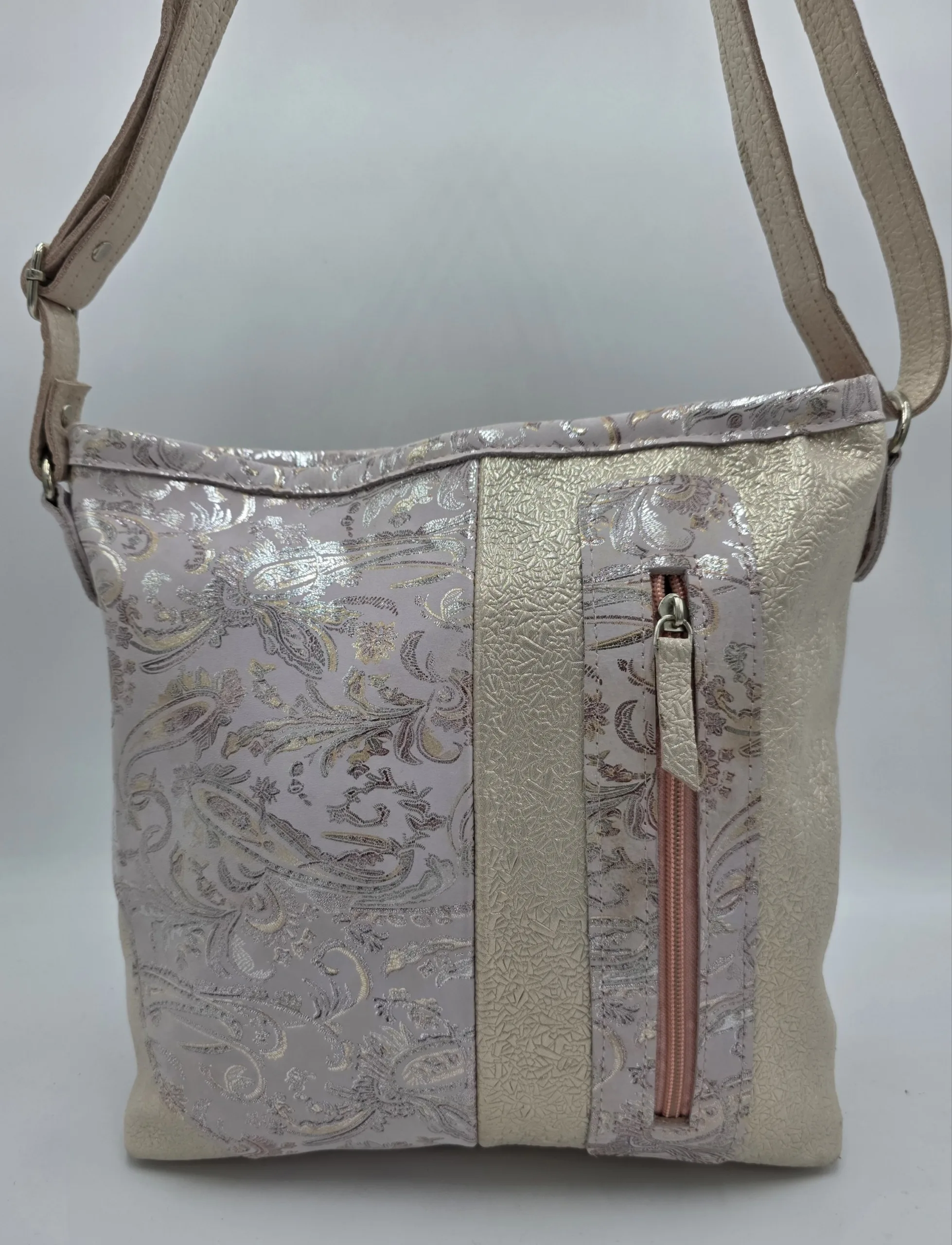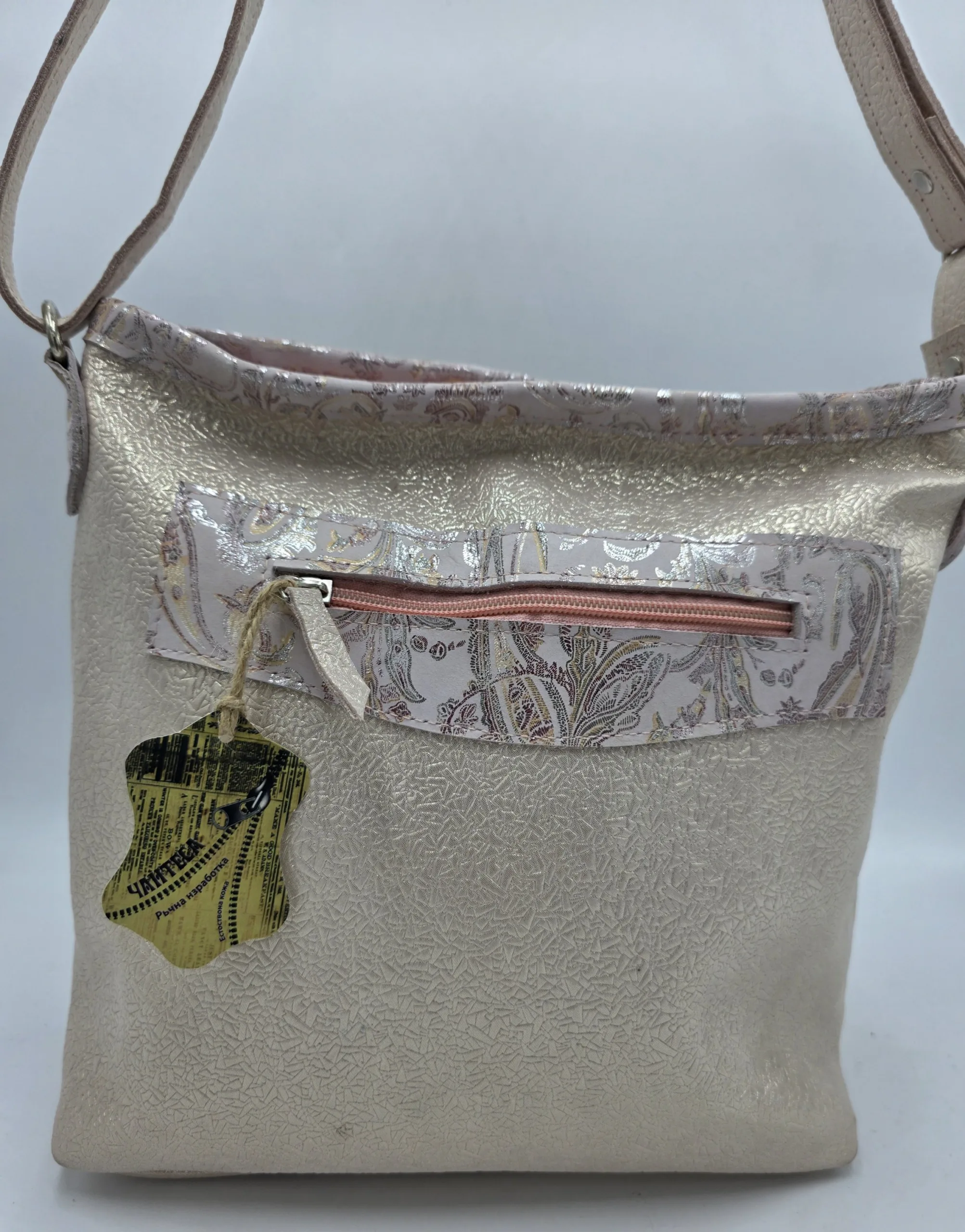 Чанта от естествена кожа с дълга регулираща се дръжка 150см, два външни джоба с цип, закопчаване с цип, вътре със средна преграда с цип, джоб с цип и допълнителен джоб за телефон. Ширина 33см,височина 28см,дъно 26см/9см