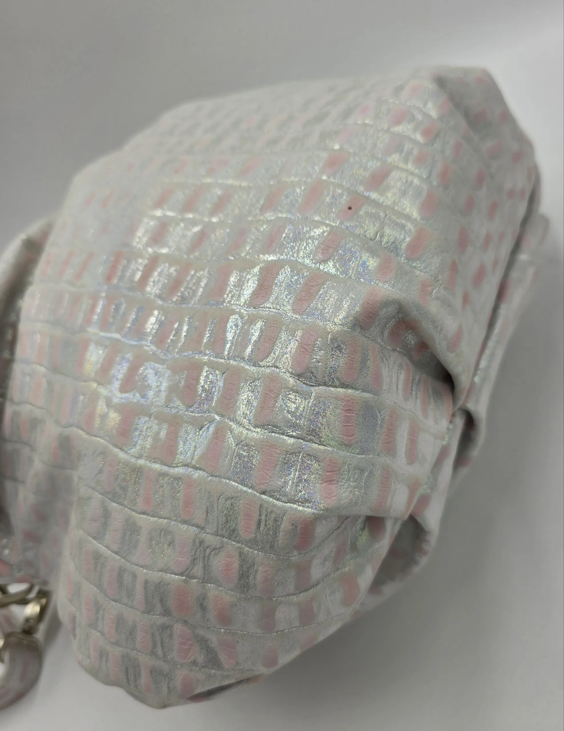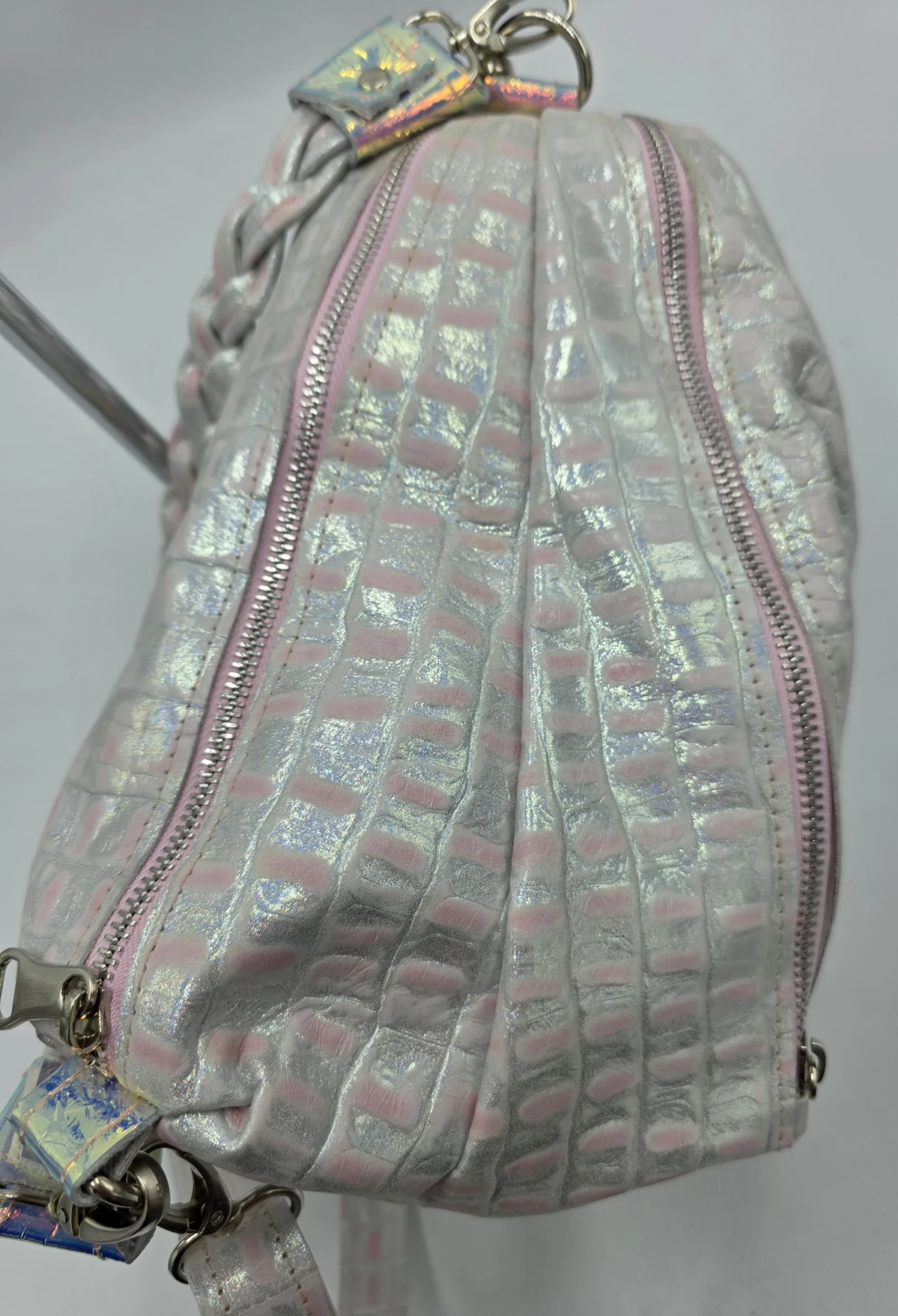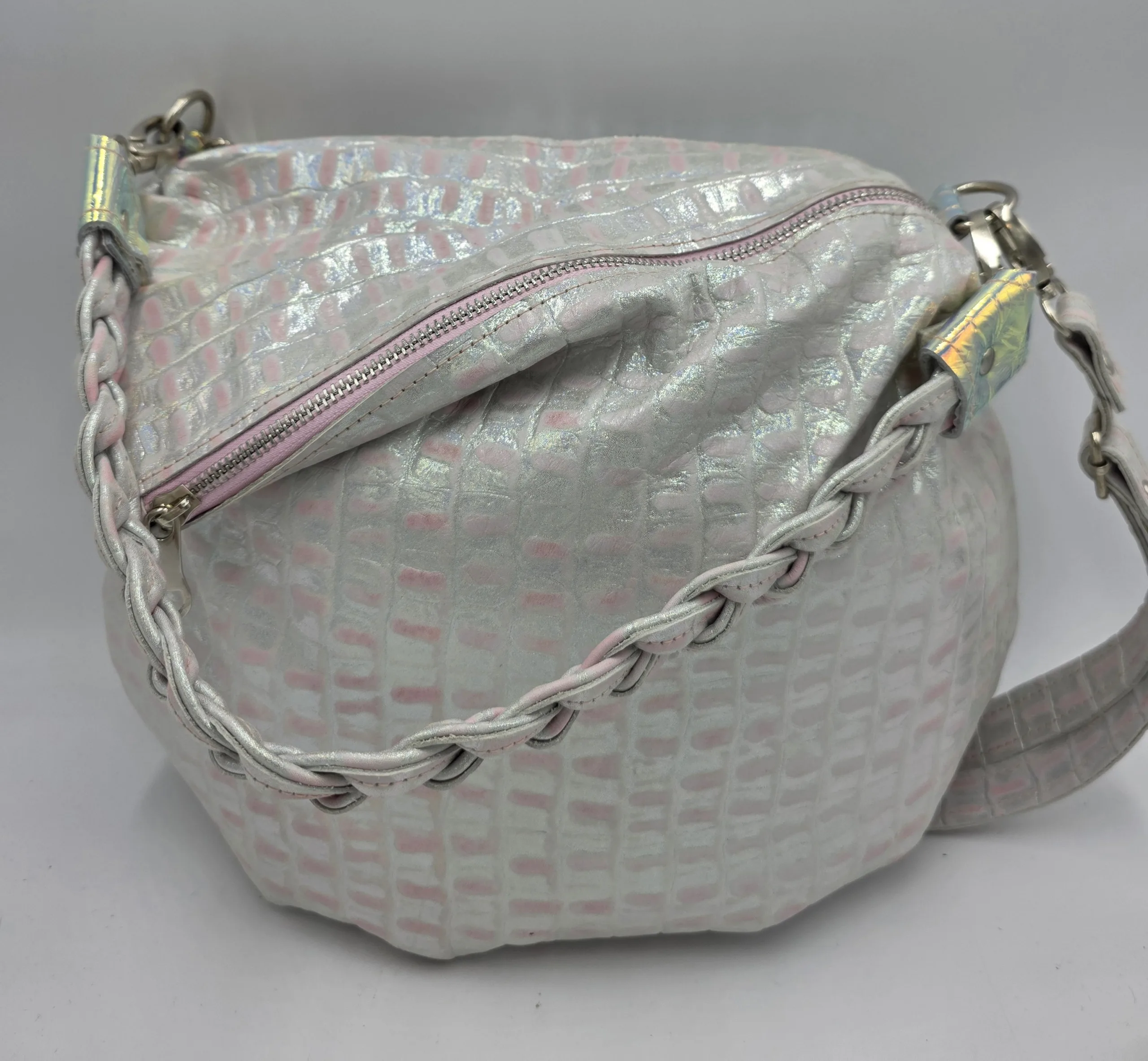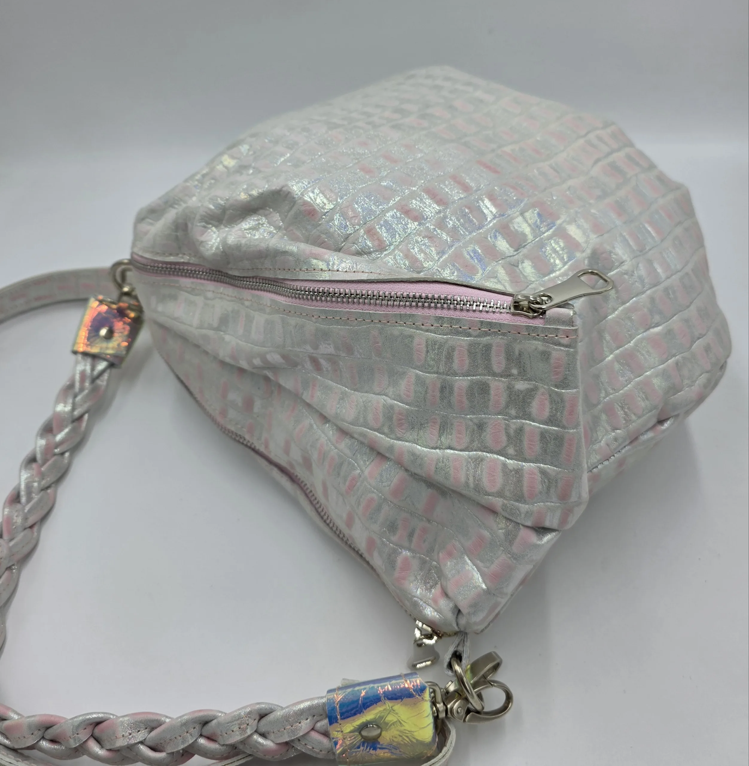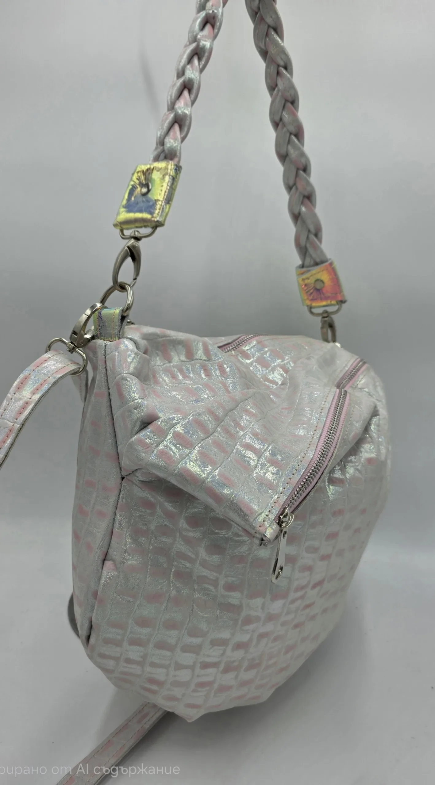 Чанта от естествена кожа в розово и сребро