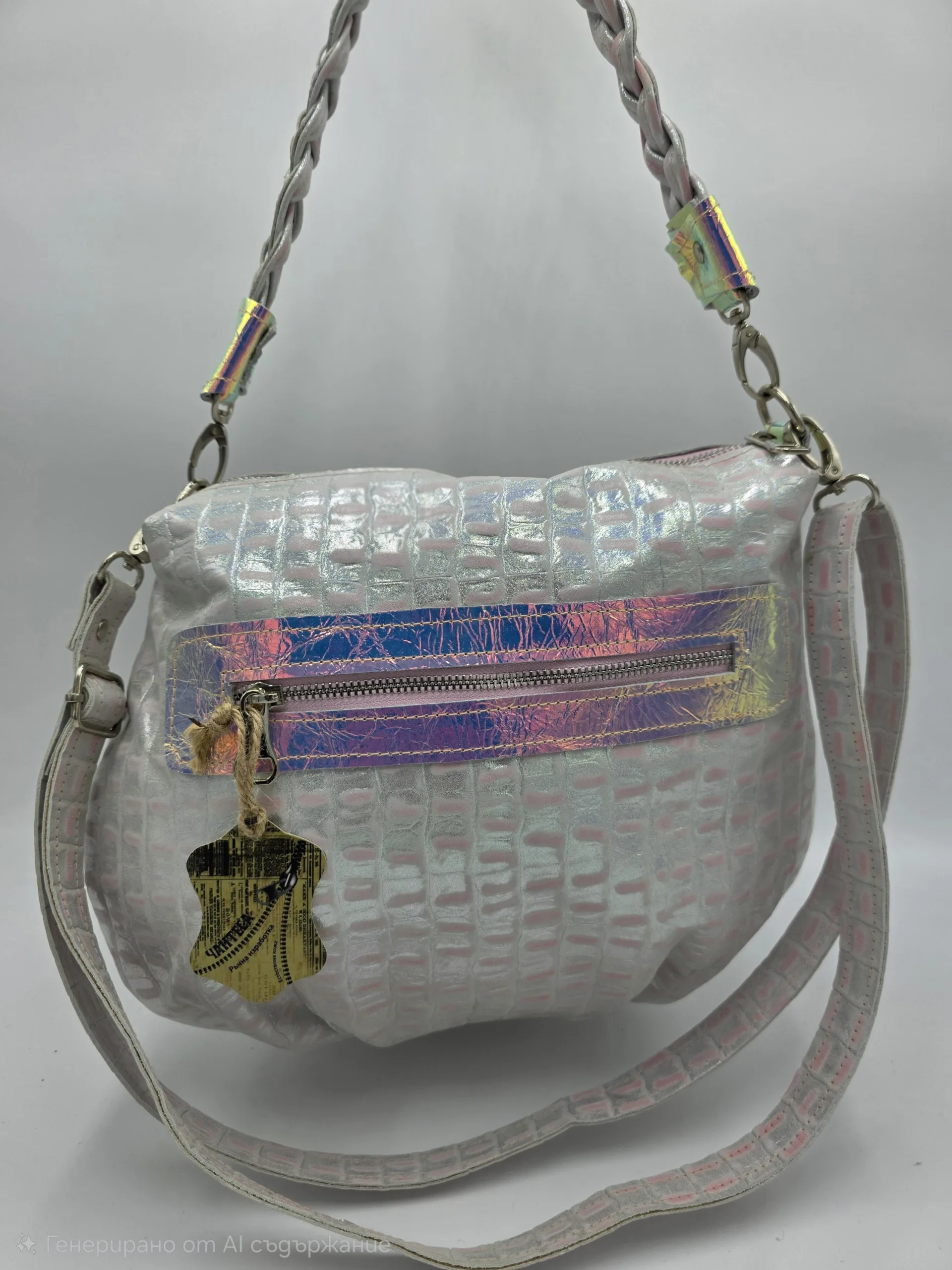 Супер нестандартна чанта от естествена кожа с две отделни прегради затварящи се с цип, едната пада напред асиметрично, заден външен джоб с цип, вътрешен джоб с цип и допълнителен джоб за телефон, с сменяеми дръжки, къса оплетена 54см, дълга регулираща се дръжка 150см.Ширина 35см,височина 33см,няма оформено дъно.