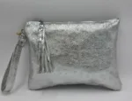 Чанта от естествена кожа ръчна изработка тип клъч,къса дръжка за китка , закопчаване с цип, вътрешен джоб с цип.Ширина 33см,височина 24см.