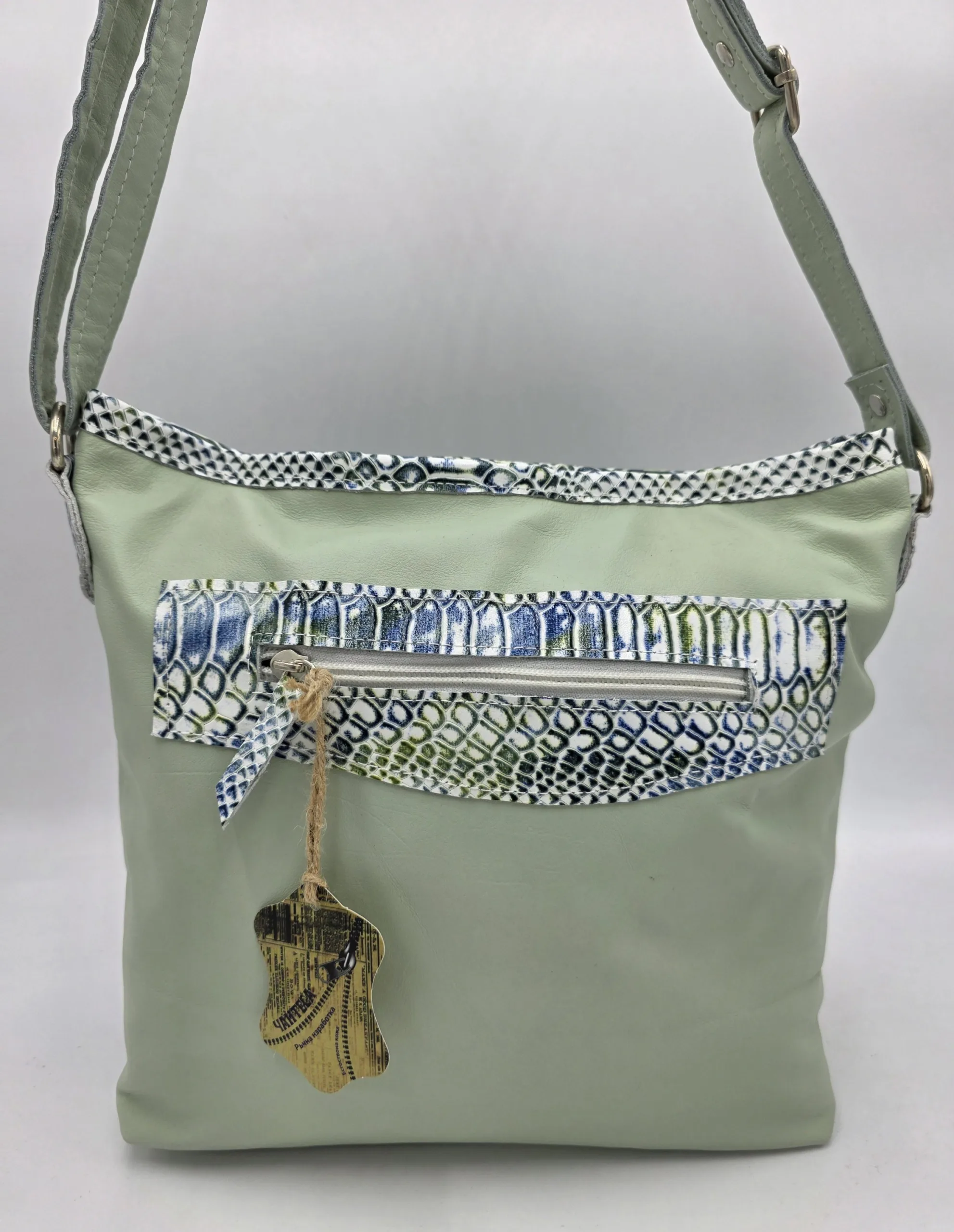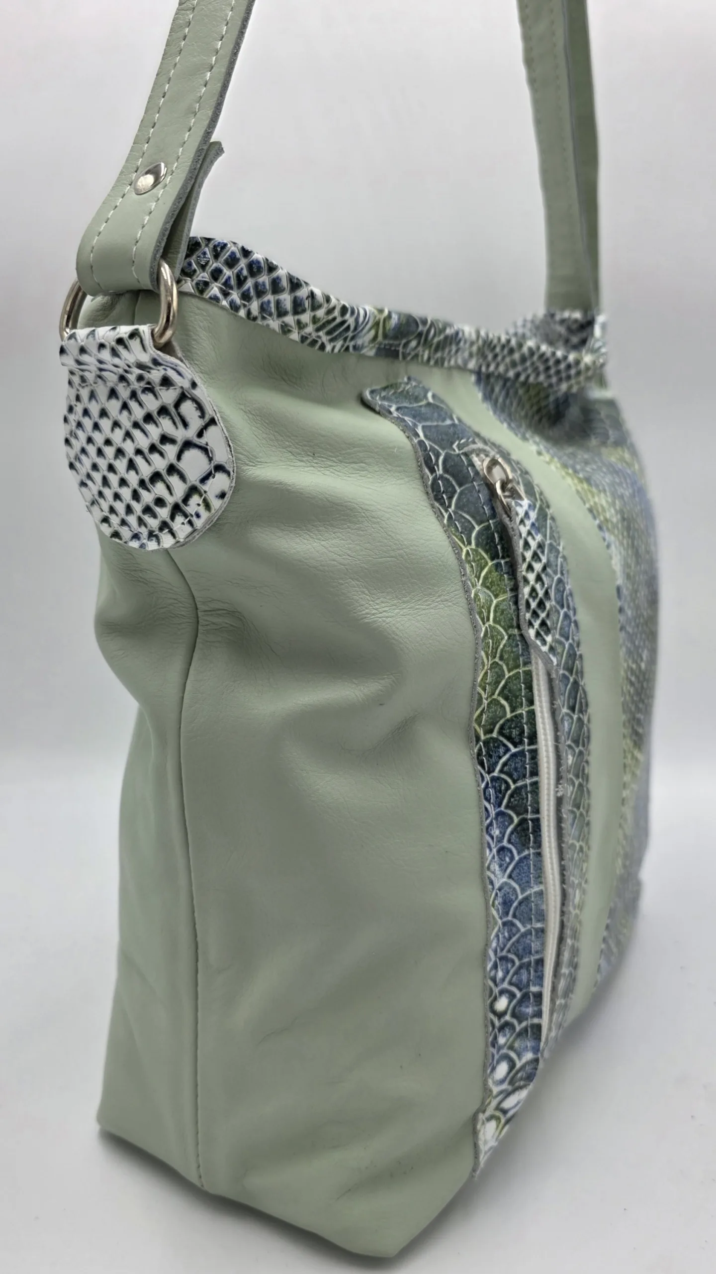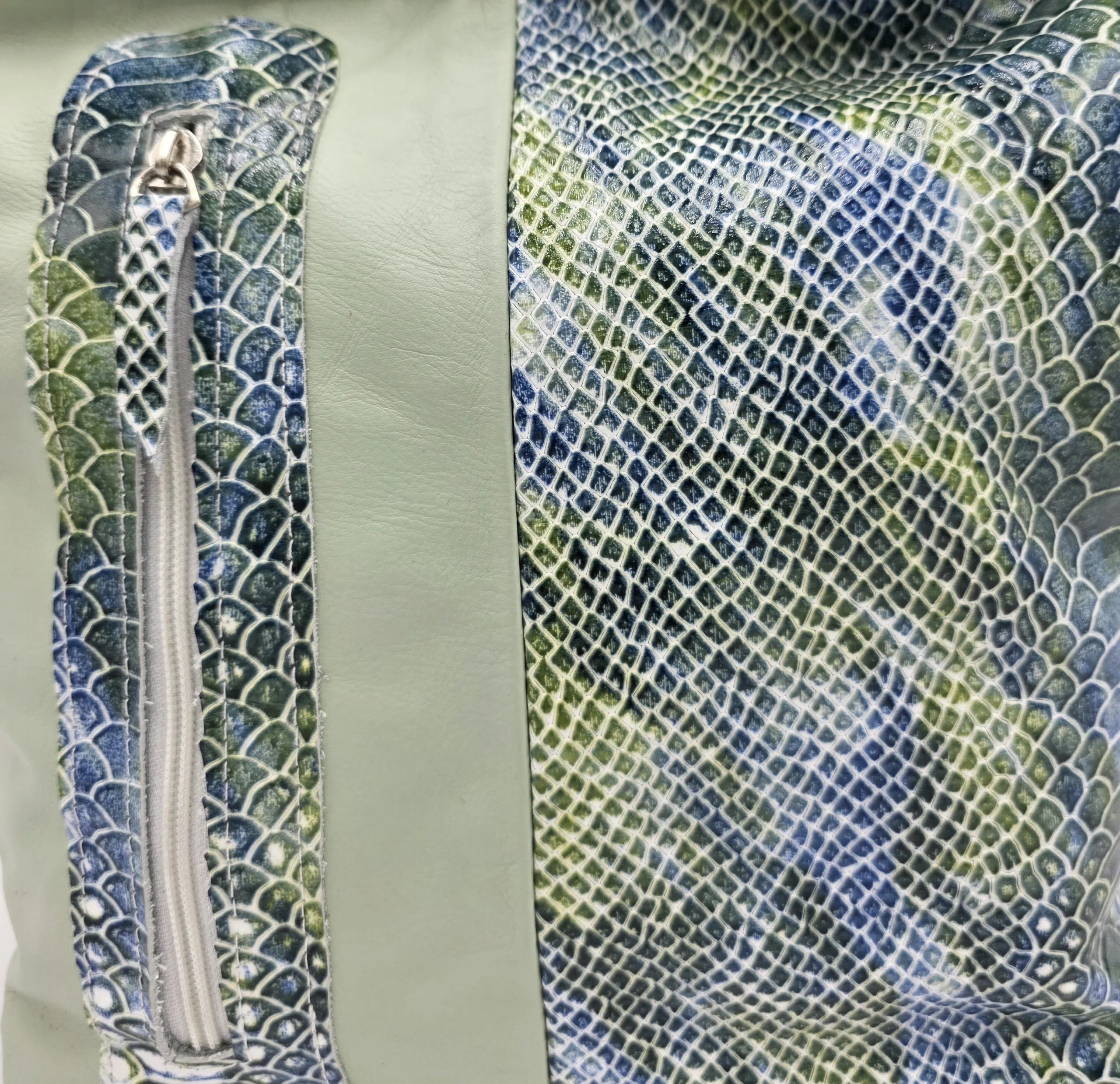 Чанта от естествена кожа в зелено и зелен змийски принт