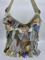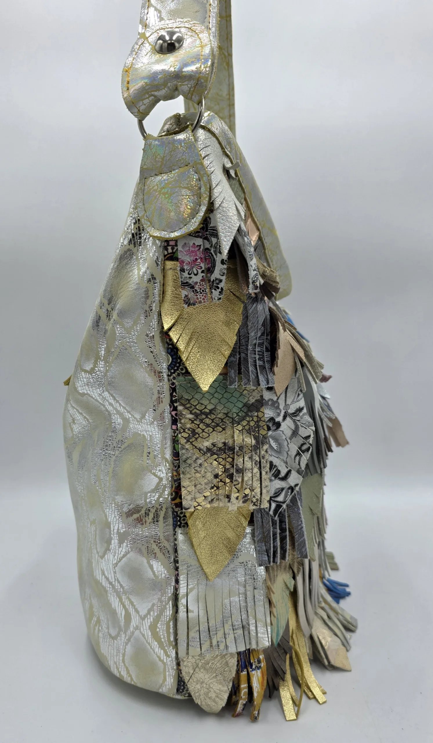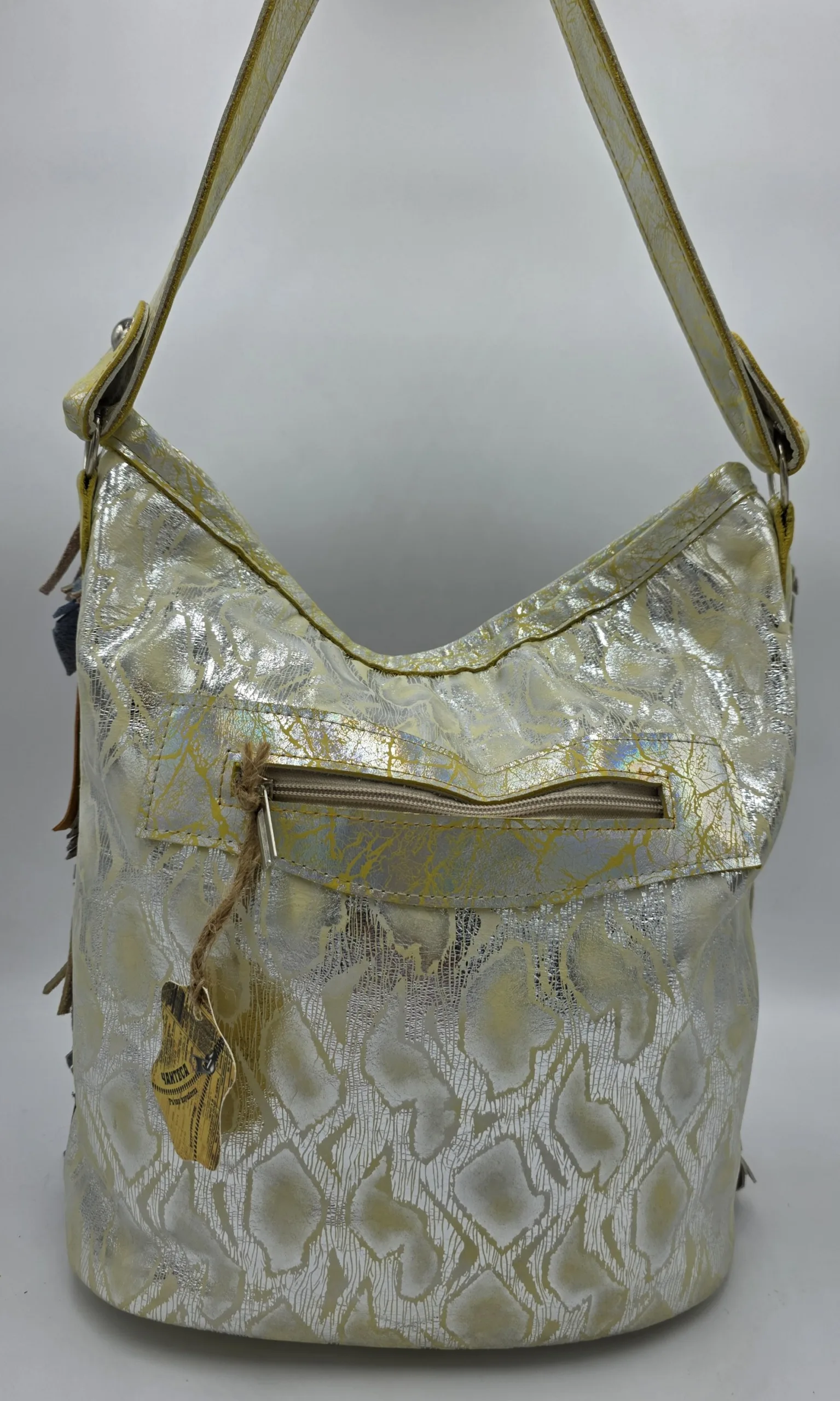 Уникална чанта от естествена кожа, ръчна изработка с една дръжка 57см , външен джоб с цип, закопчаване с цип, вътре със средна преграда с цип, вътрешен джоб с цип и допълнителен джоб за телефон. Ширина 36см,височина 32см,овално дъно 29см/15см
