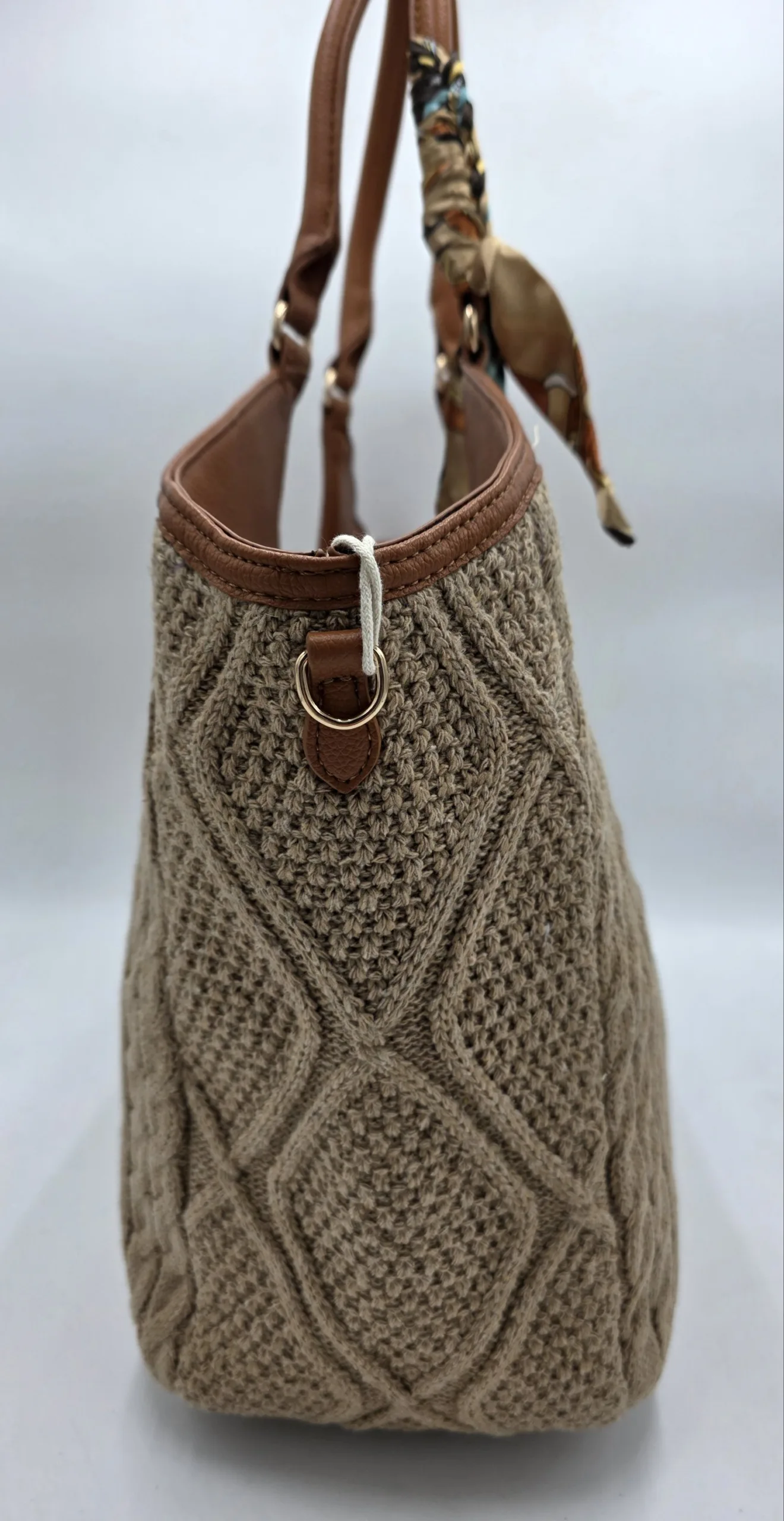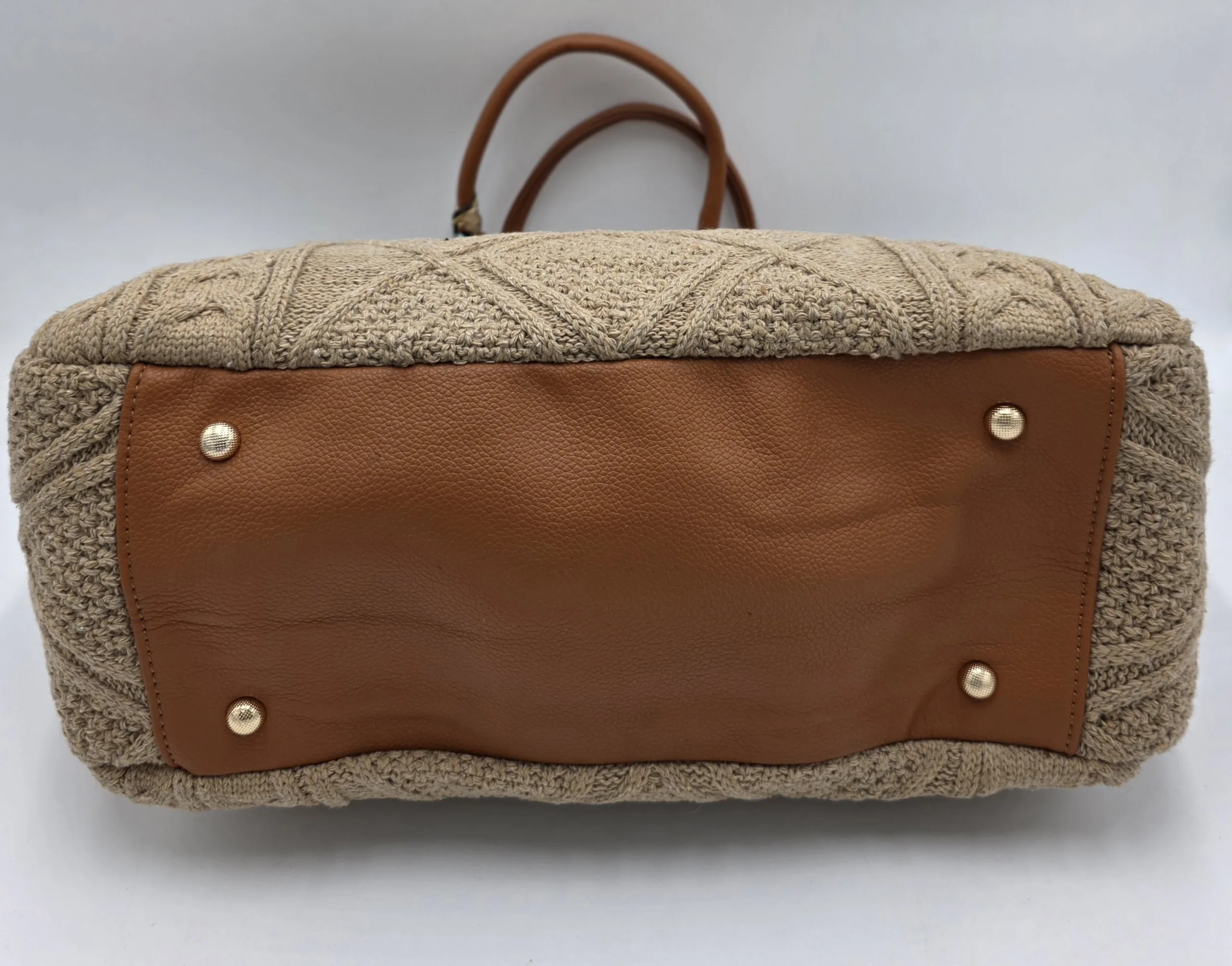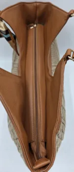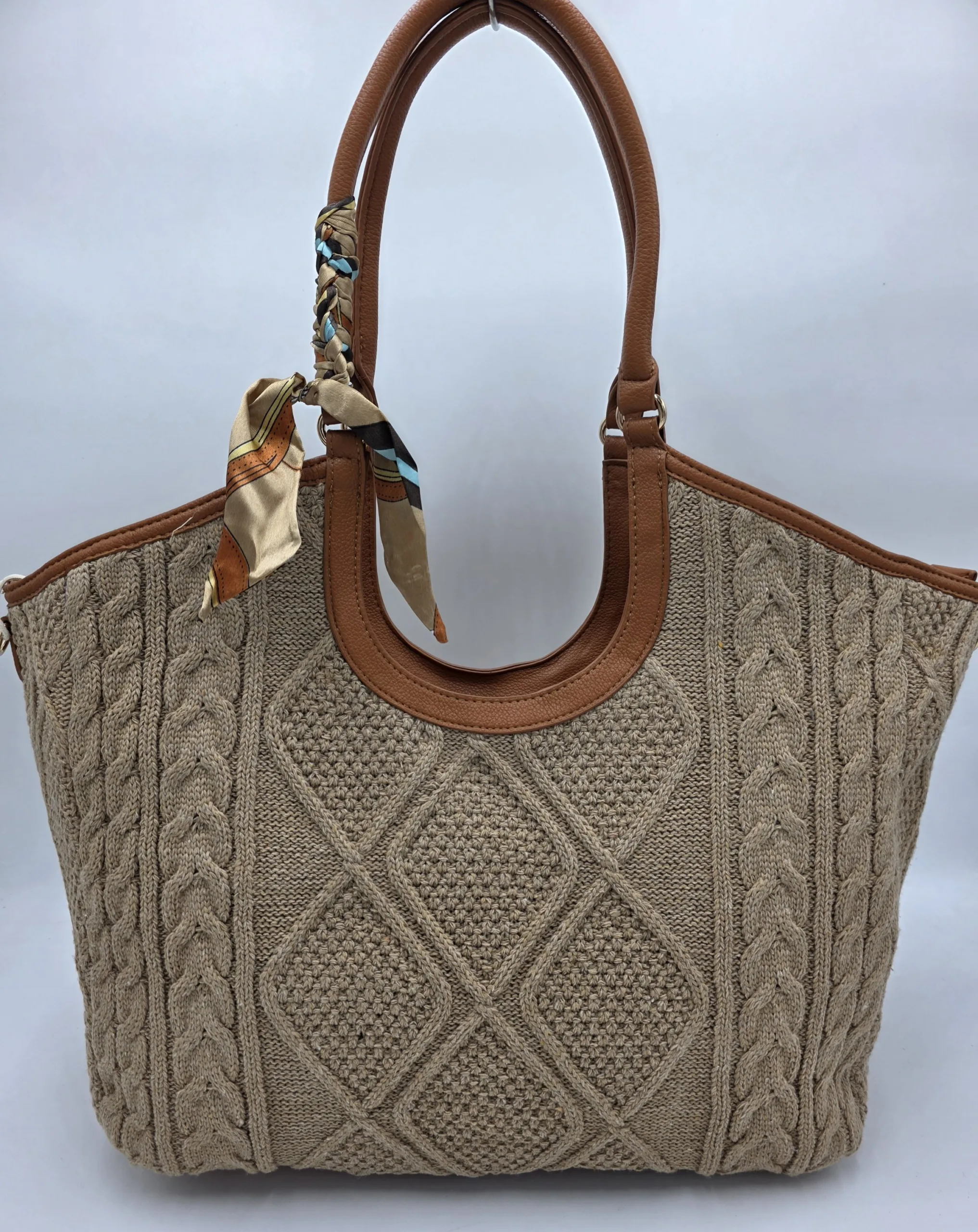 Голяма твърда плетена чанта с две дръжки 64см,закопчаване с цип, вътре със средна преграда с цип, джоб с цип и допълнителни джобове за телефон, дълга регулираща се дръжка 150см, ширина 52см, височина 35см,дъно 35см/14см.