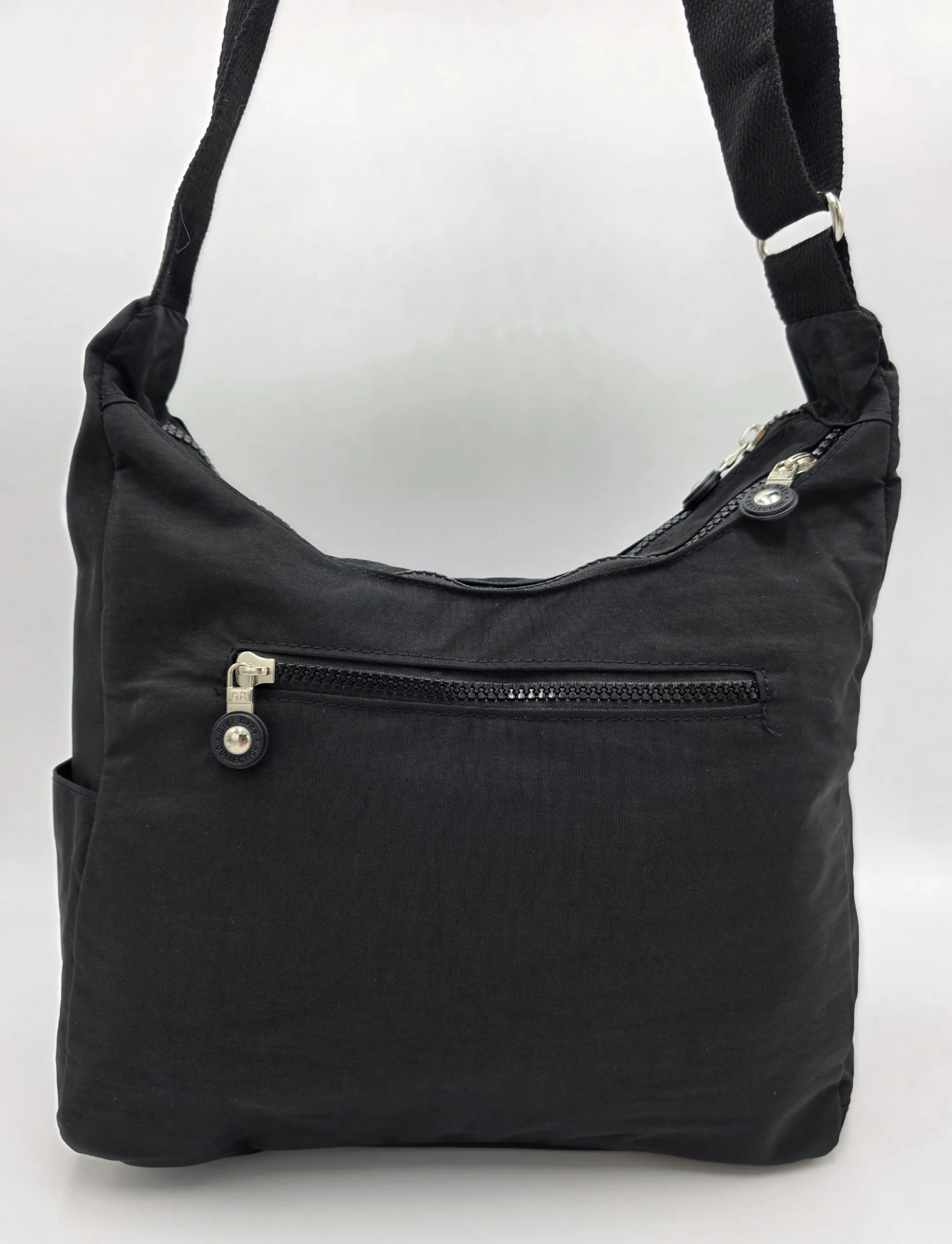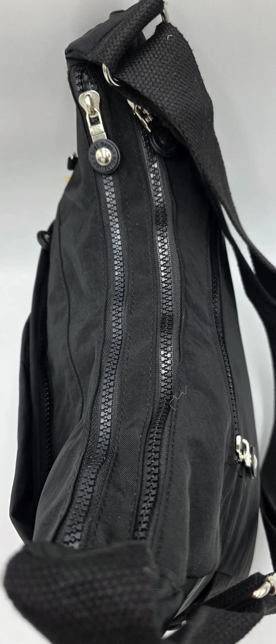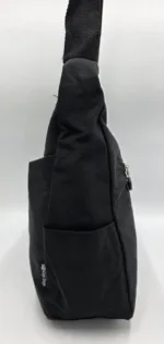 Текстилна чанта с две отделни прегради затварящи се с цип, три предни джоба, двата с цип, един с лепка,заден външен джоб с цип, вътрешен джоб с цип, допълнителни джобове за телефон, дълга текстилна регулираща се дръжка 150см, ширина 33см, височина 26см, дъно 30см/12см.