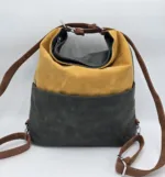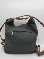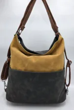 Чанта раница от еко набук в два цвята с голям преден джоб с цип ,заден външен джоб с цип, вътре със средна преграда, вътрешен джоб с цип и допълнителни джобове за телефон. Дължина на дръжки 90см/регулиращи/,ширина 40см,височина 36см,дъно 32см/12см