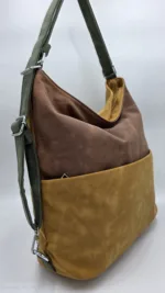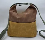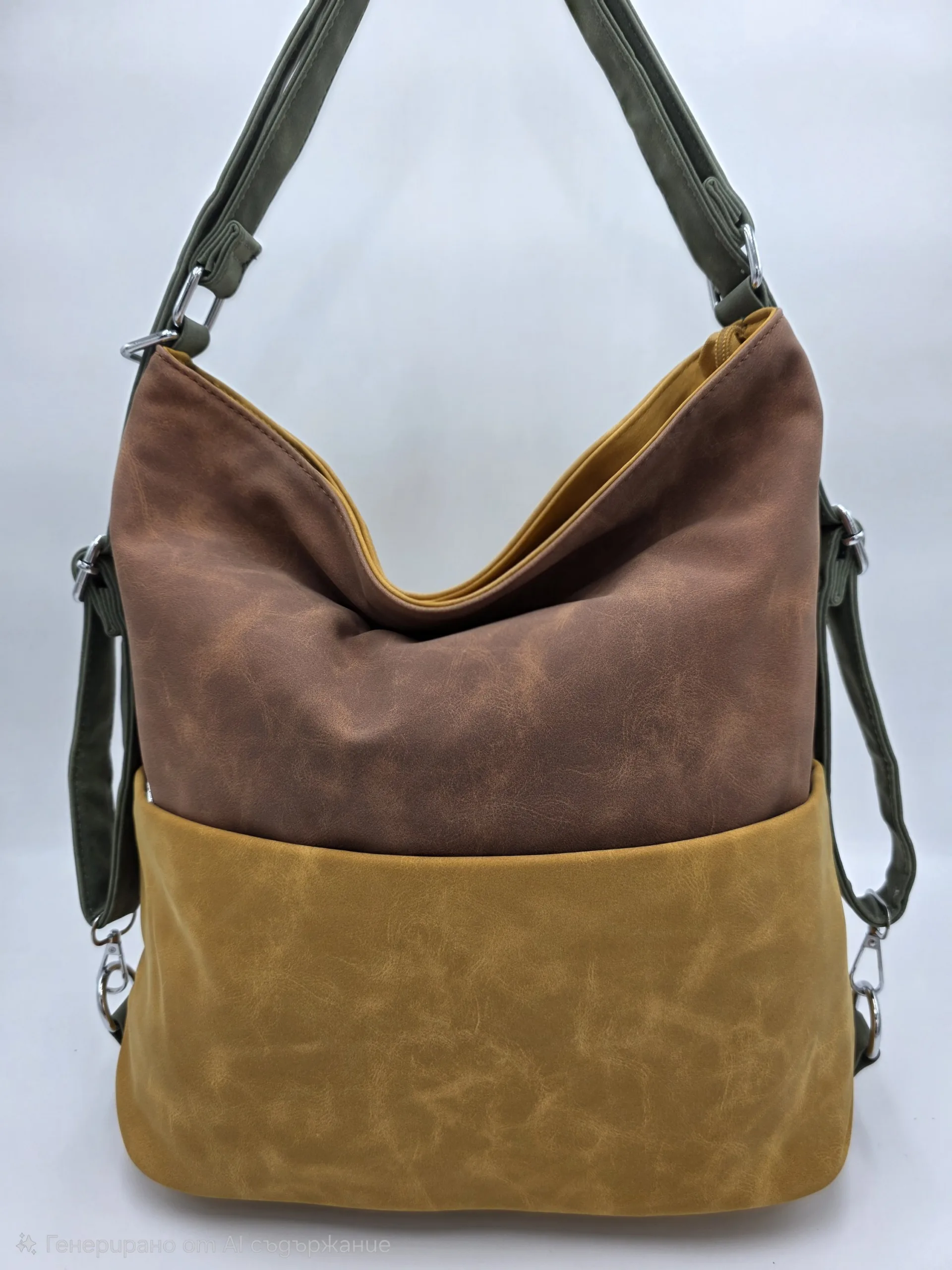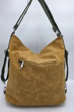 Чанта раница от еко набук в два цвята с голям преден джоб с цип ,заден външен джоб с цип, вътре със средна преграда, вътрешен джоб с цип и допълнителни джобове за телефон. Дължина на дръжки 90см/регулиращи/,ширина 40см,височина 36см,дъно 32см/12см