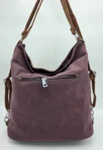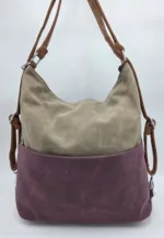 Чанта раница от еко набук в два цвята с голям преден джоб с цип ,заден външен джоб с цип, вътре със средна преграда, вътрешен джоб с цип и допълнителни джобове за телефон. Дължина на дръжки 90см/регулиращи/,ширина 40см,височина 36см,дъно 32см/12см