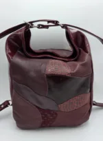 Уникална чанта раница от еко кожа с лице от естествена кожа, две дръжки дължина 90см,външен заден джоб с цип, вътре със средна преграда с цип, вътрешен джоб с цип и допълнителен джоб за телефон. Ширина 26см височина 31см,странично 15см,дъно 24см/15см.