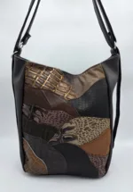 Уникална чанта раница от еко кожа с лице от естествена кожа, две дръжки дължина 90см,външен заден джоб с цип, вътре със средна преграда с цип, вътрешен джоб с цип и допълнителен джоб за телефон. Ширина 26см височина 31см,странично 15см,дъно 24см/15см.