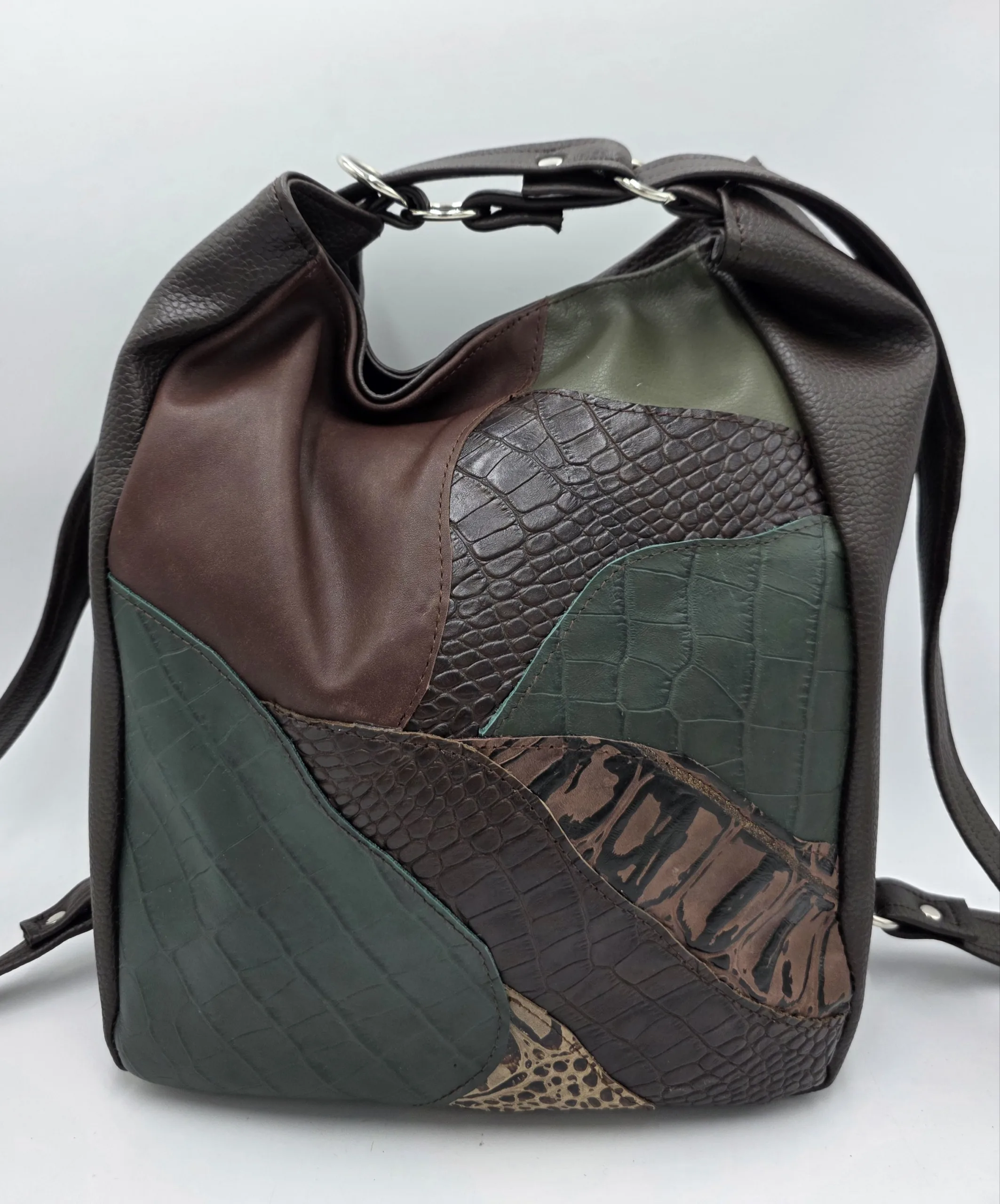 Чанта раница от еко кожа с елементи от естествена кожа в кафяво и зелено