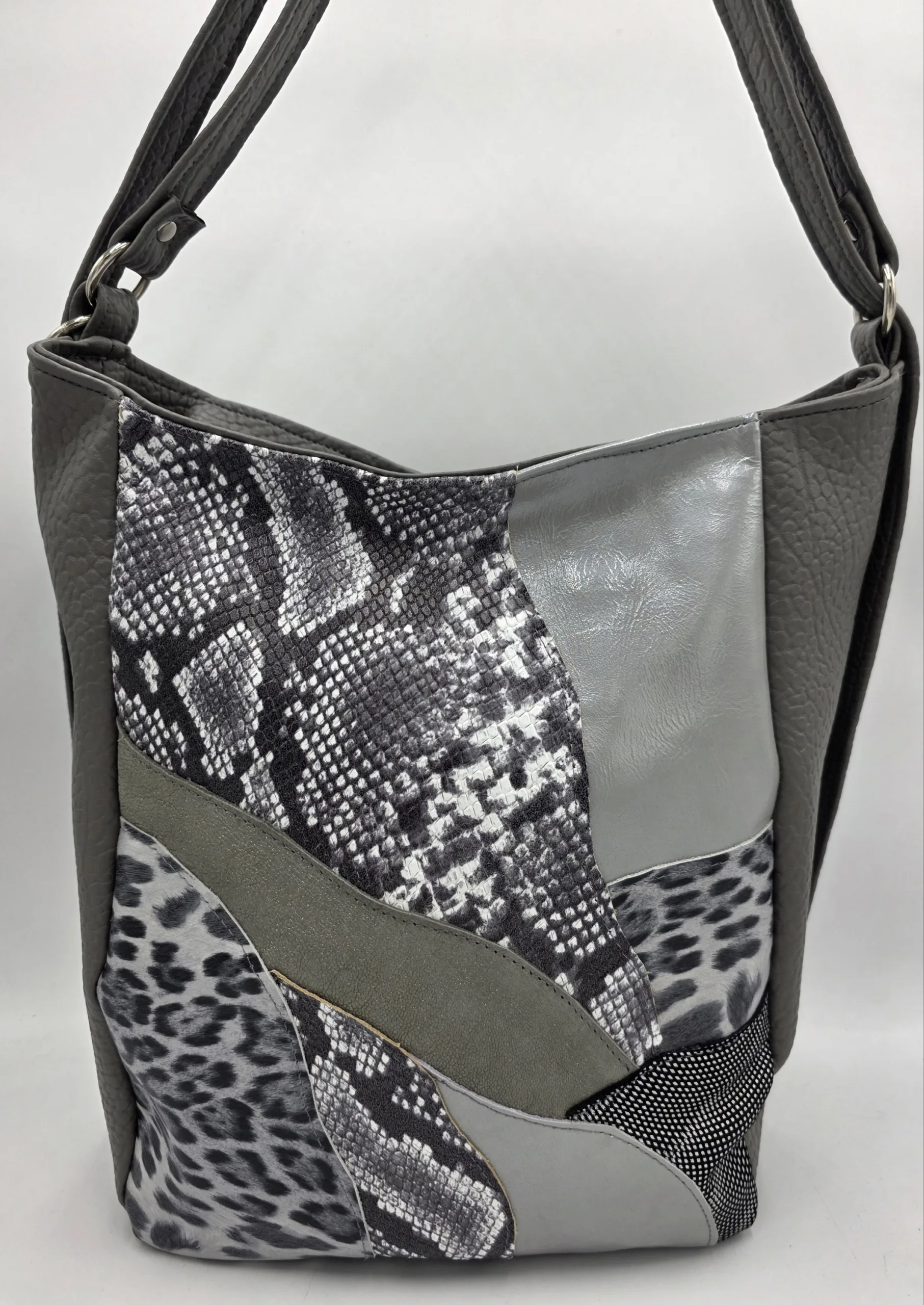 Чанта от еко кожа съчетание с еко велур, две дръжки 45см,двете прегради затварящи се с общ цип, вътрешен заден джоб