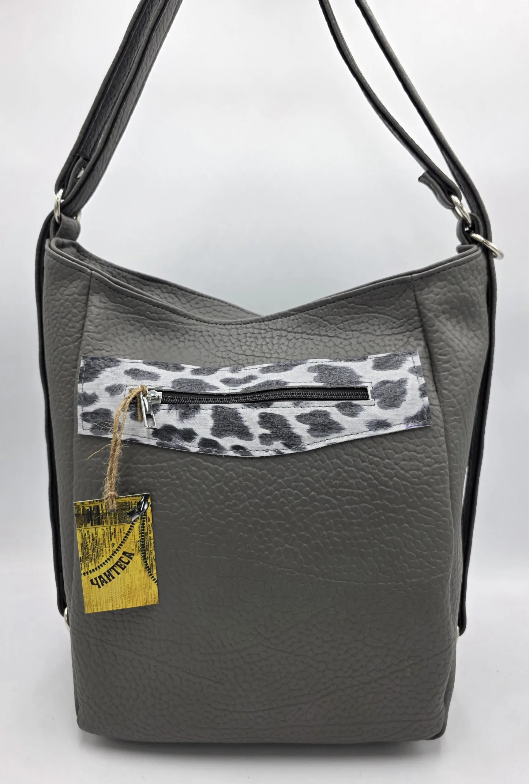 Уникална чанта раница от еко кожа с лице от естествена кожа, две дръжки дължина 90см,външен заден джоб с цип, вътре