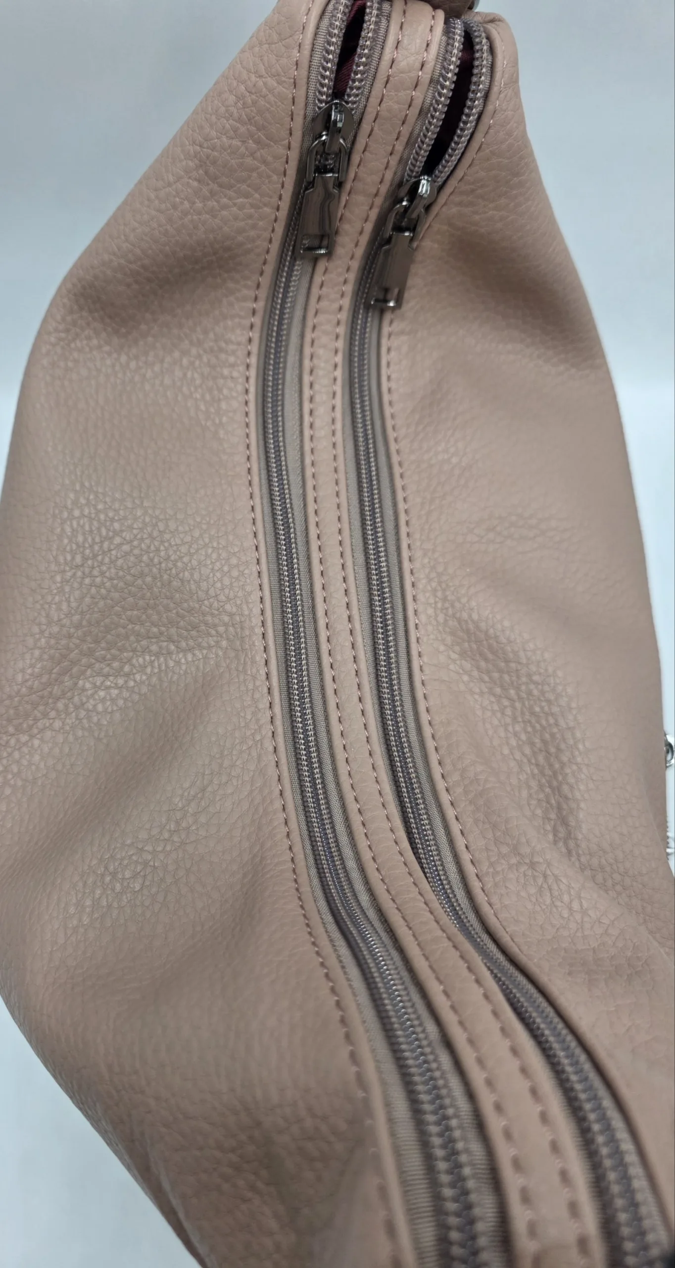 Чанта раница от еко кожа с две отделни прегради затварящи се с цип, три предни джоба с цип, външен заден джоб с цип, вътрешен джоб с цип и допълнителни джобове за телефон, регулиращи се дръжки 95см,ширина 43см, височина 36см,дъно 33см/12см