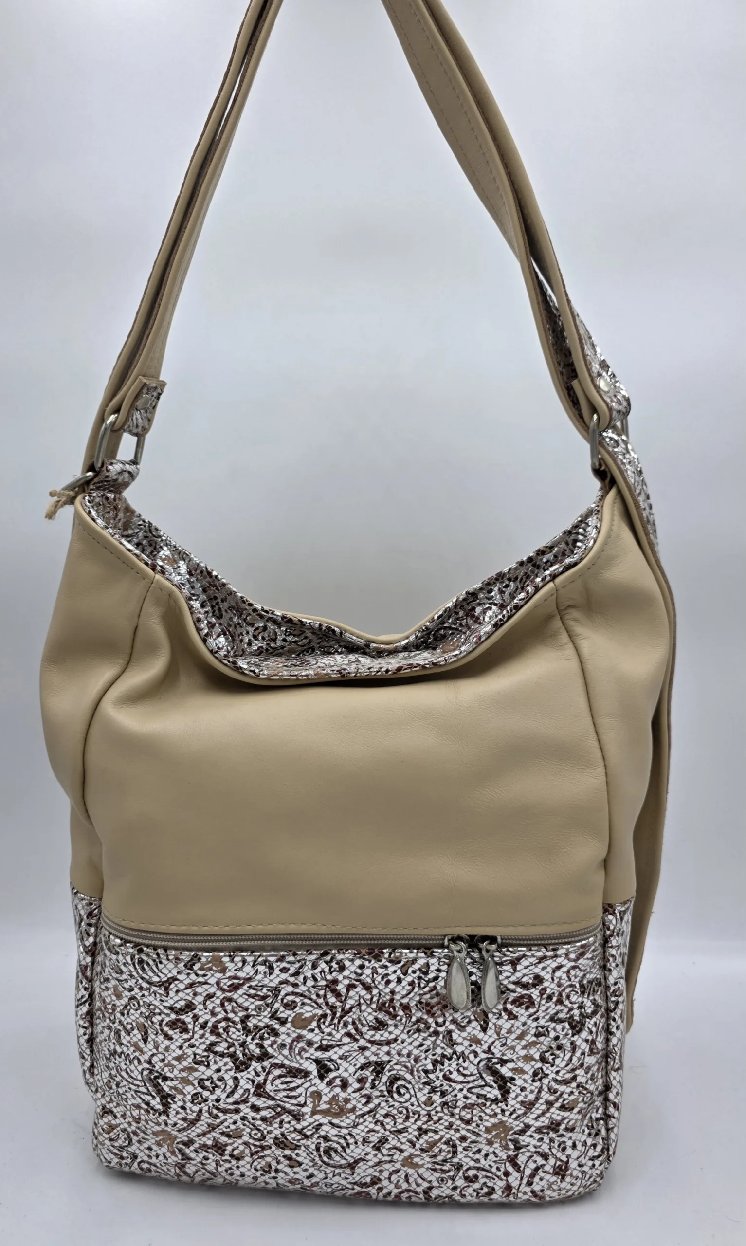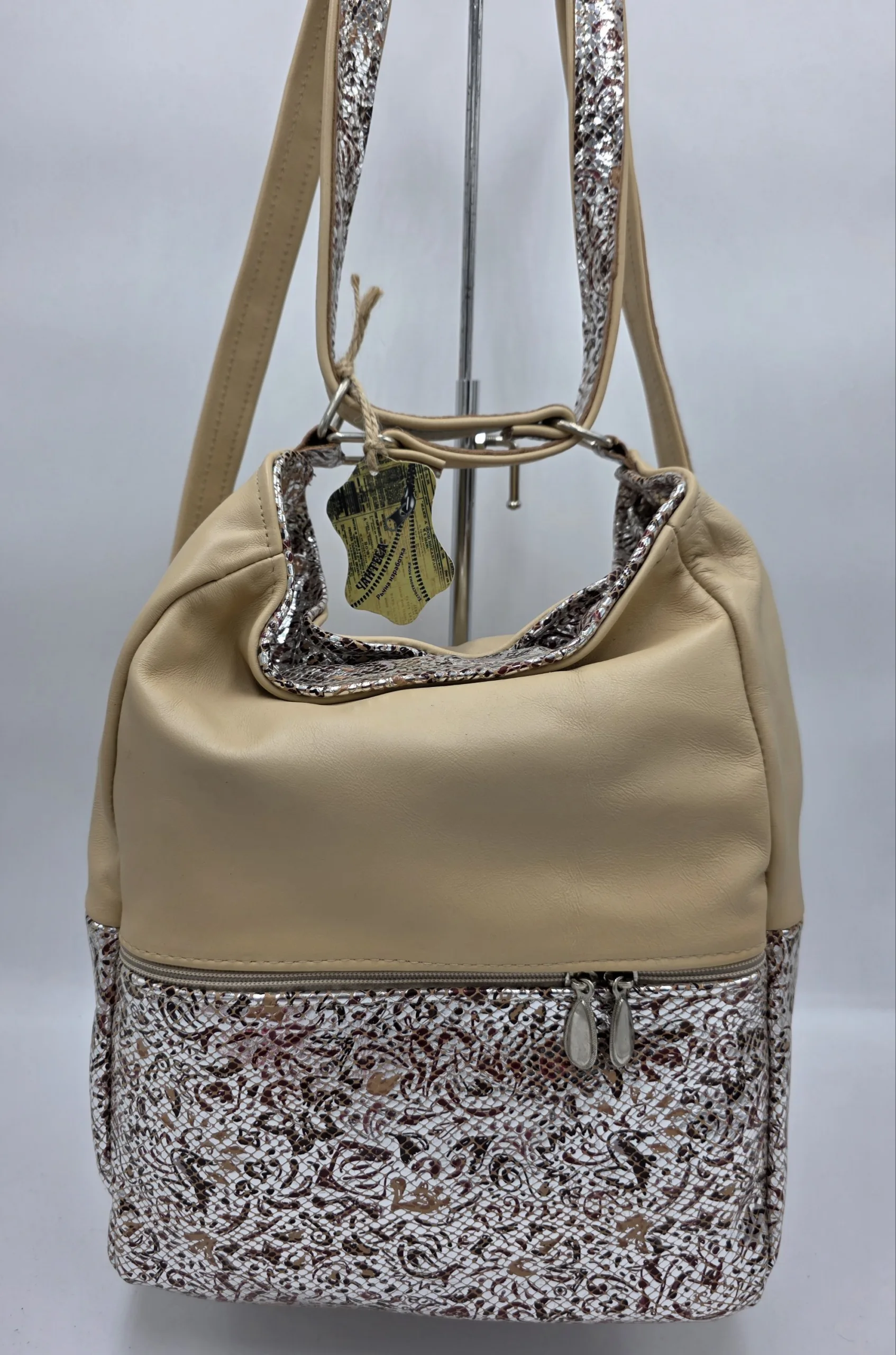 Уникална чанта раница от естествена кожа ръчна изработка с две дръжки 90см, с два големи външни джоба отпред и отзад, закопчаване с цип ,вътре със средна преграда с цип, вътрешен джоб с цип и допълнителен джоб за телефон. Ширина 30см,височина 30см,дъно 26см/15см