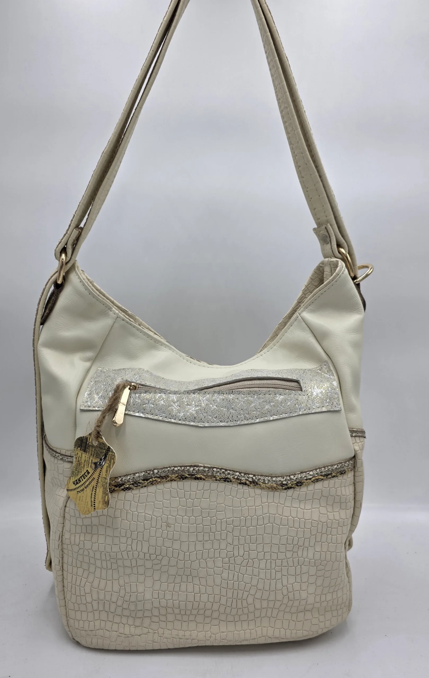 Уникална чанта раница от естествена кожа ръчна изработка с две дръжки 90см, с външен заден джоб с цип , закопчаване с цип ,вътре със средна преграда с цип, вътрешен джоб с цип и допълнителен джоб за телефон. Ширина 30см,височина 30см,дъно 26см/15см