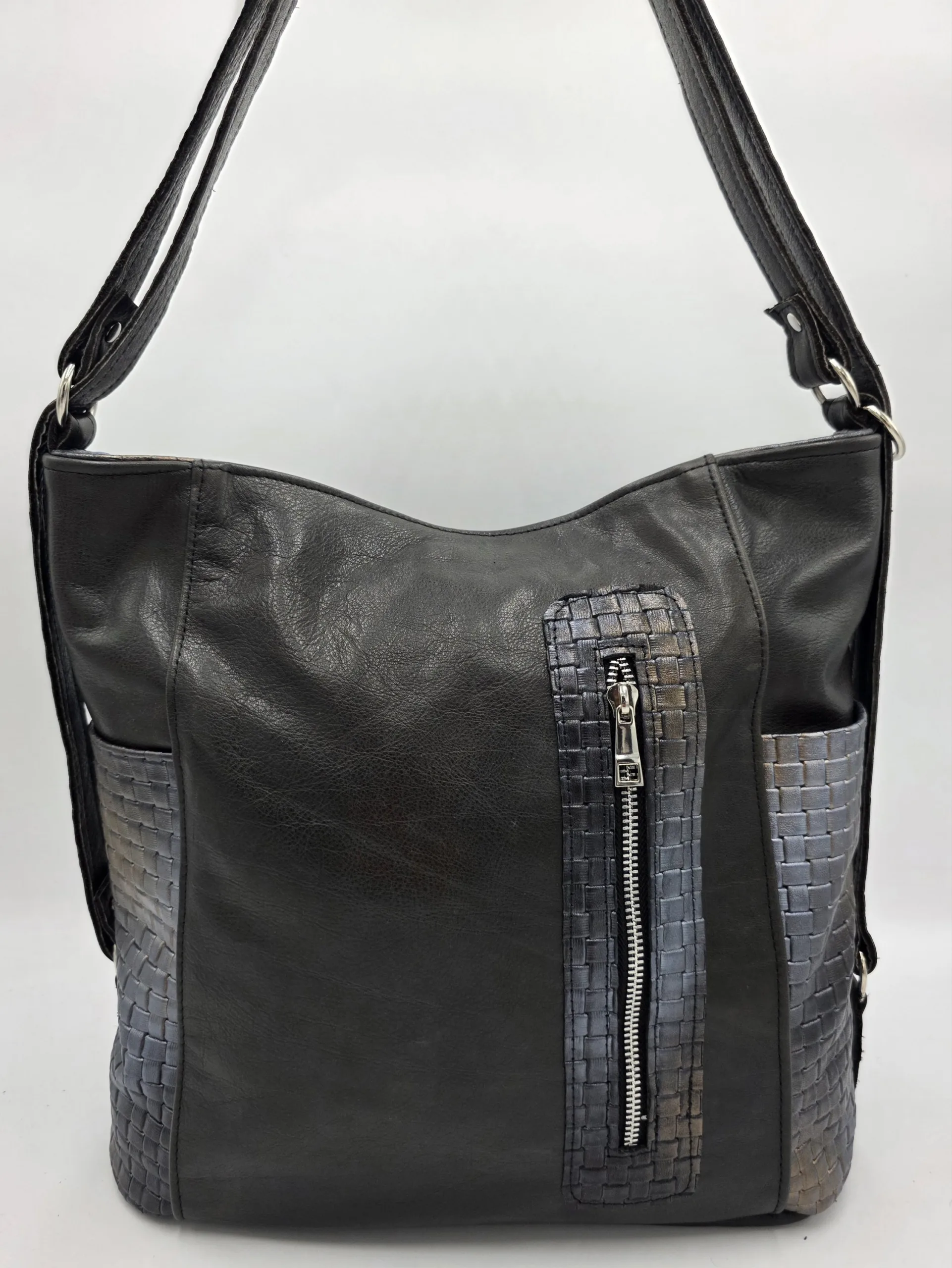 Уникална чанта раница от естествена кожа ръчна изработка с две дръжки 90см, с два големи външни джоба отпред и отзад,