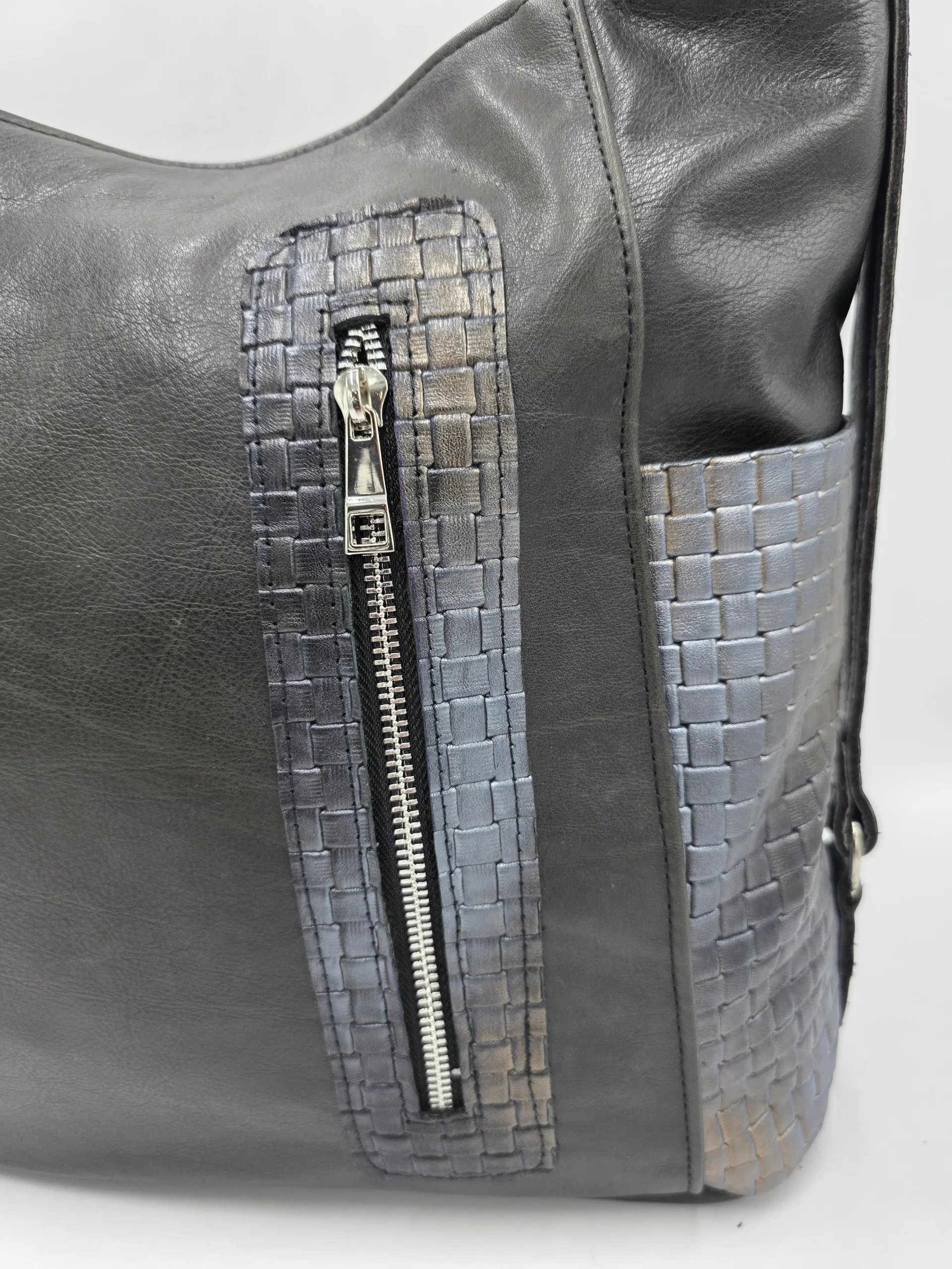 Чанта раница от естествена кожа ръчно изработена с две дръжки 90см,преден външен джоб с цип, заден външен джоб с цип, два странични, вътре със средна преграда с цип, джоб с цип и допълнителен джоб за телефон. Ширина 35см, височина 33см, дъно 35см/13см