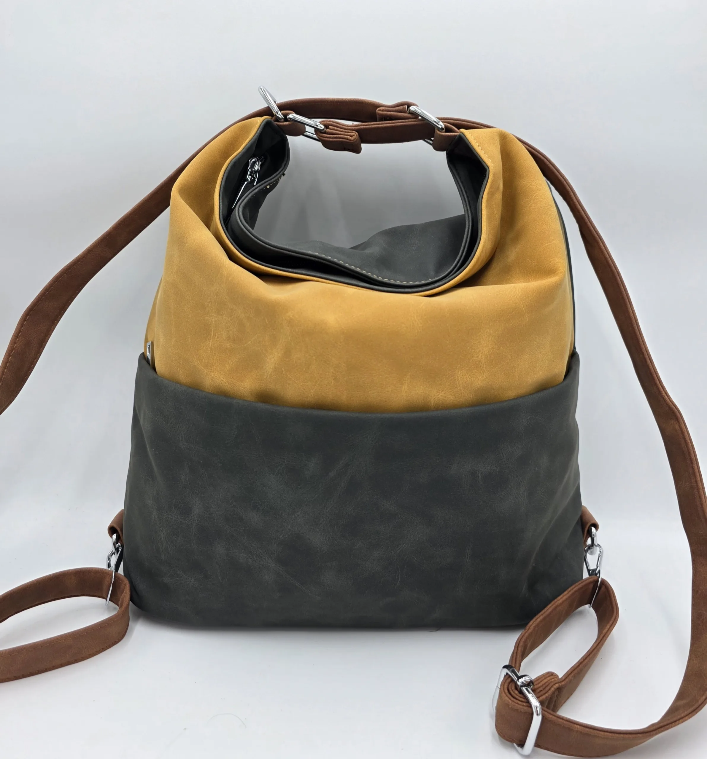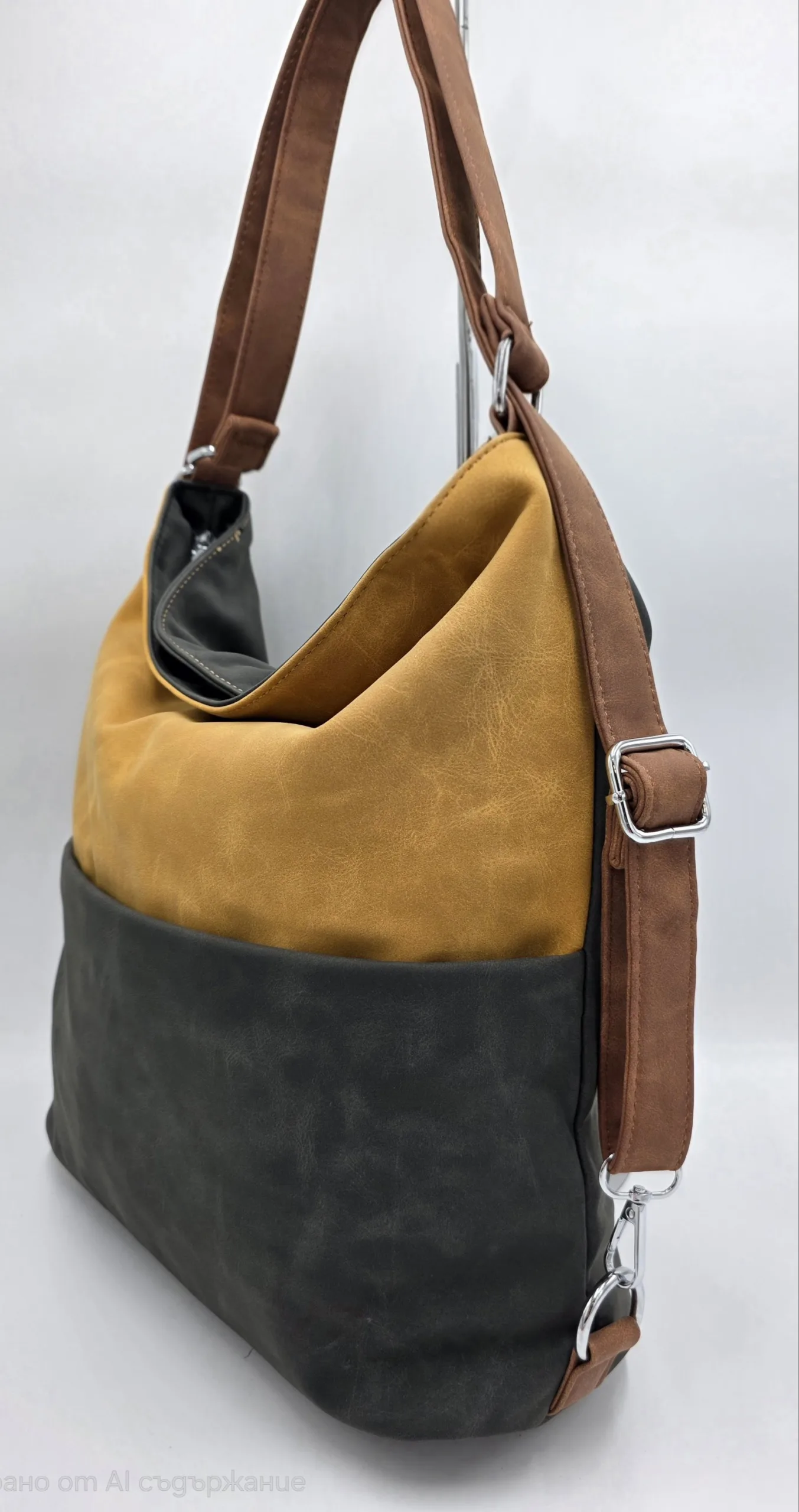 Чанта раница от еко набук в два цвята с голям преден джоб с цип ,заден външен джоб с цип, вътре със средна преграда, вътрешен джоб с цип и допълнителни джобове за телефон. Дължина на дръжки 90см/регулиращи/,ширина 40см,височина 36см,дъно 32см/12см