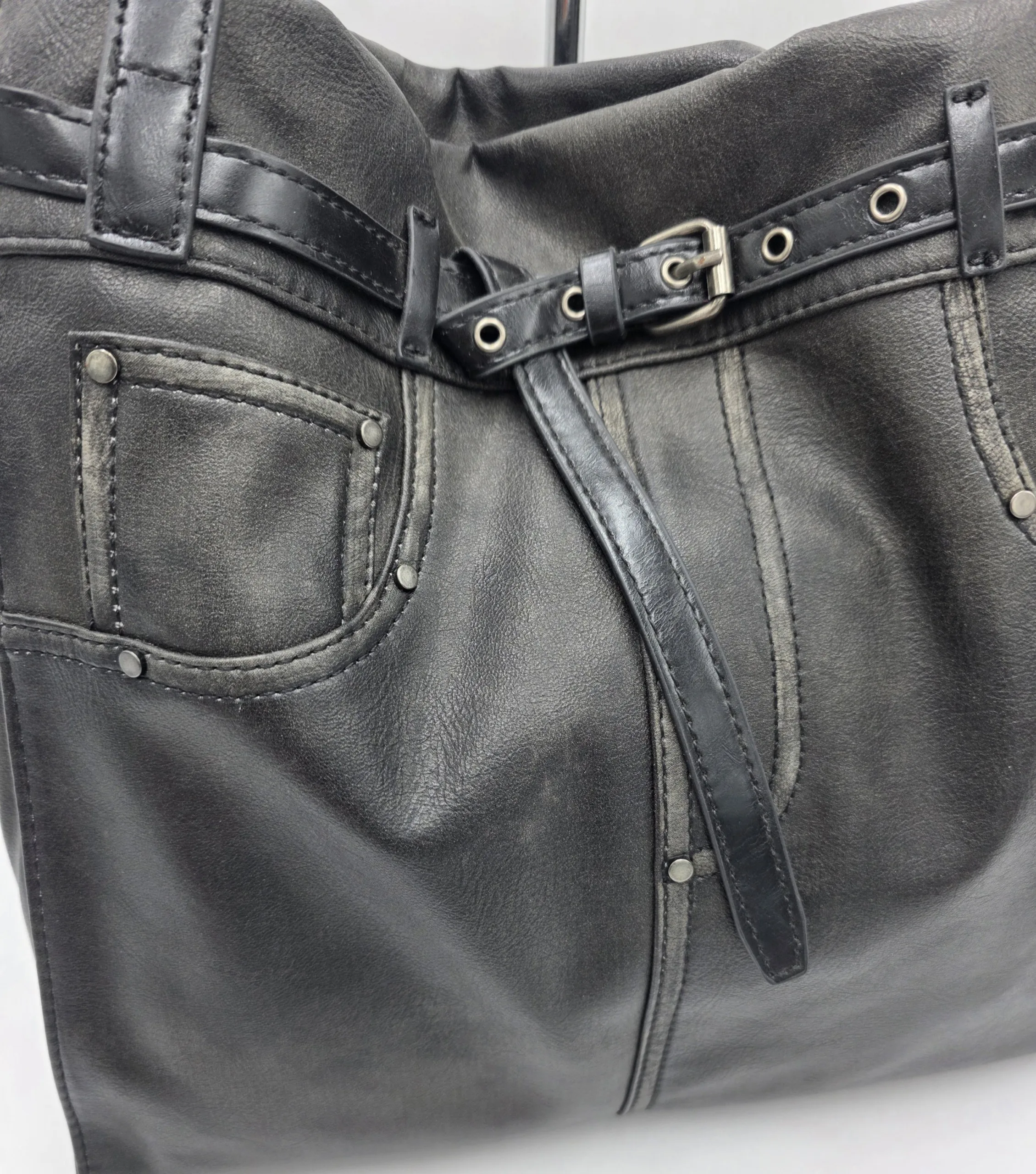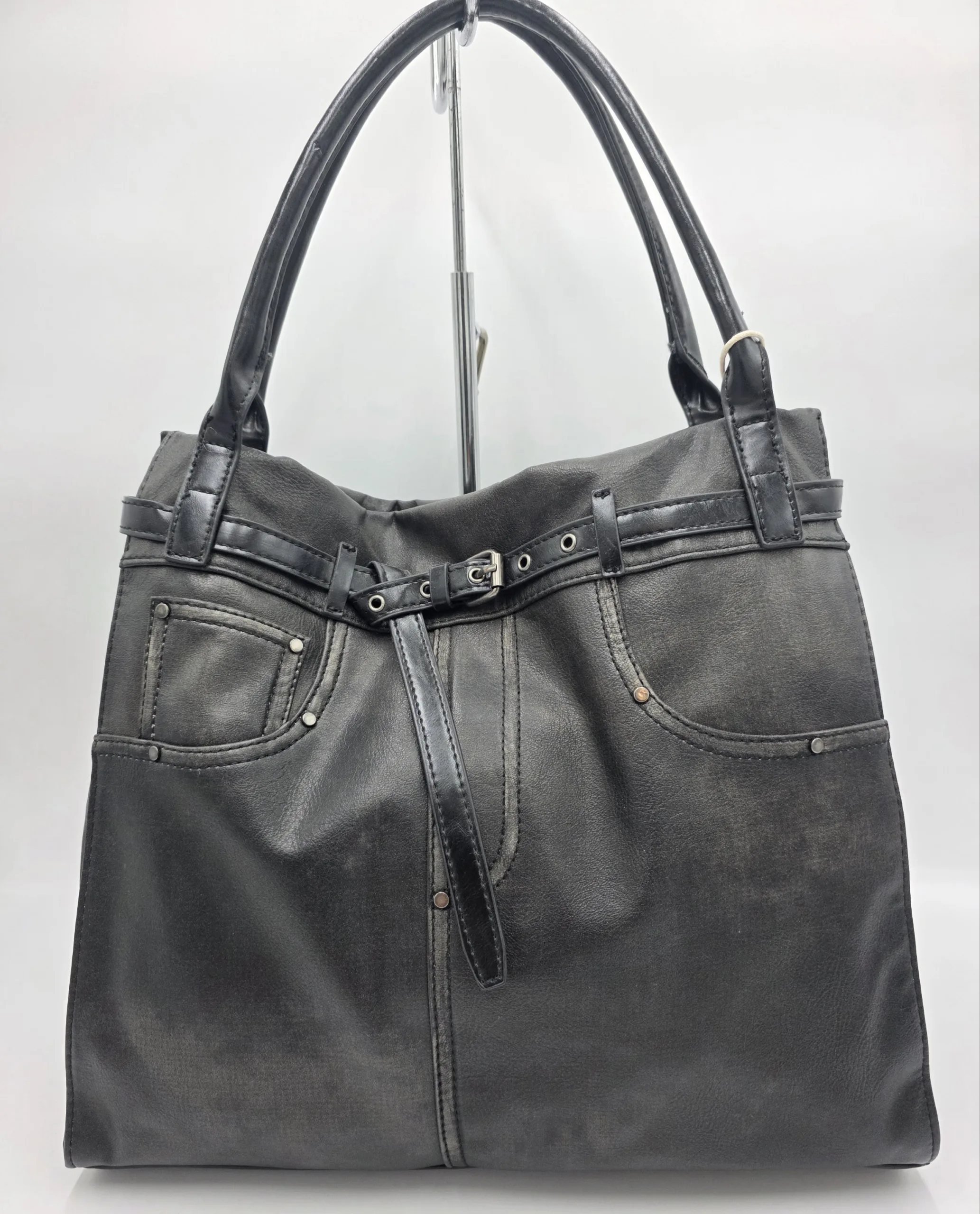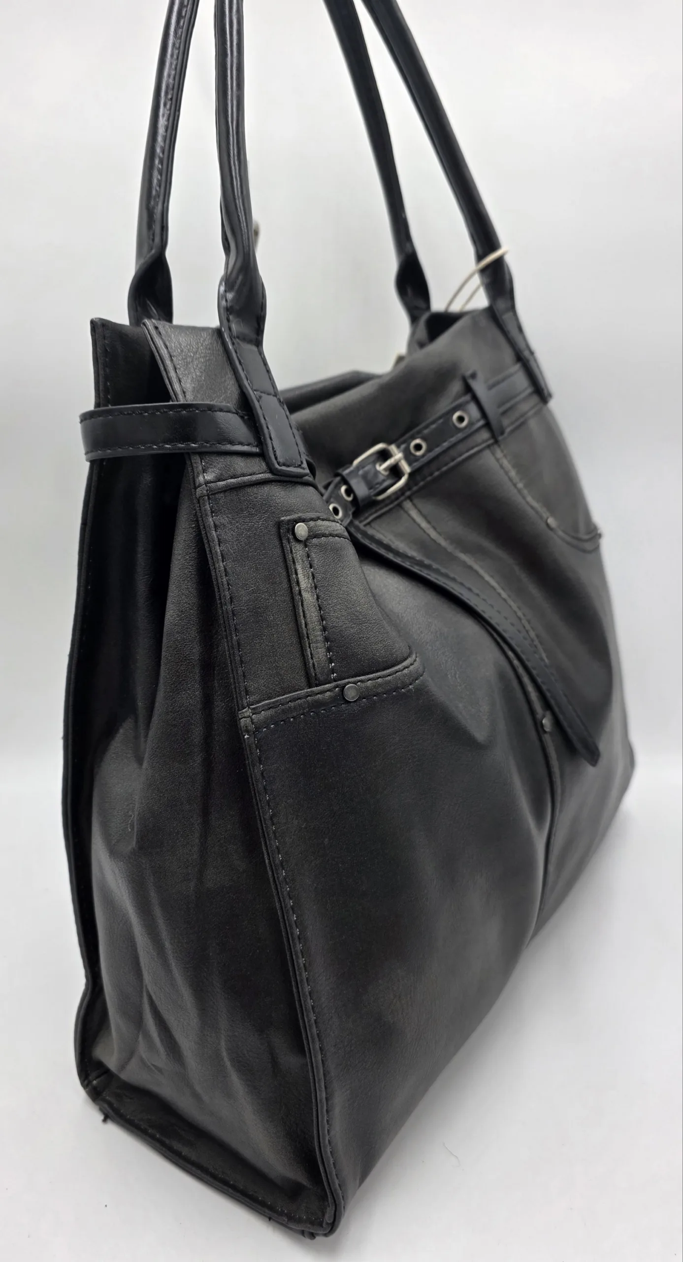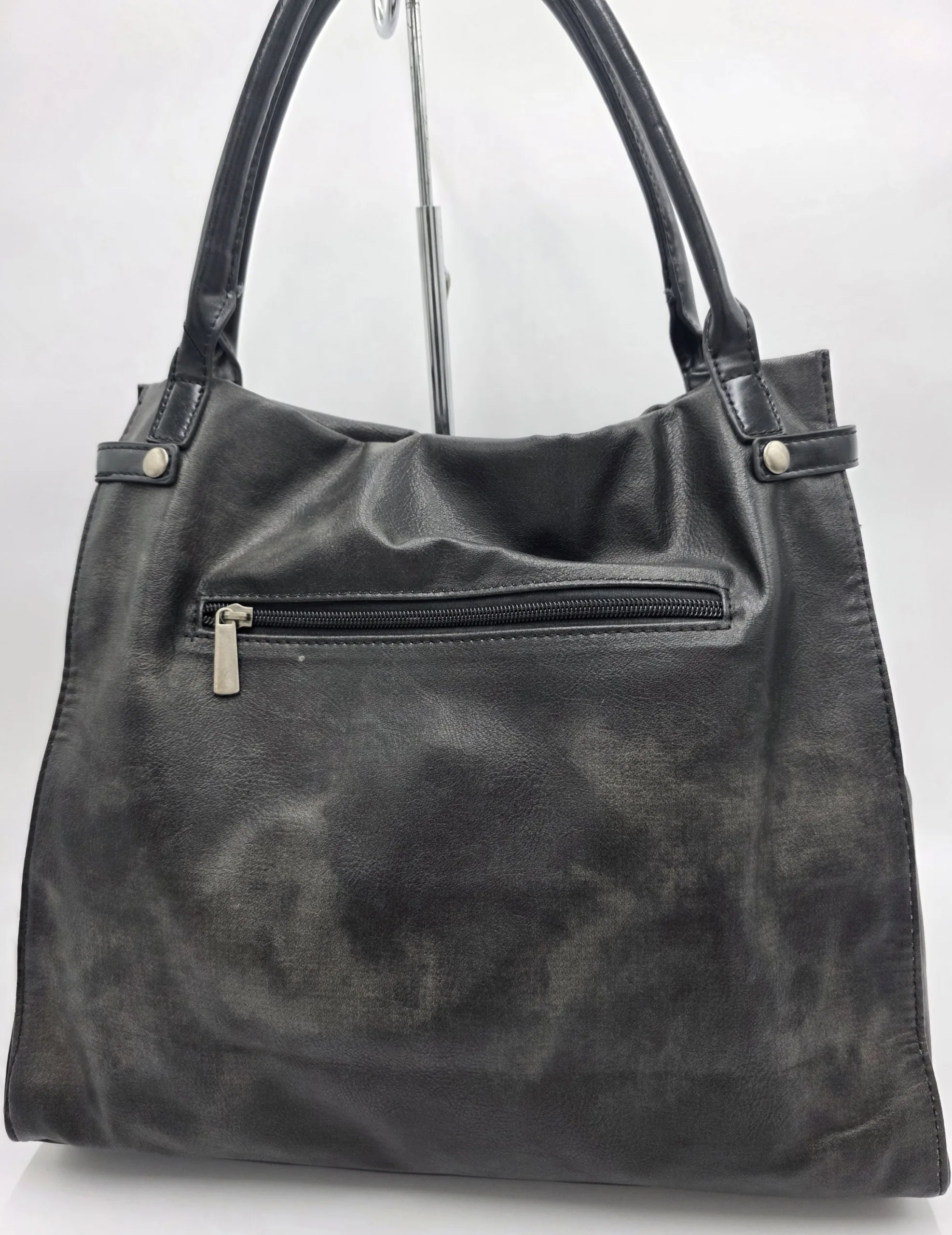 Чанта от еко кожа в опушен цвят с две дръжки 45см с допълнителна дълга регулираща се дръжка, отпред с декоративни джобове, заден външен джоб с цип, вътре със средна преграда с цип, вътрешен джоб с цип и допълнителни джобове за телефон. Ширина 38см,височина 32см,дъно 38см/12см.